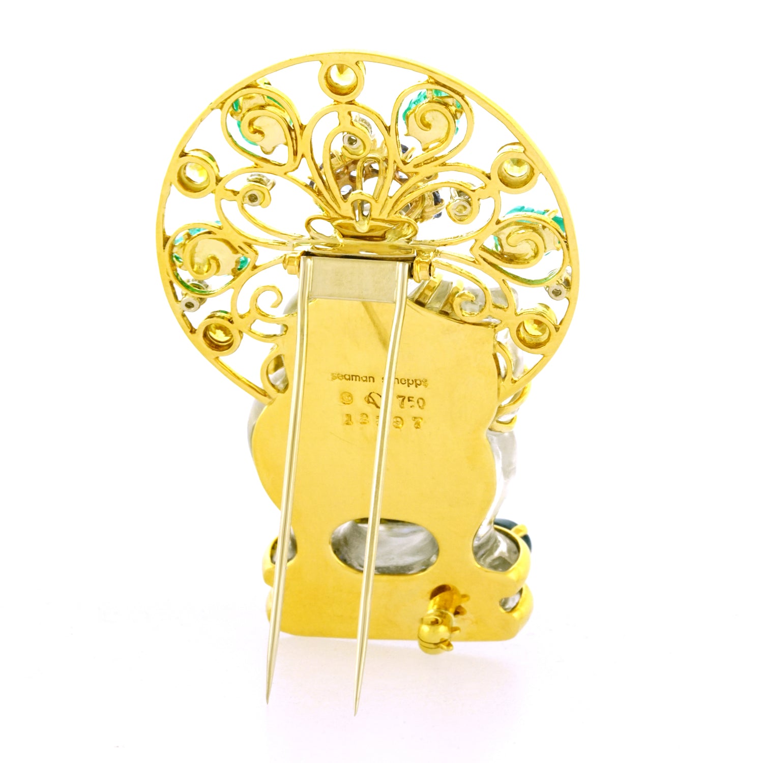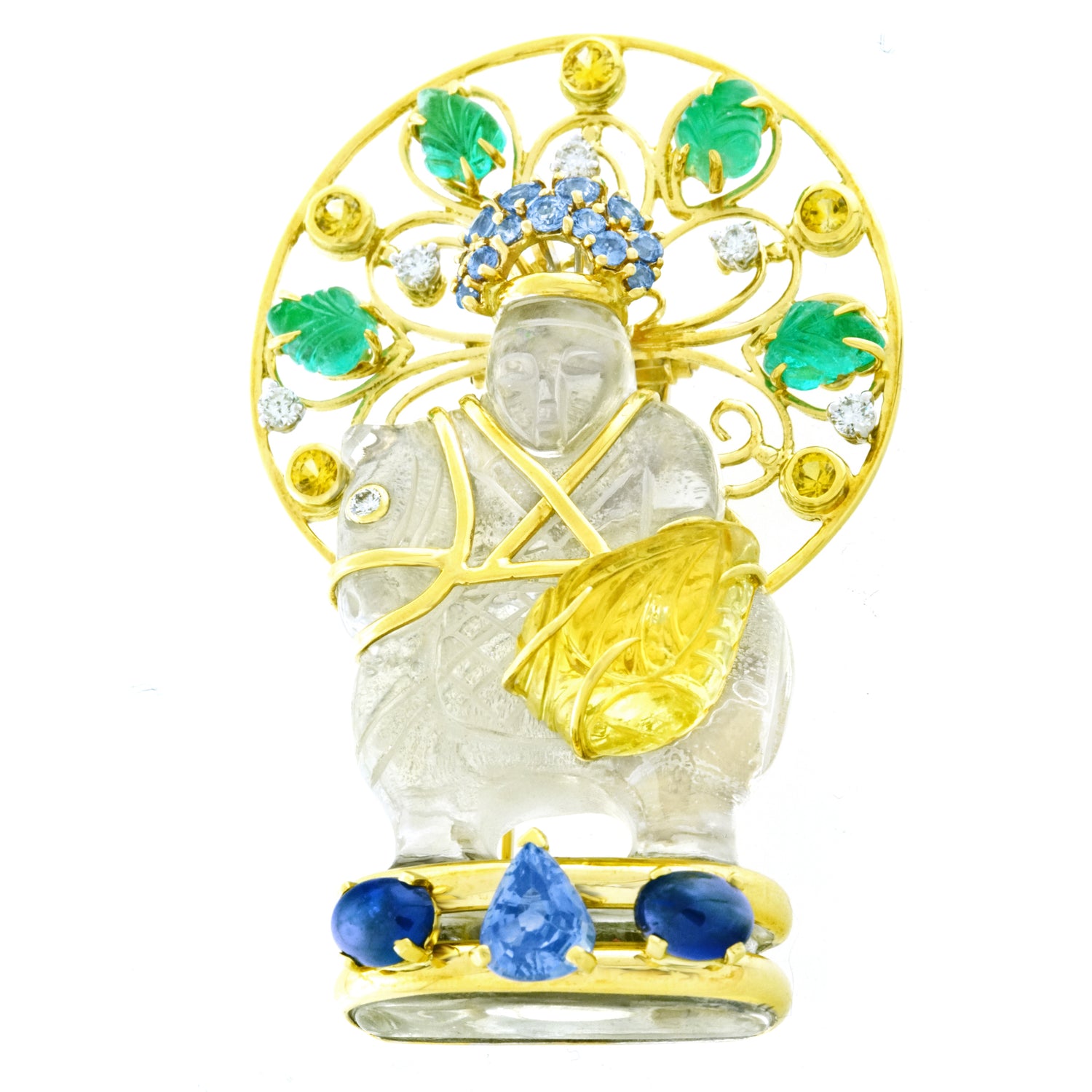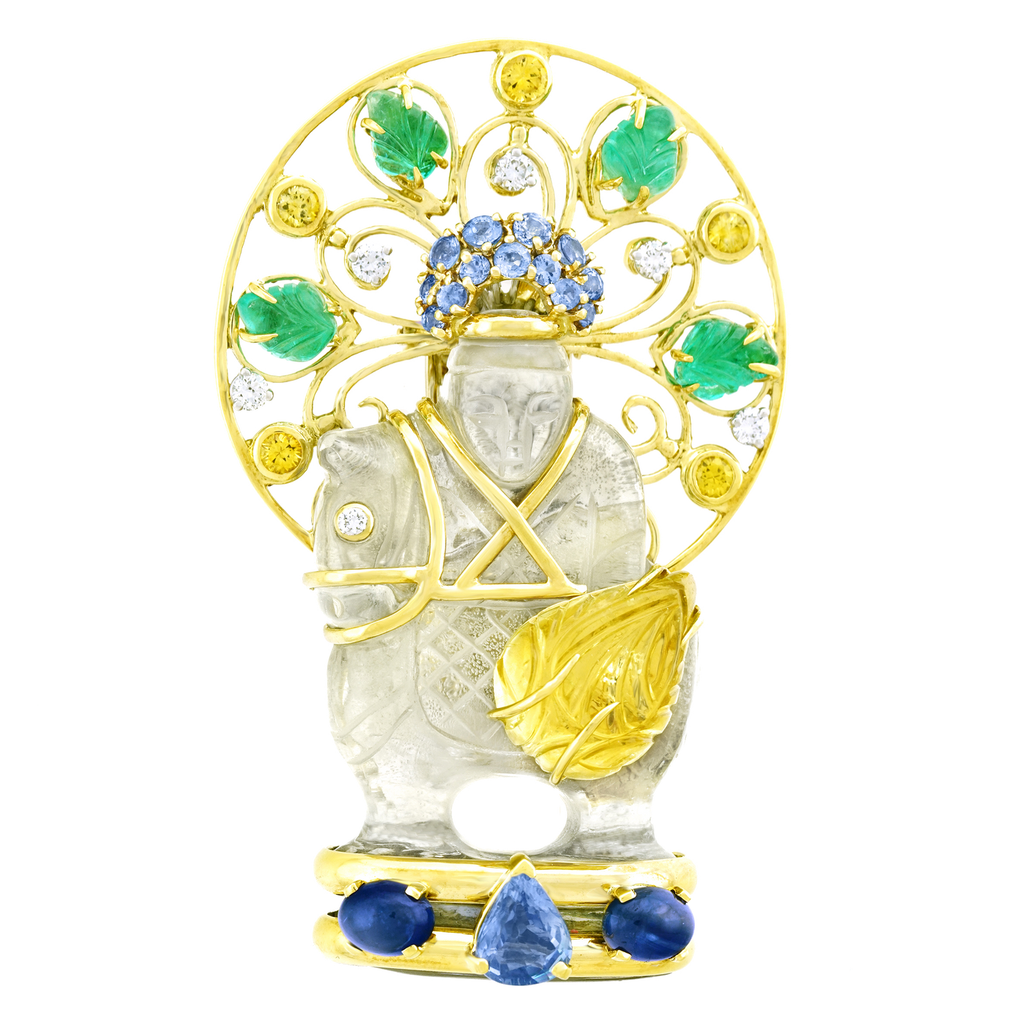 Circa 1960s, 18k, by Seaman Schepps, American. At Seaman Schepps, exotic is iconic. This particularly gorgeous chessman brooch is set with larger sapphires and emeralds as well as brilliant white diamonds. The body is rock crystal and the form is extremely full-blown. Vintage examples like this one are much finer than current production. Excellent condition.