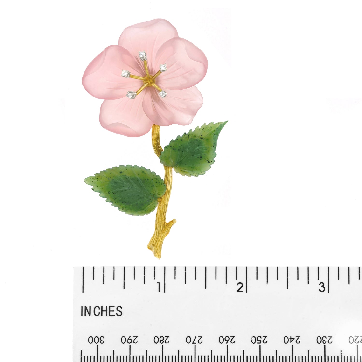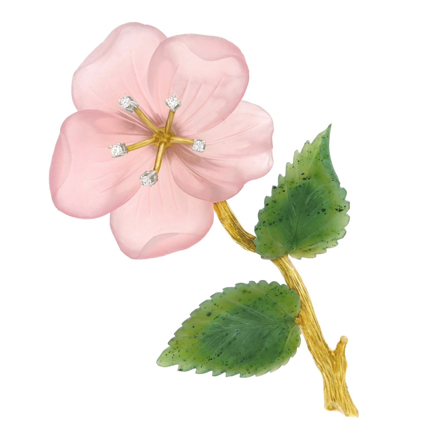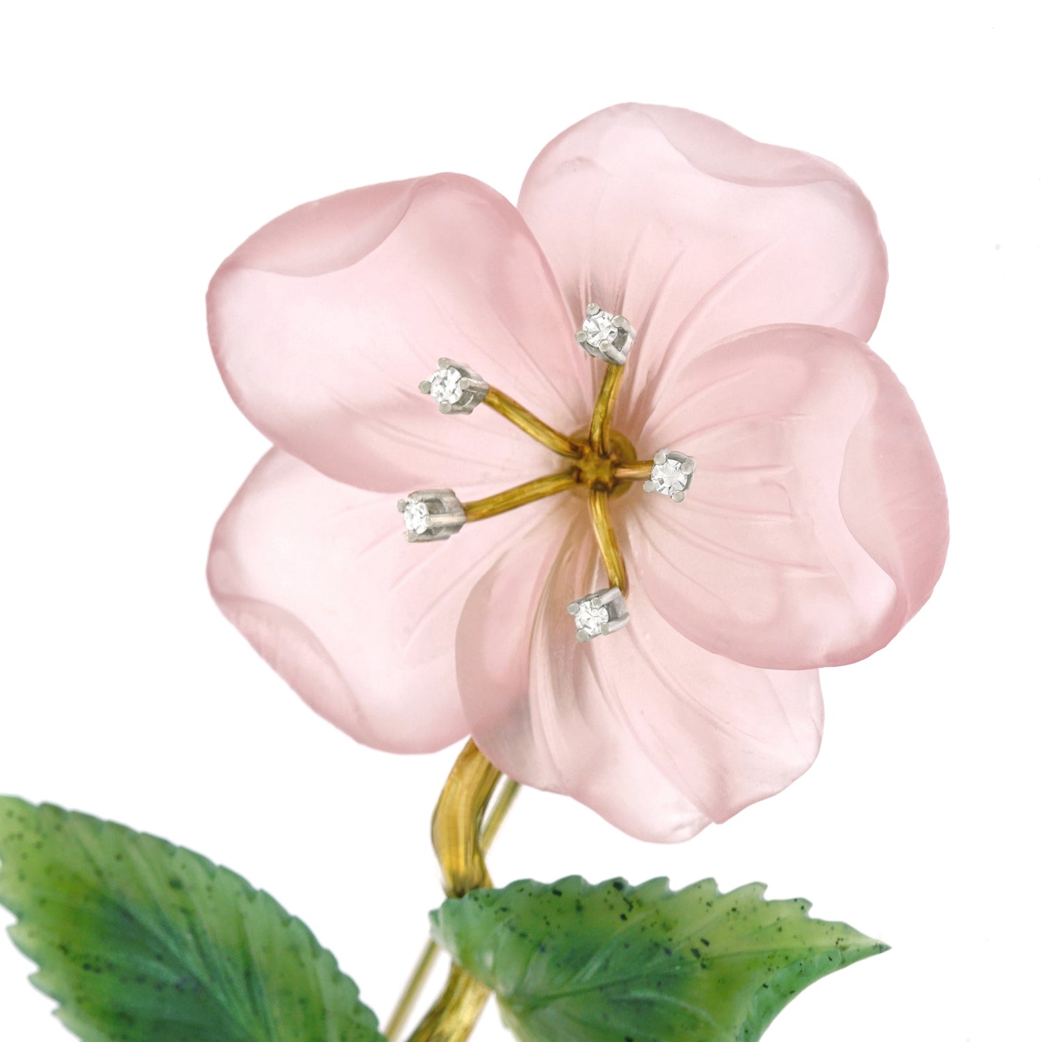Circa 1950s, 14k, Swiss. This delicately colored rose quartz flower cheerily opens in full bloom, enhanced by five brilliant diamonds. Lush jade leaves and a textured gold stem complete the charming picture. Fine quality stone-cutting and meticulous construction are found throughout. Excellent condition.