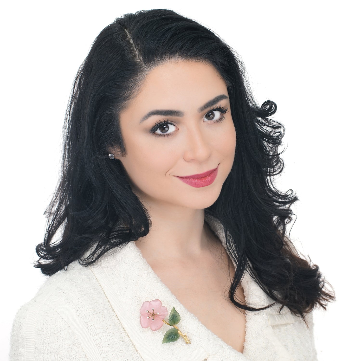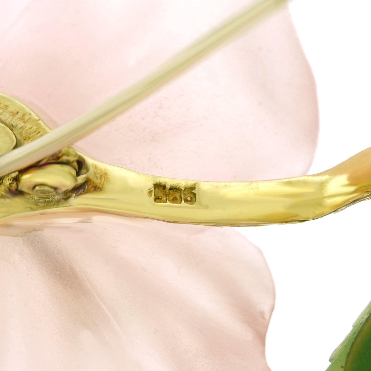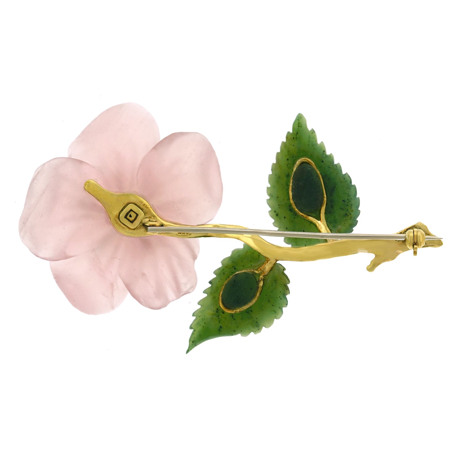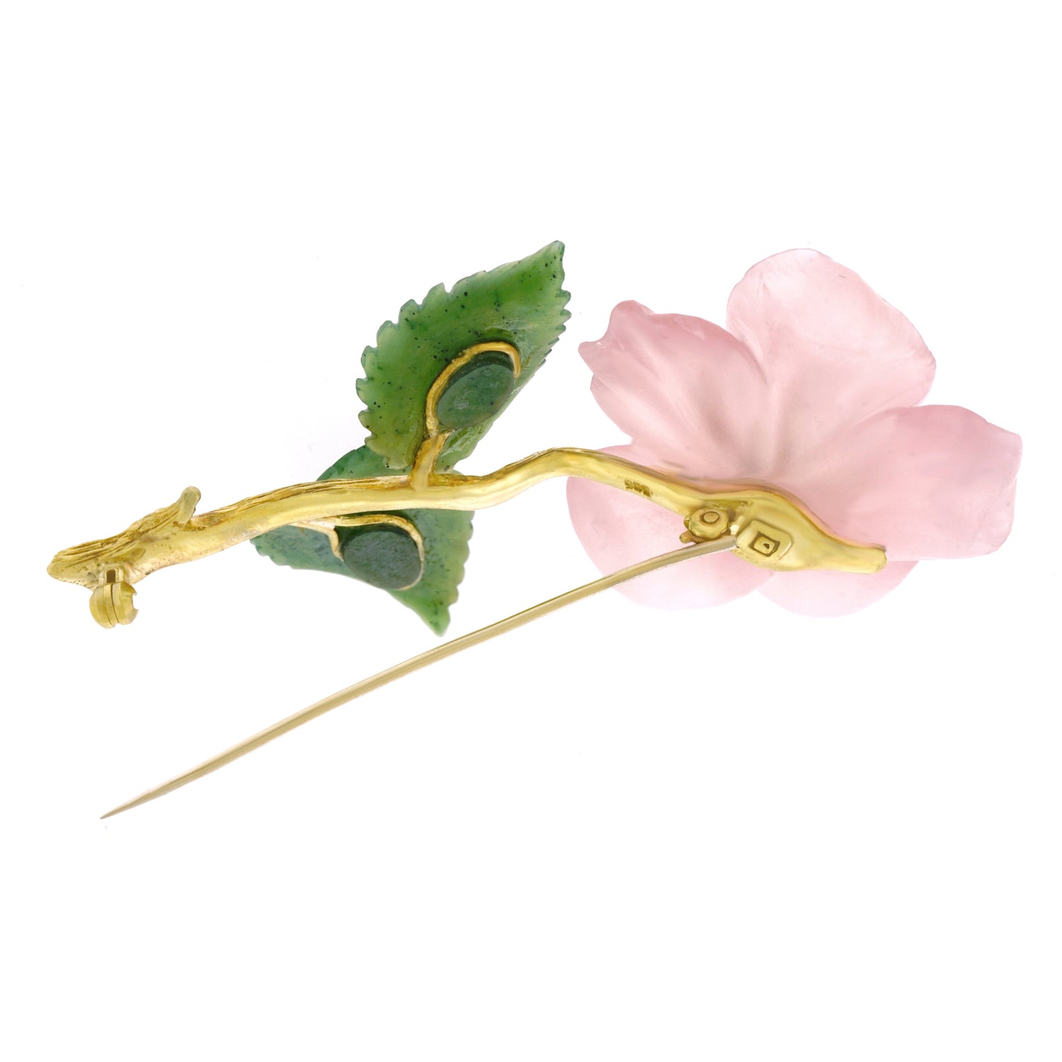 Circa 1950s, 14k, Swiss. This delicately colored rose quartz flower cheerily opens in full bloom, enhanced by five brilliant diamonds. Lush jade leaves and a textured gold stem complete the charming picture. Fine quality stone-cutting and meticulous construction are found throughout. Excellent condition.