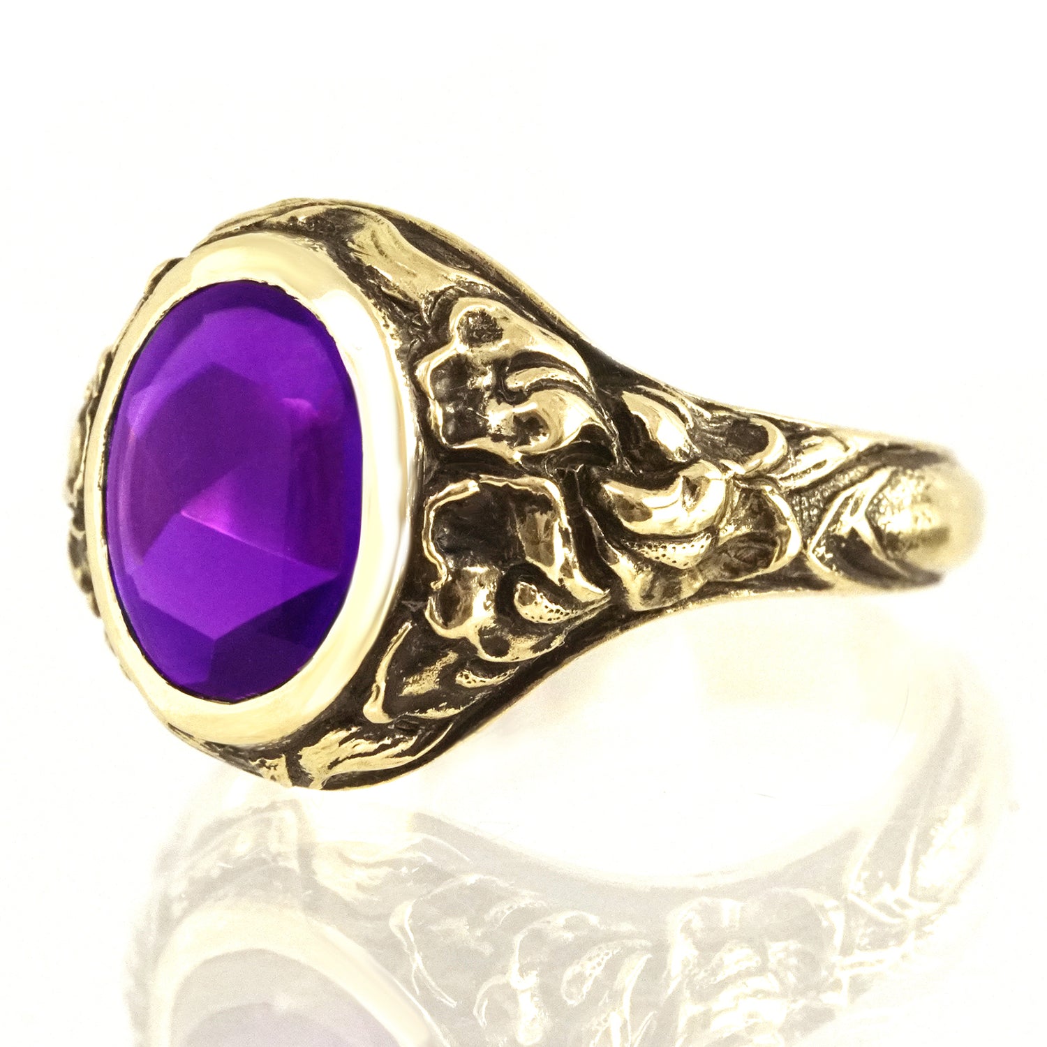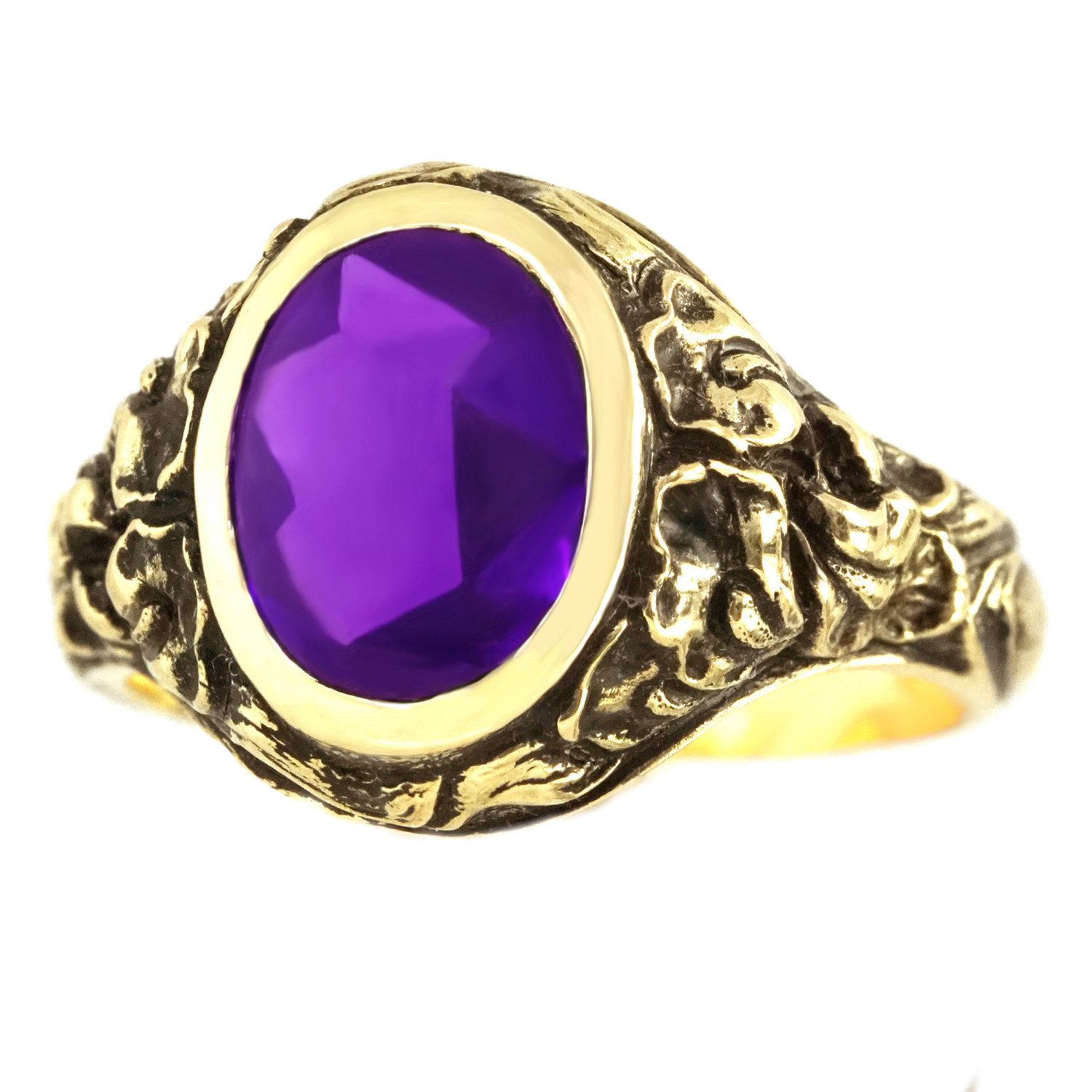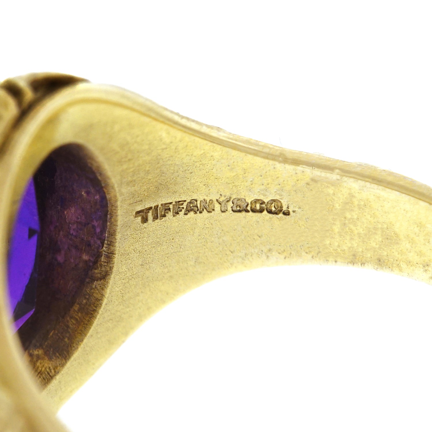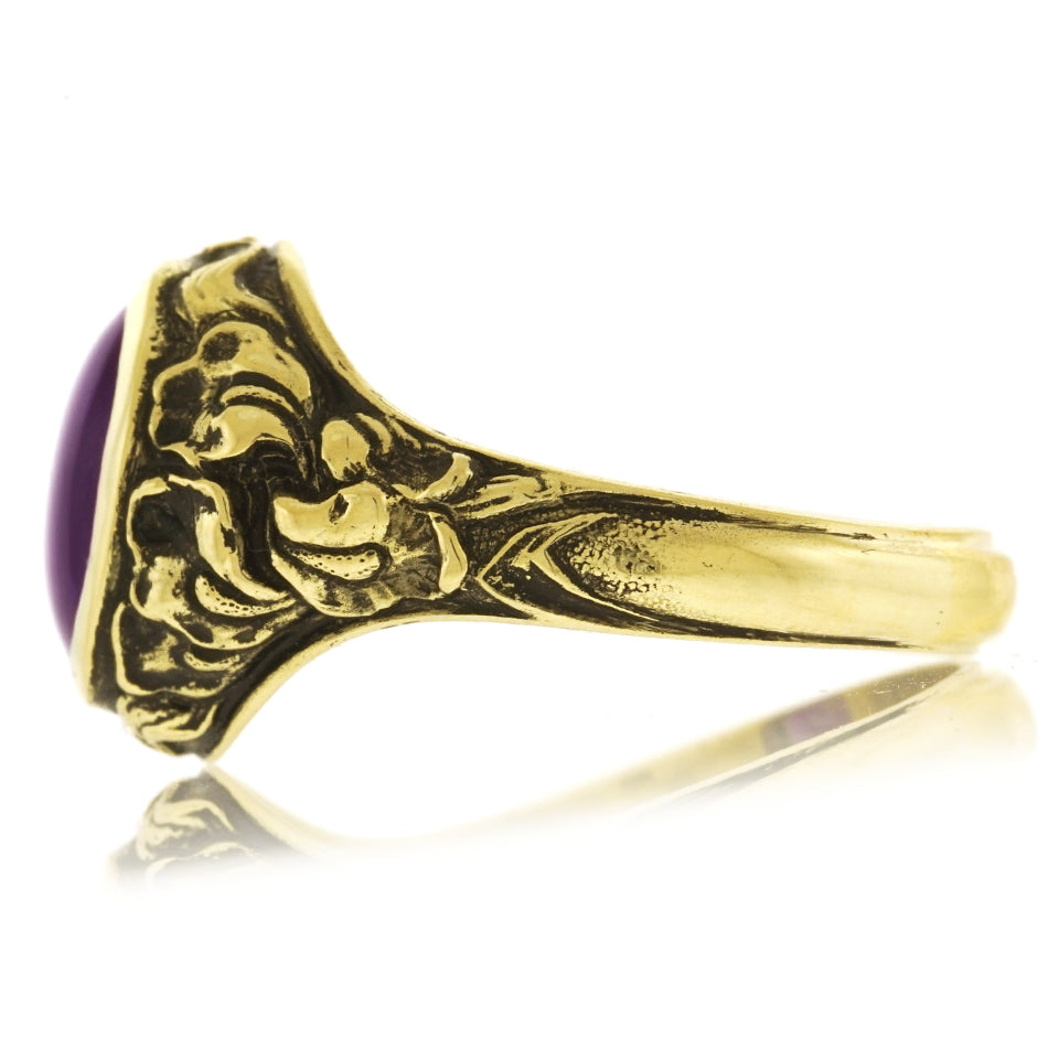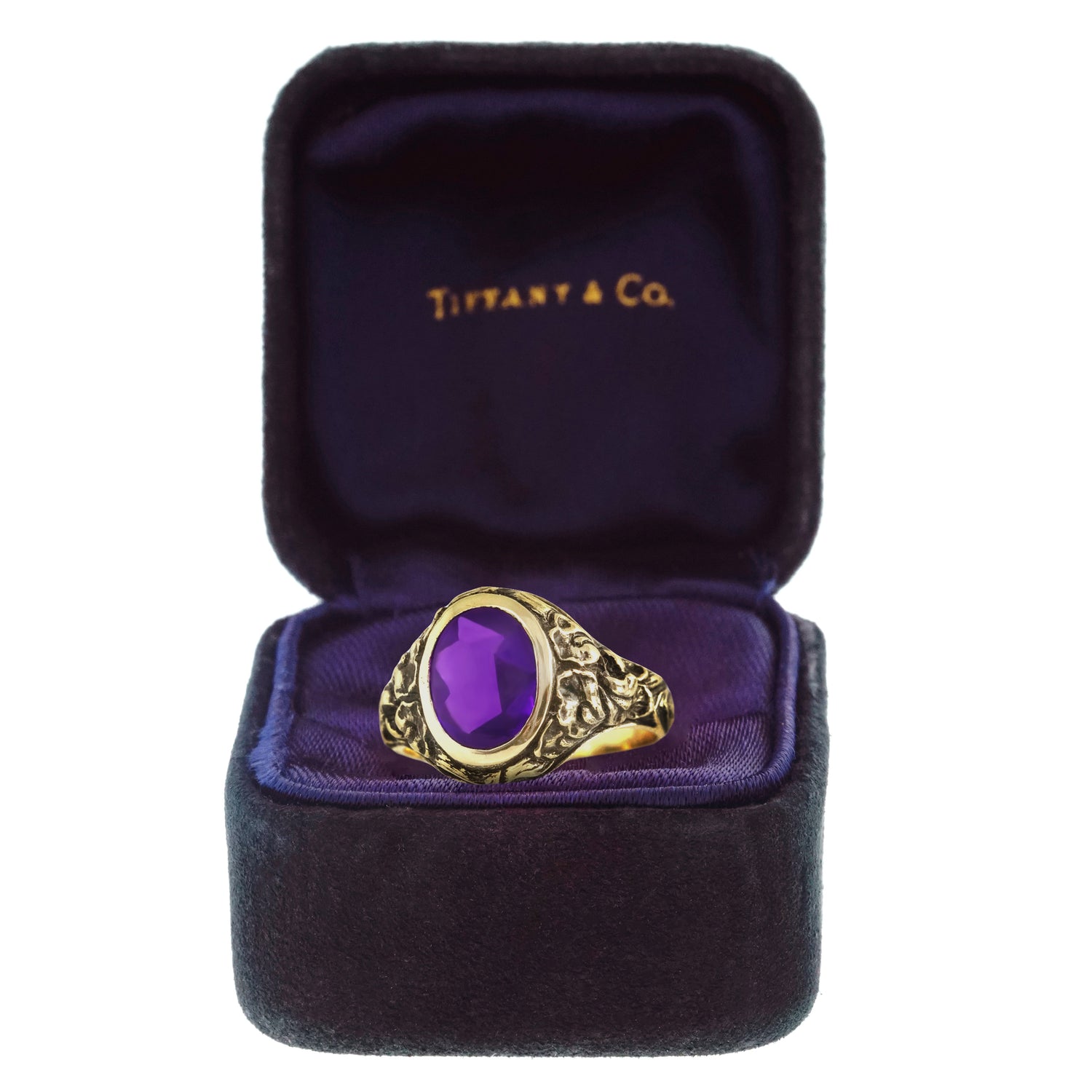 Circa 1924, 14k, by Tiffany and Co., New York, New York. This antique Arts and Crafts motif ring features a vibrant amethyst underscored by intricate gold work in a foliate motif. Superbly made by Tiffany and Co. in the 1920s, its vintage-chic look is the real deal; fabulously, fashionably authentic. Excellent condition.