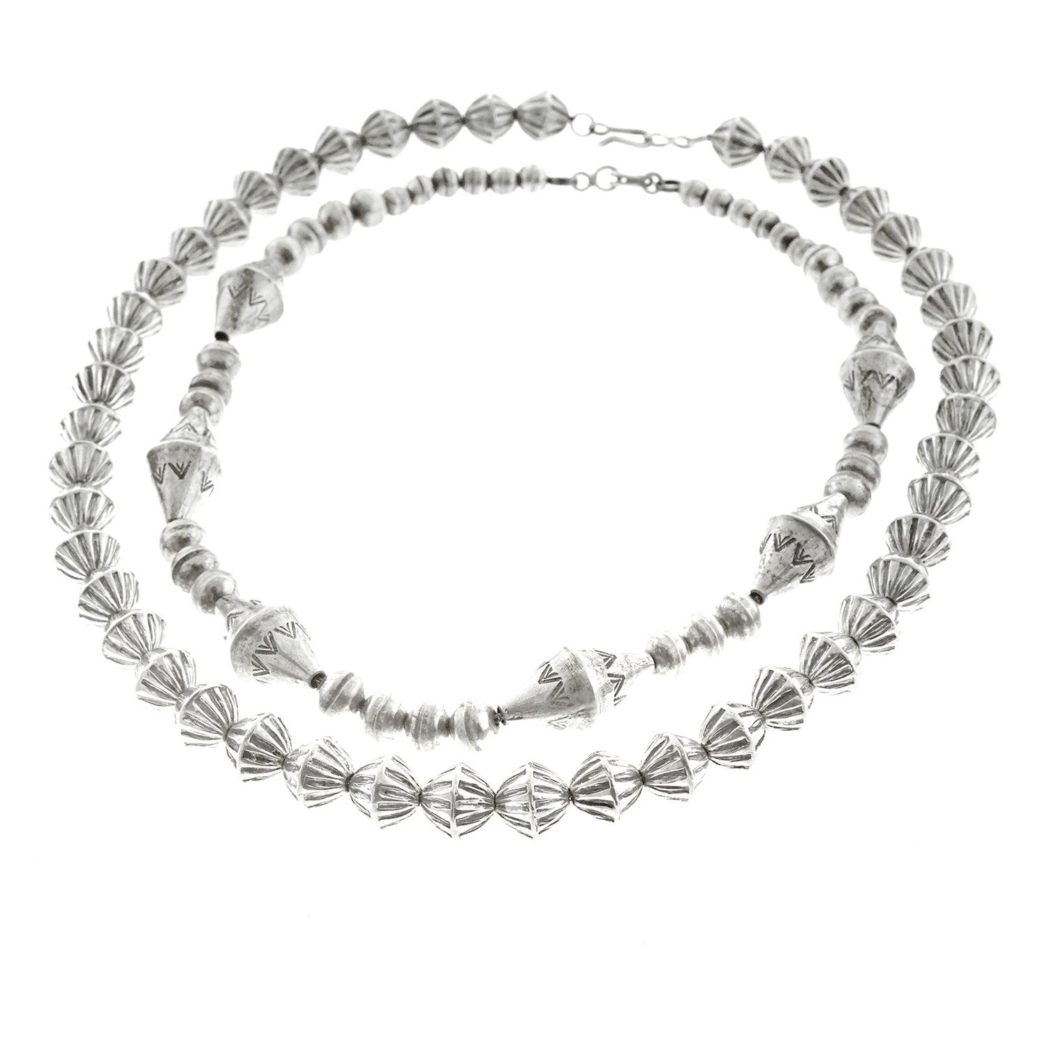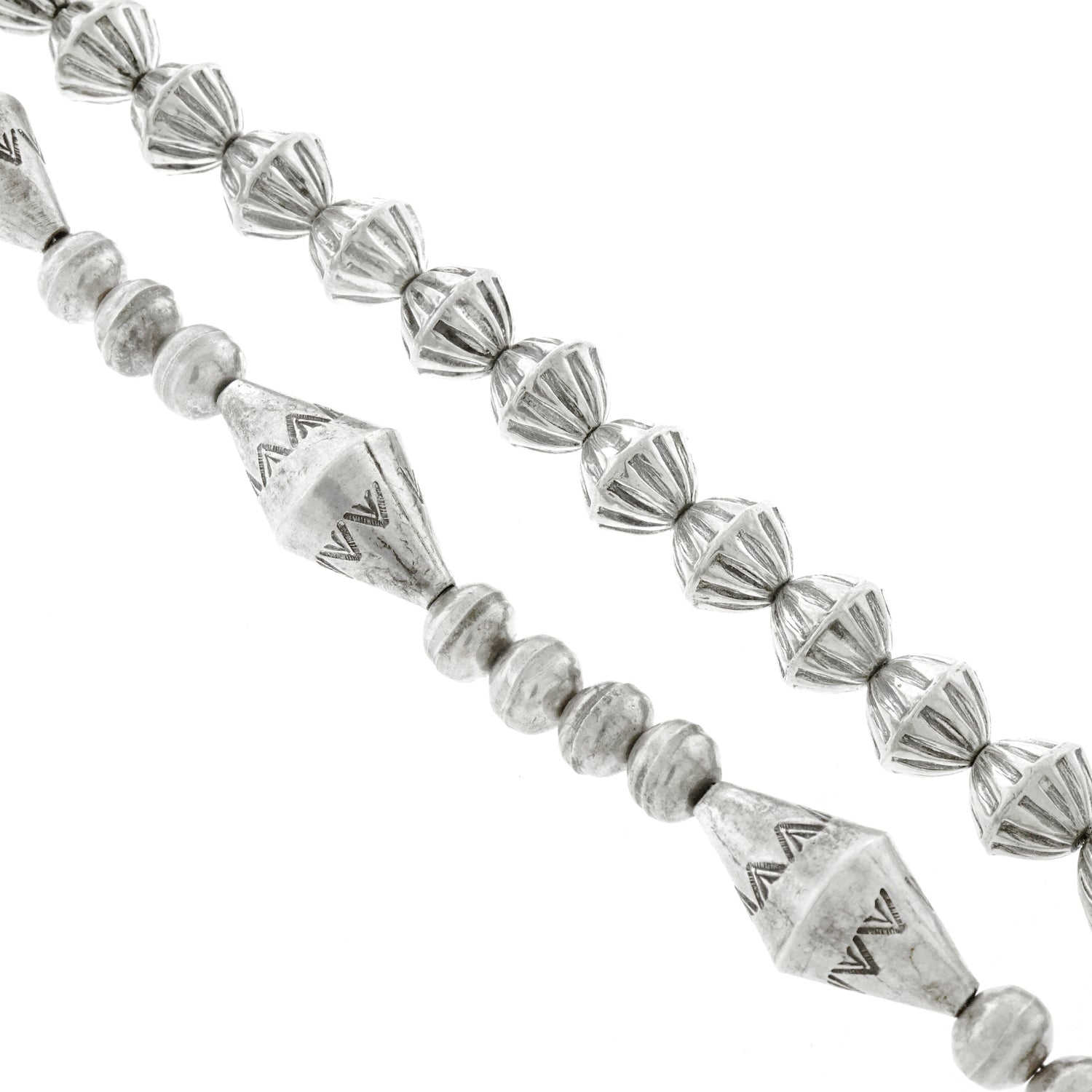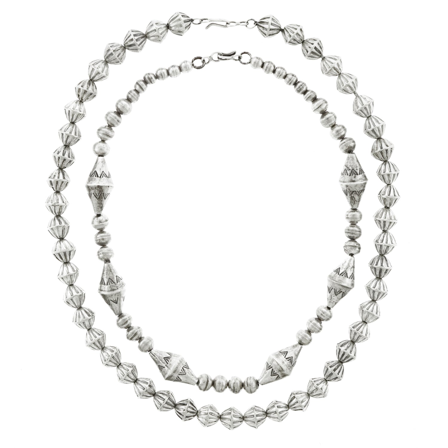 Circa 1950s, Sterling, Navajo, American. This pair of Navajo sterling necklaces features concho-stamped round and bicone-shaped beads. Their larger size, heavy construction, and superb design make them flawless examples of the casual chic that is Navajo jewelry. Well made, these necklaces are in excellent condition.
