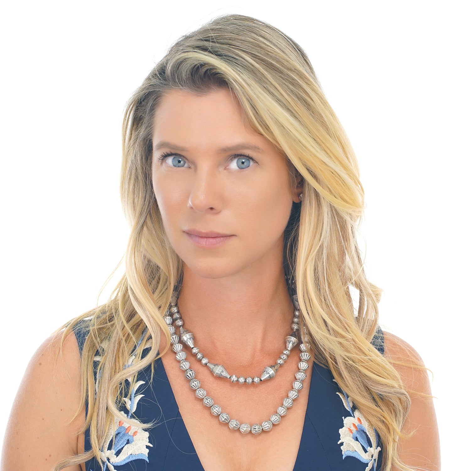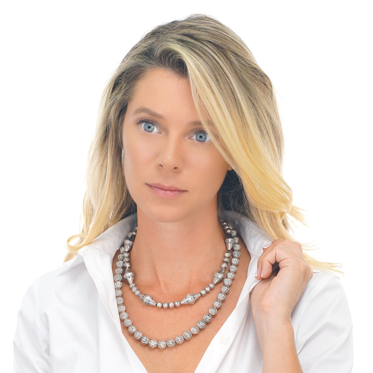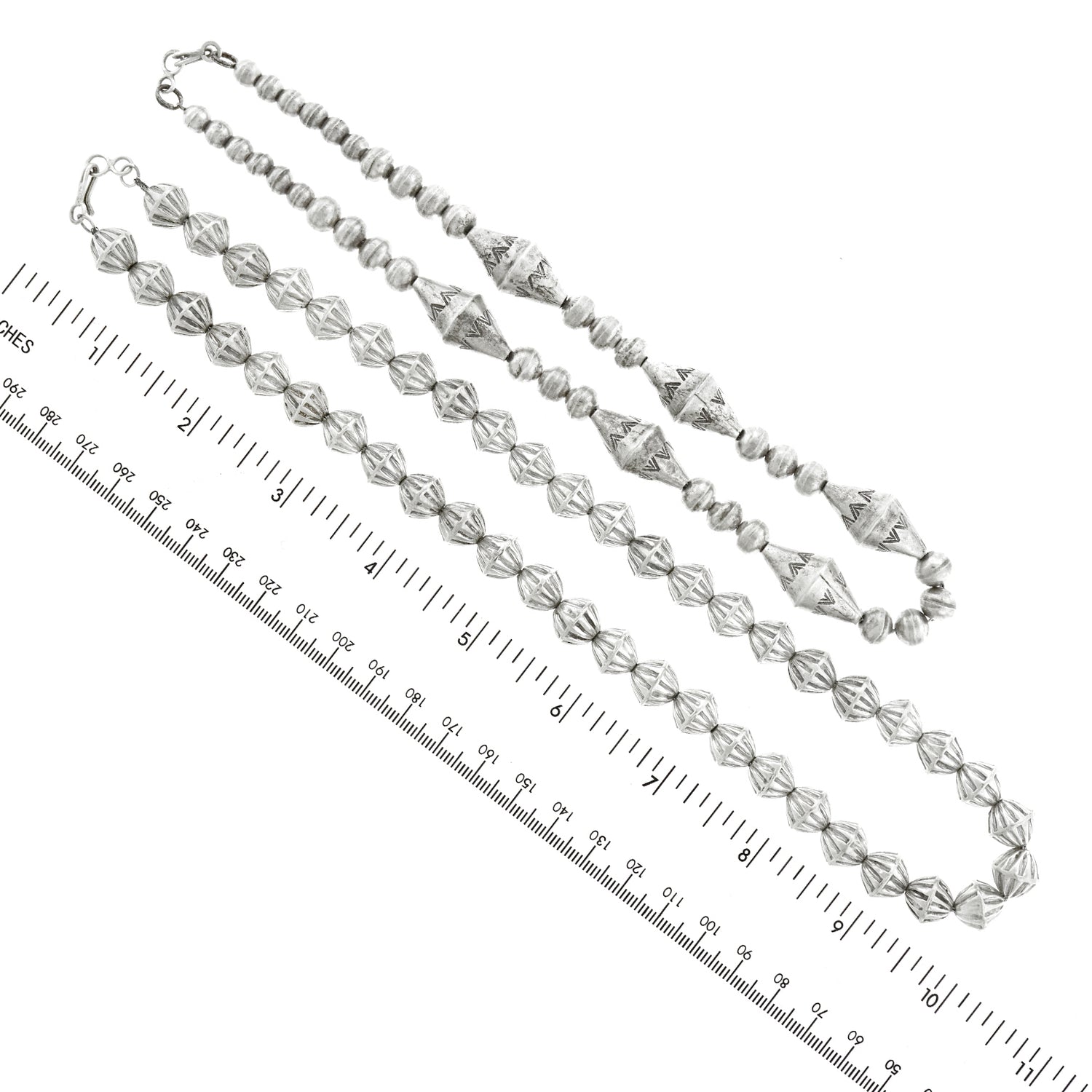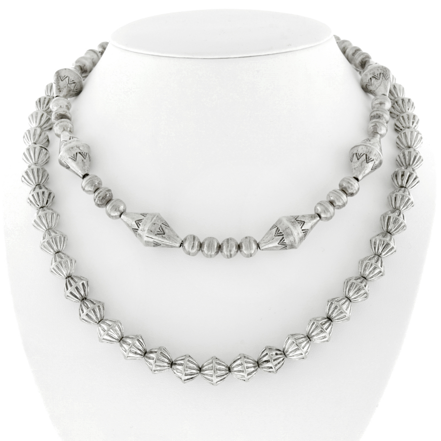 Circa 1950s, Sterling, Navajo, American. This pair of Navajo sterling necklaces features concho-stamped round and bicone-shaped beads. Their larger size, heavy construction, and superb design make them flawless examples of the casual chic that is Navajo jewelry. Well made, these necklaces are in excellent condition.