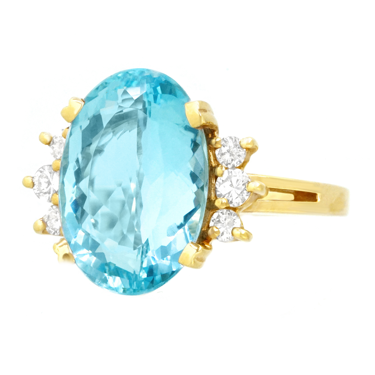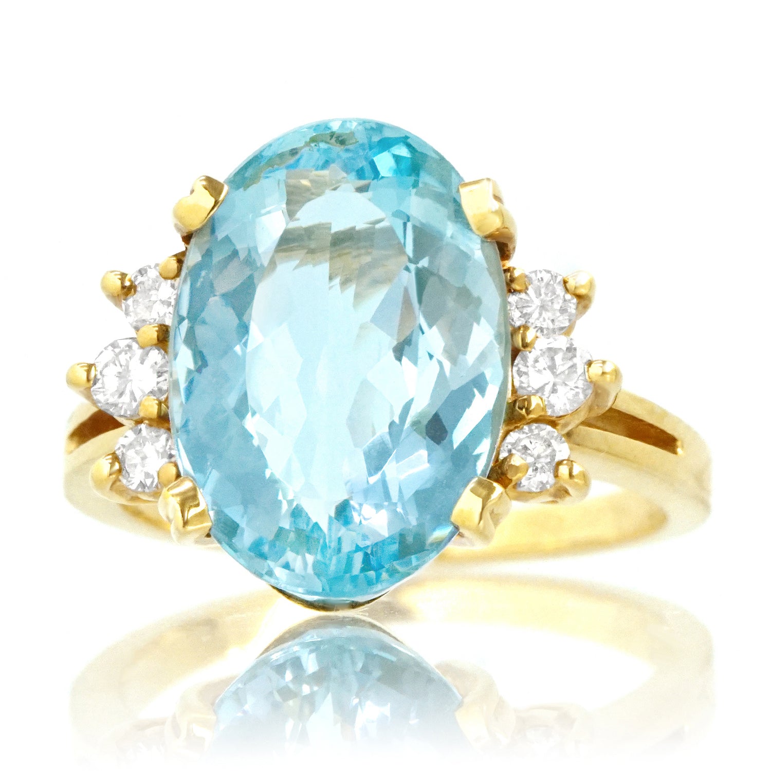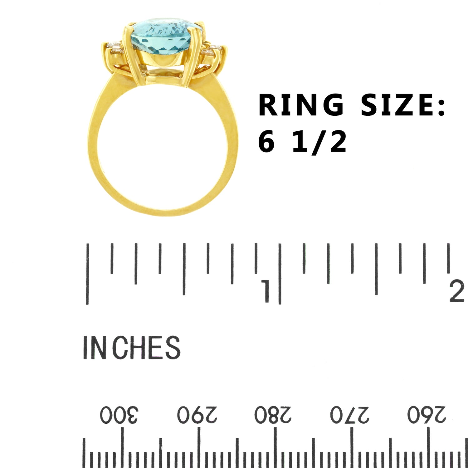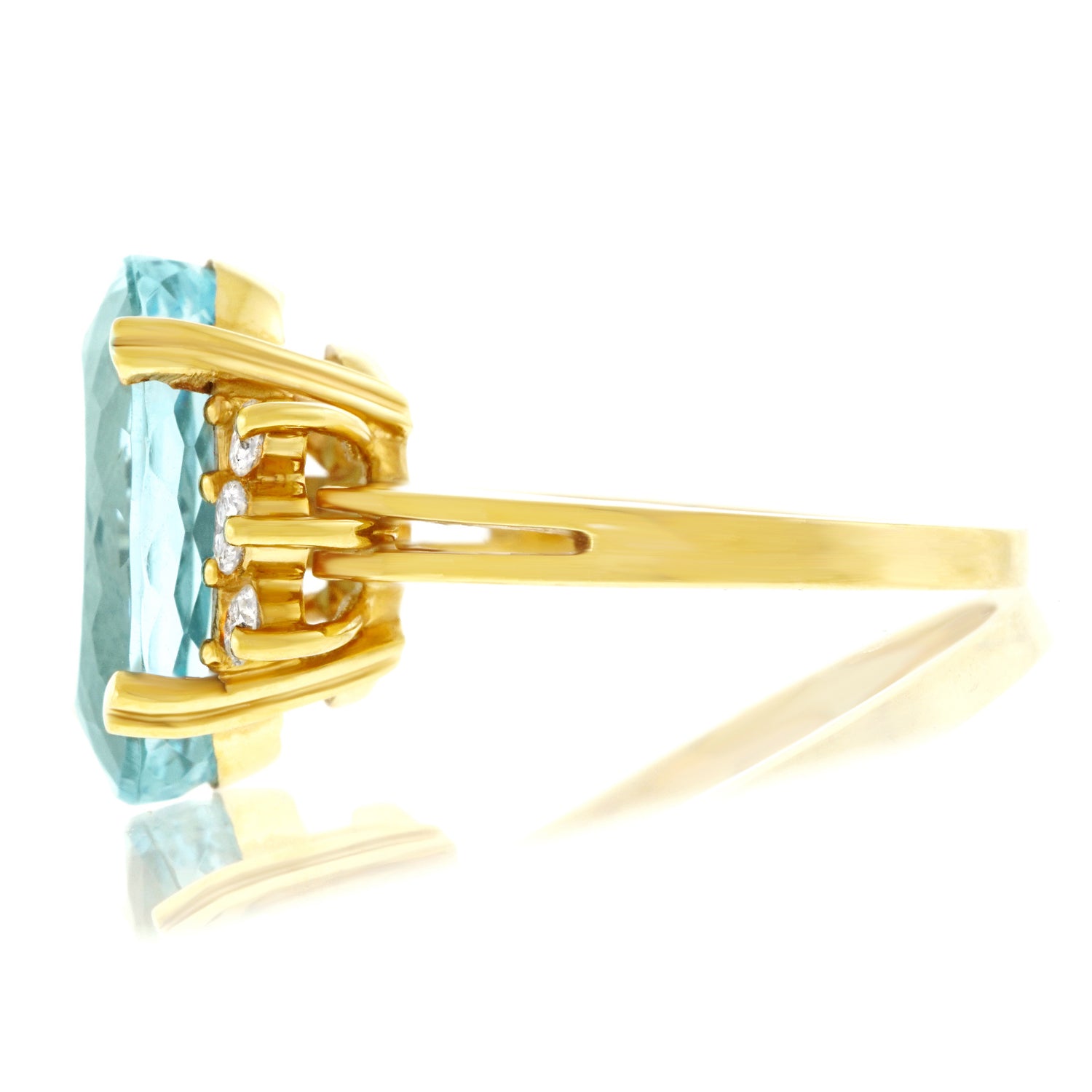 Circa 1950s, 14k, American. Set with a gorgeous 6.0-carat vivid blue aquamarine accented with diamonds, this ring has a big and bold colored gemstone look that effortlessly dresses up or down. Finely fashioned, it is in excellent condition.