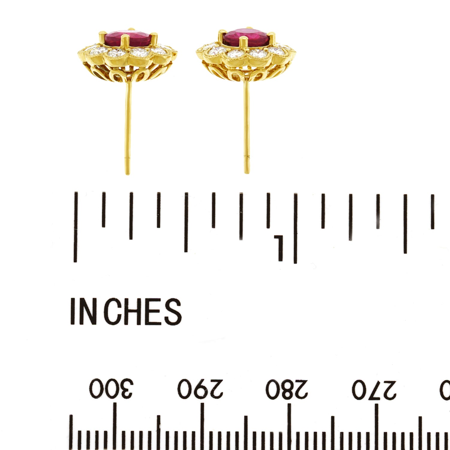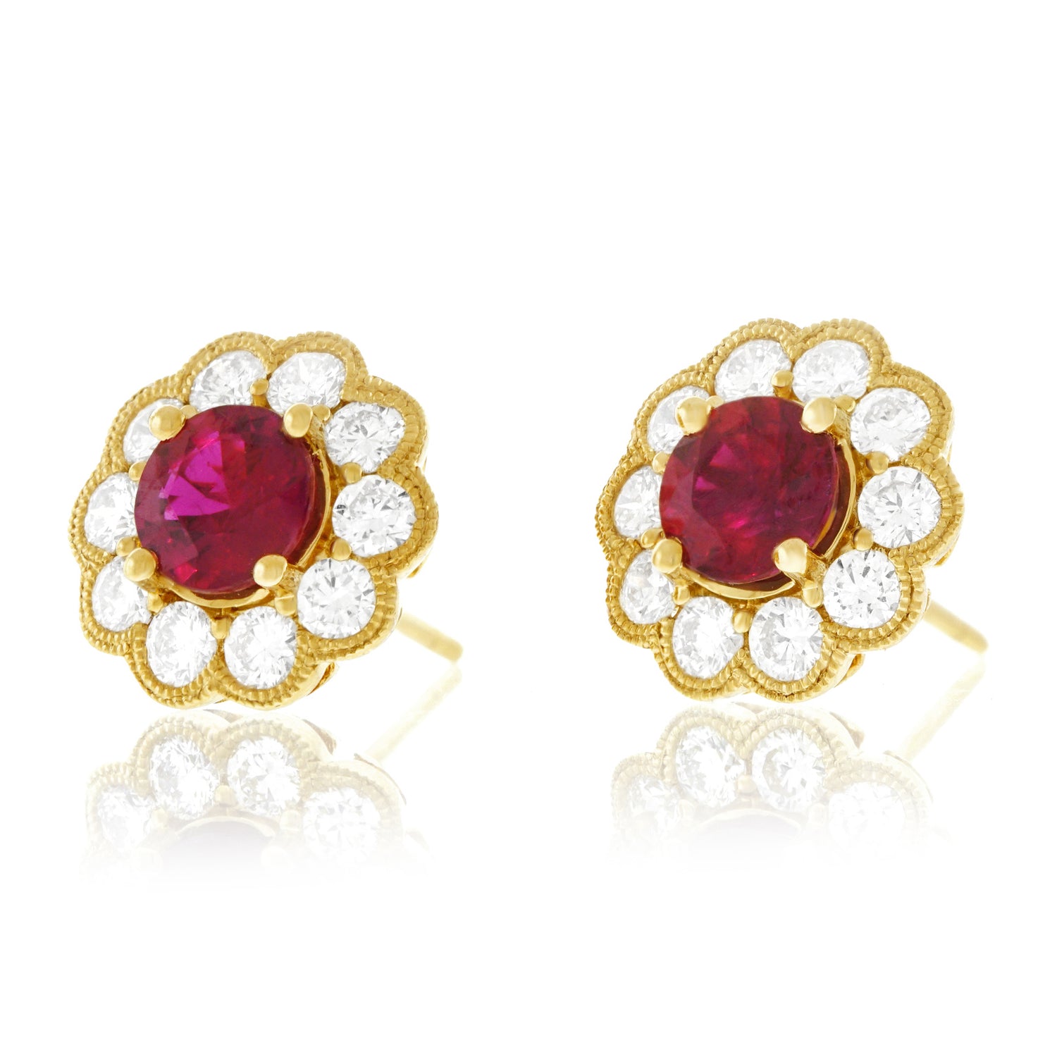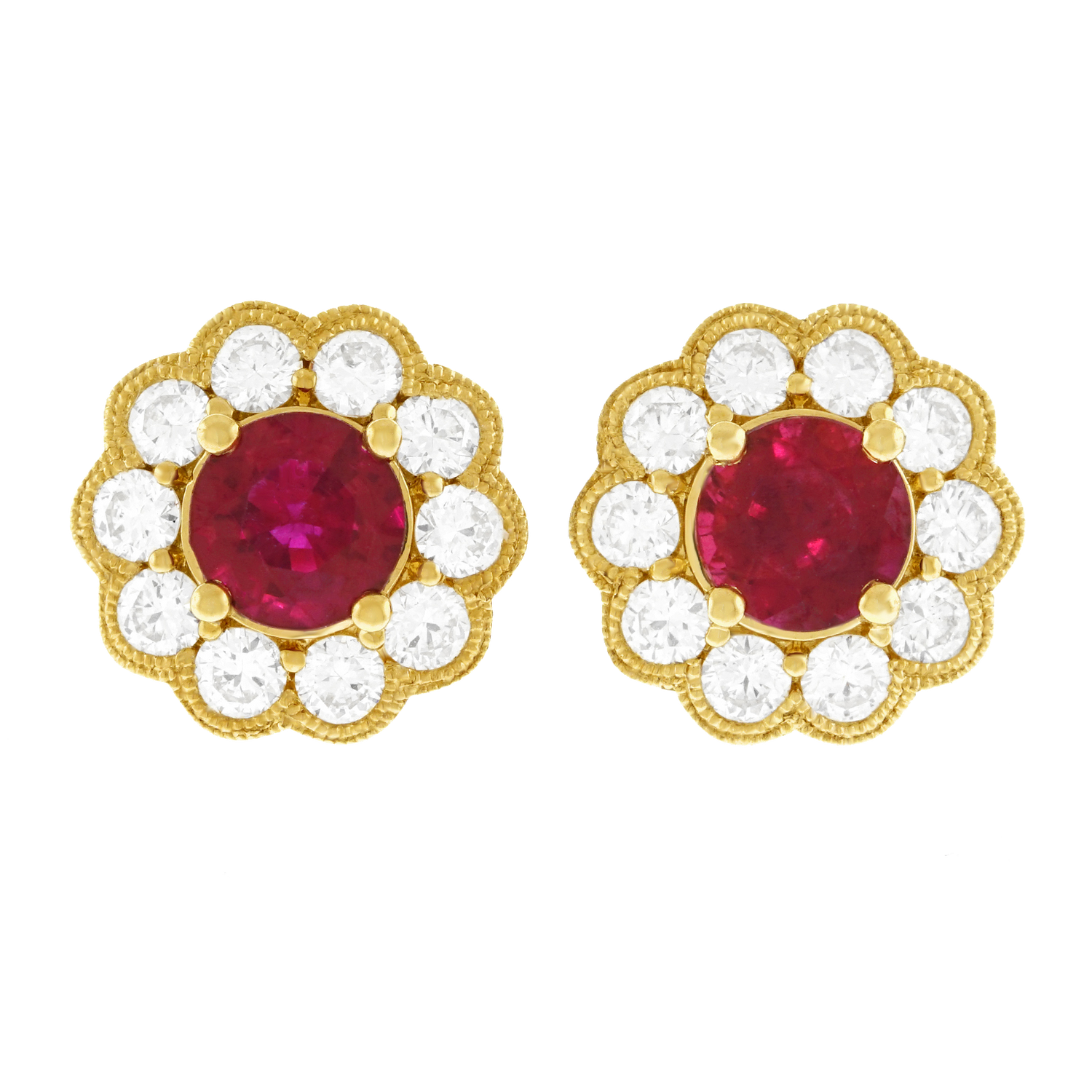 Circa 2000s, 18k, American. These earrings feature gorgeous red rubies surrounded by brilliant white diamonds set in a delicate double-beaded decorative edge. The scale and balance is delightful and the construction high quality. They are in excellent condition.