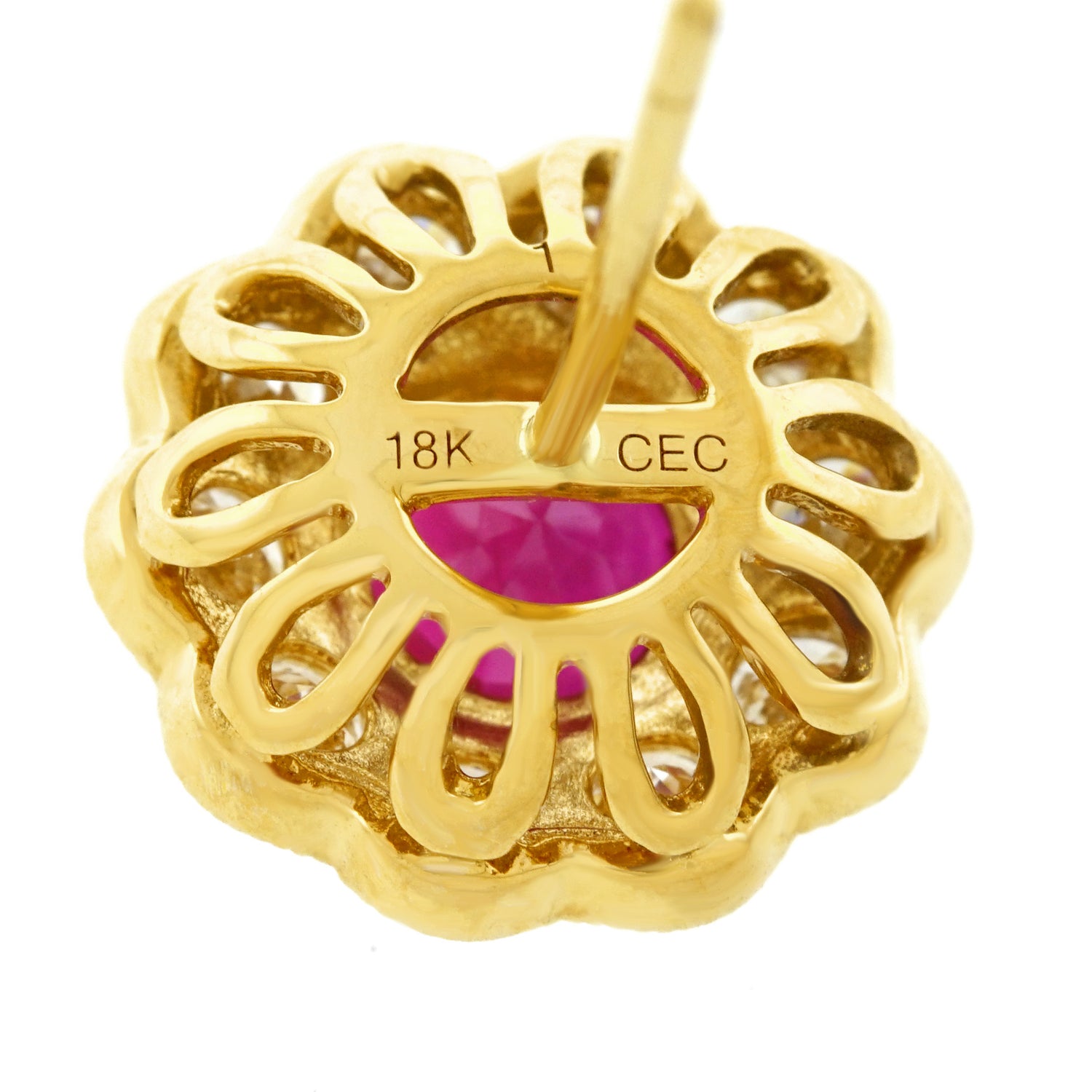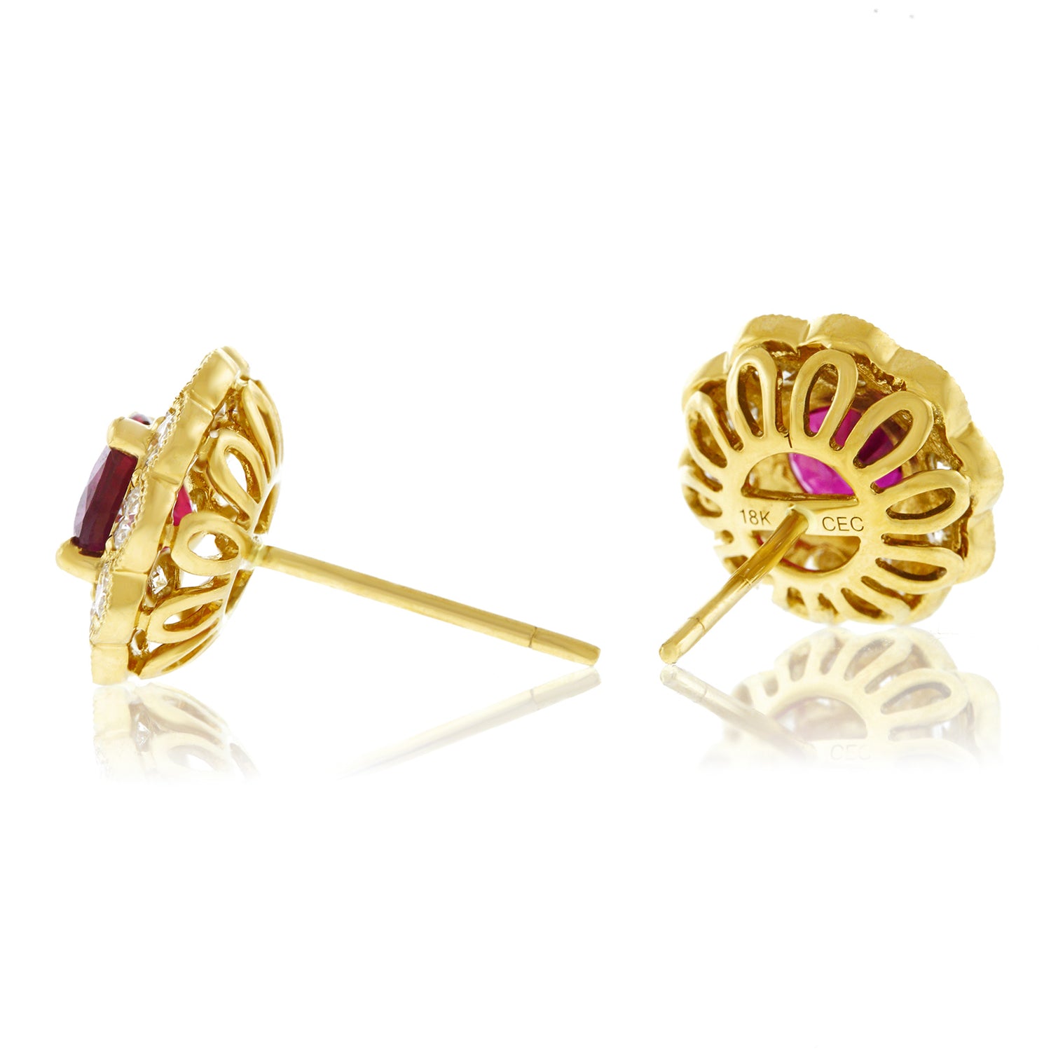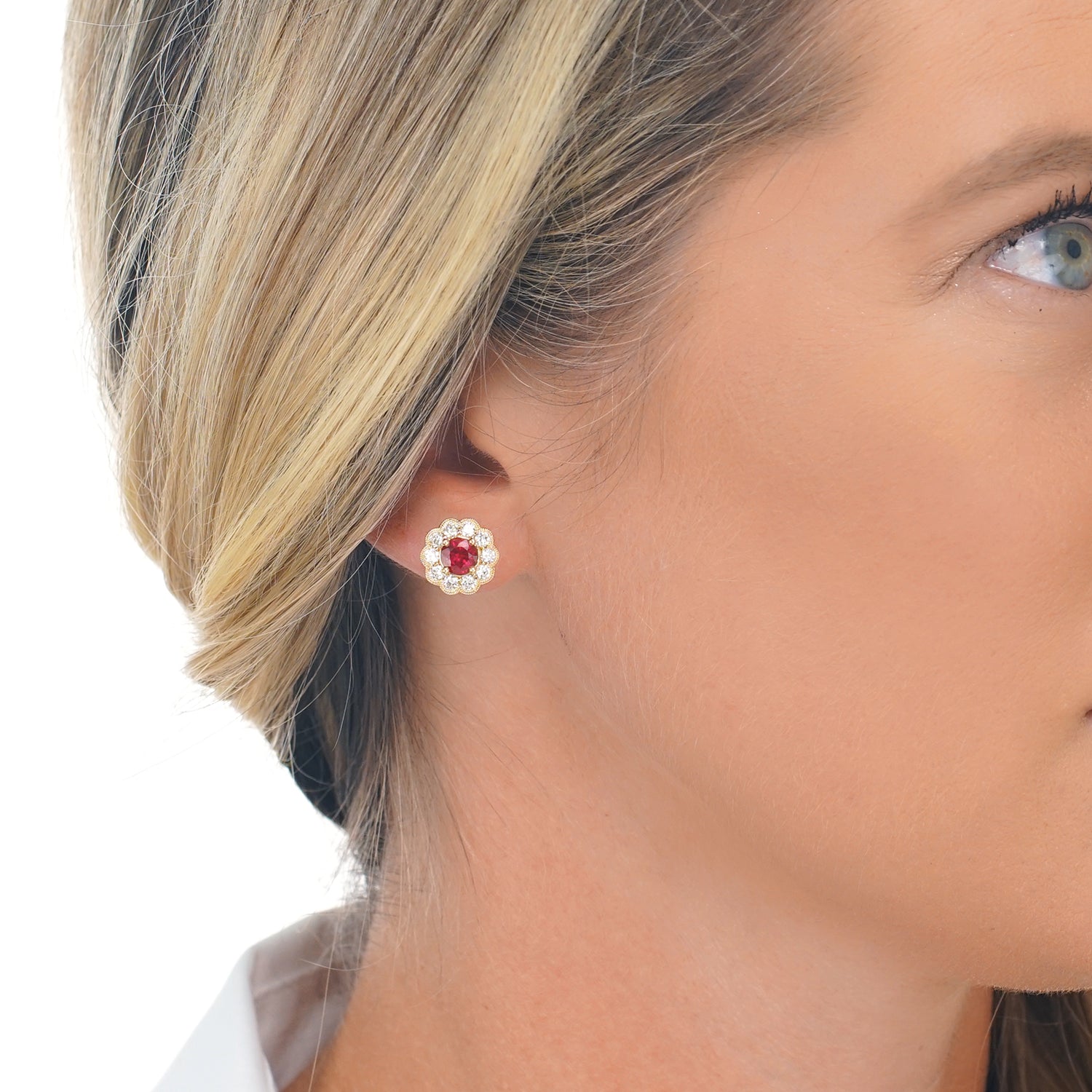 Circa 2000s, 18k, American. These earrings feature gorgeous red rubies surrounded by brilliant white diamonds set in a delicate double-beaded decorative edge. The scale and balance is delightful and the construction high quality. They are in excellent condition.