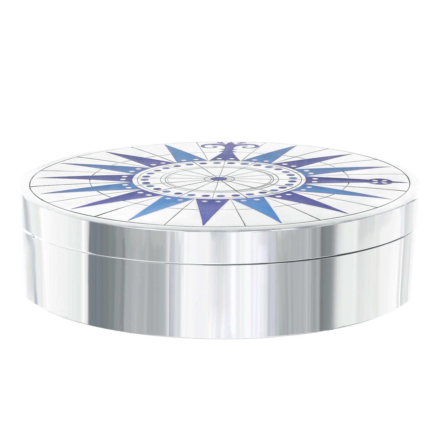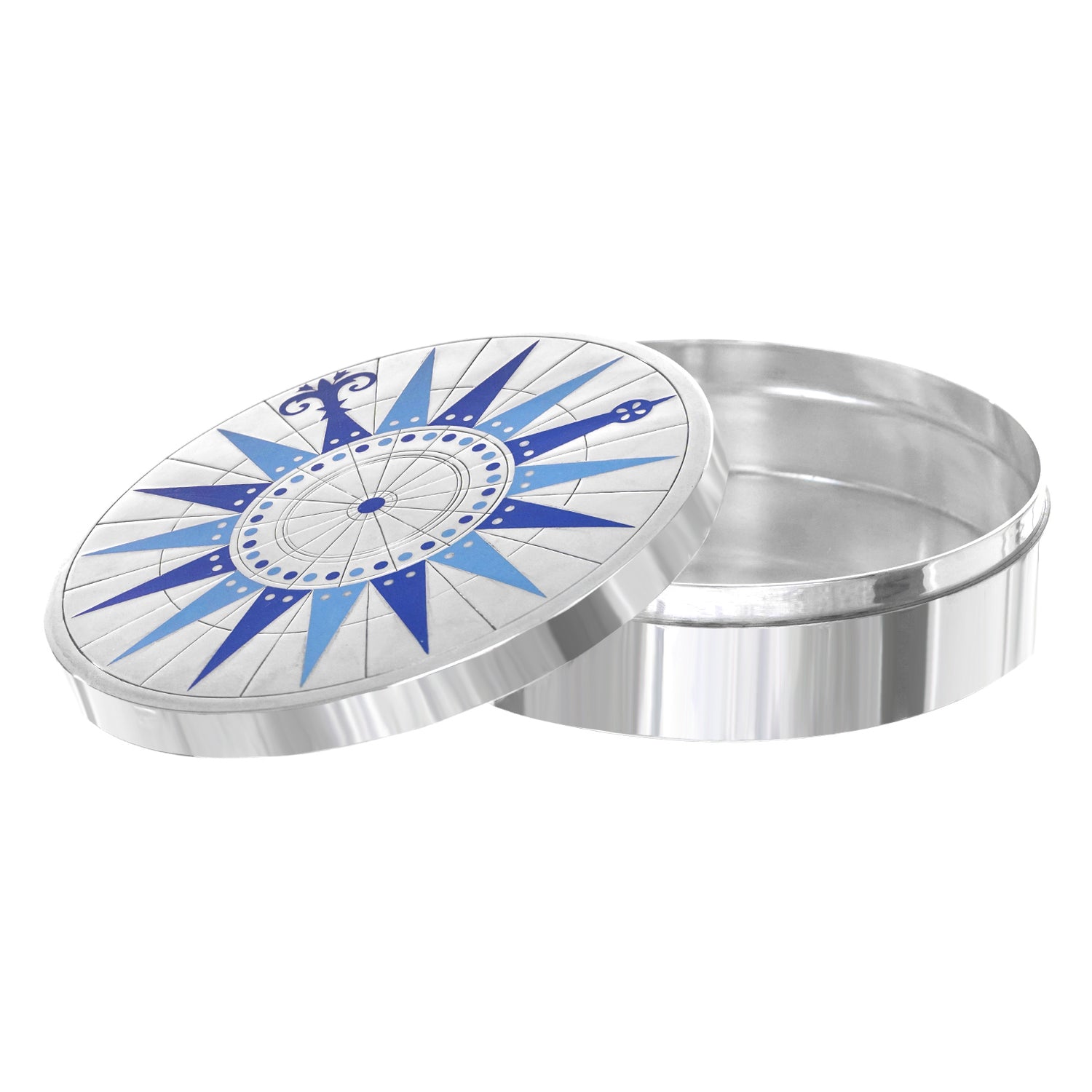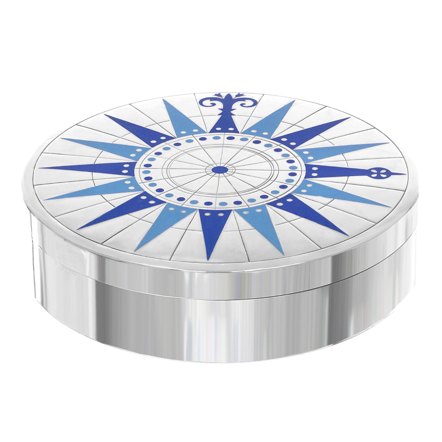 Circa 1950s, Sterling, designed by Erik Herlow for A. Michelsen, Denmark. This gorgeous sterling box features a compass rose motif in the blue enamel Michelsen if famous for. Redolent of Danish mid-century design this is the perfect occasional piece for any home, especially contemporary. Excellent condition.