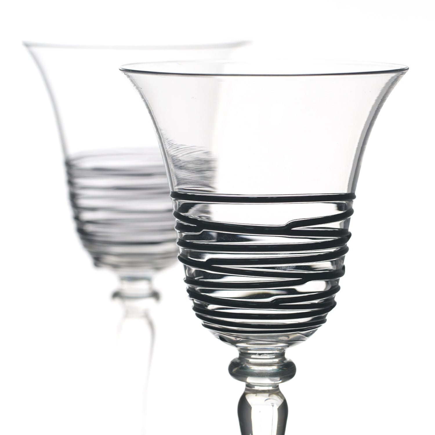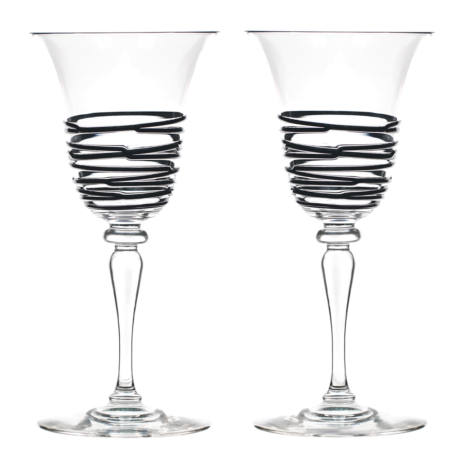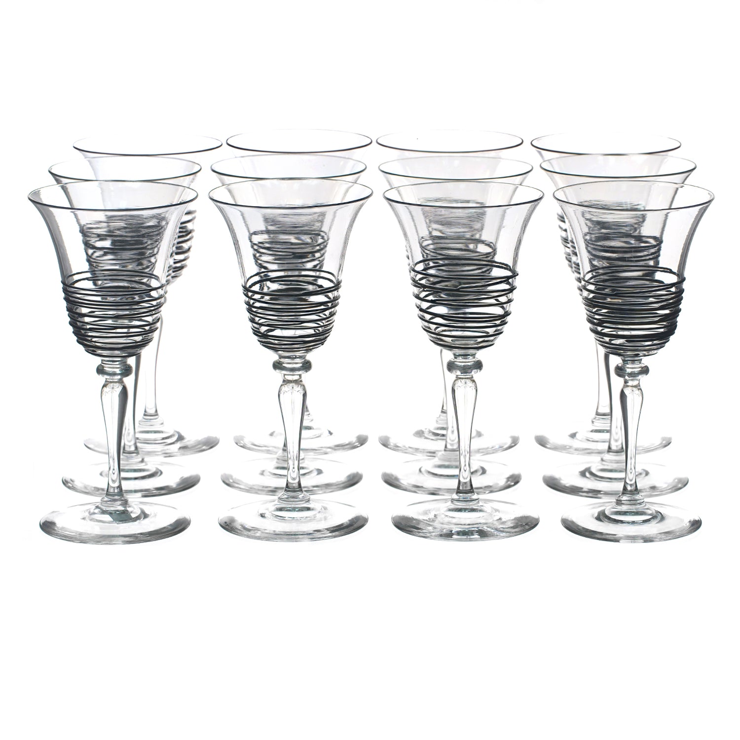 Circa 1920s, by Steuben, American. This stunning set of twelve hand-blown water goblets decorated with Steuben's signature applied threading demonstrates their mastery of striking simplicity and advanced methods. Clean, lines, inspired by colonial glass, are made modern or more to the point Deco by making the color scheme black and white. Designed by Frederick Carder, each glass in the set is meticulously made and in excellent condition.
