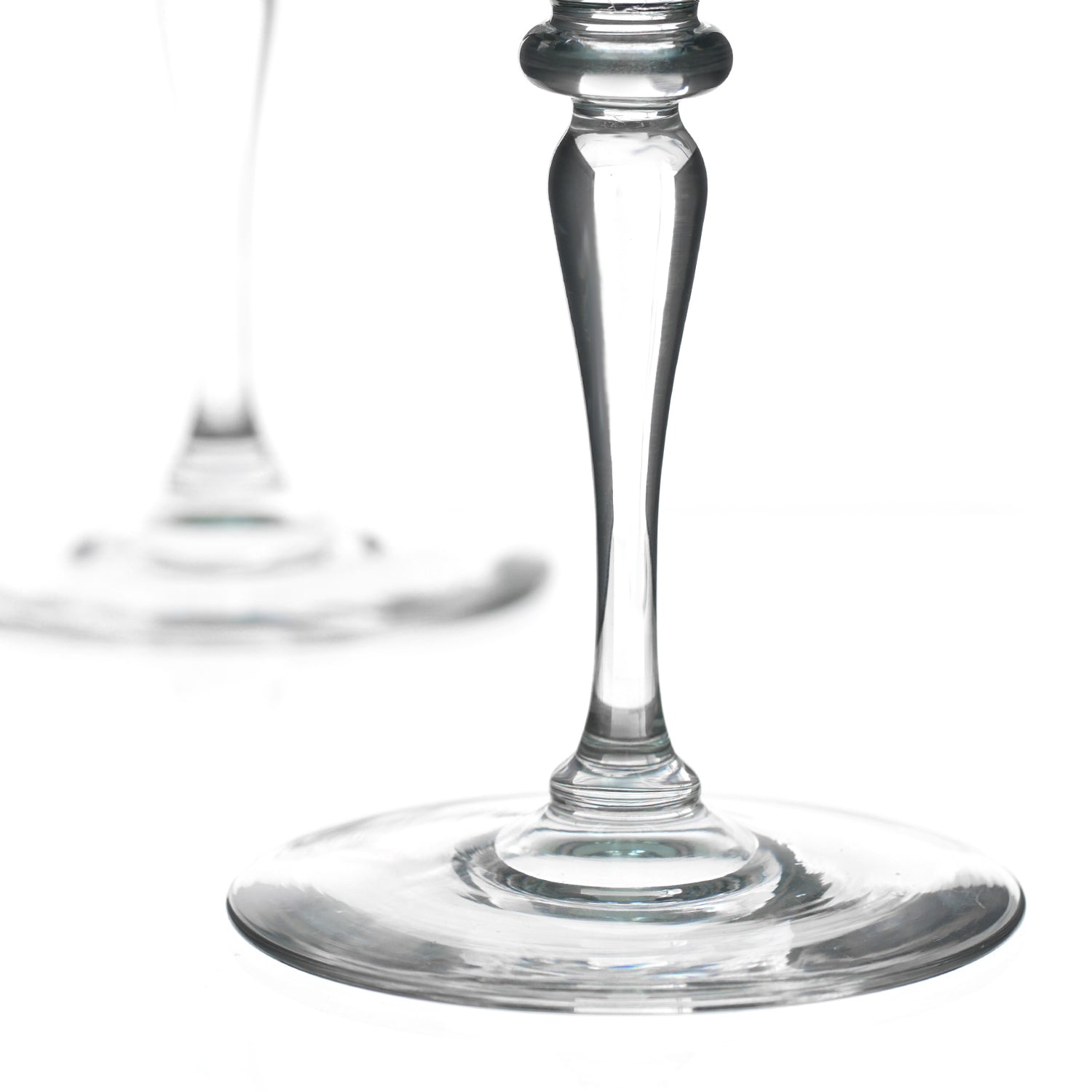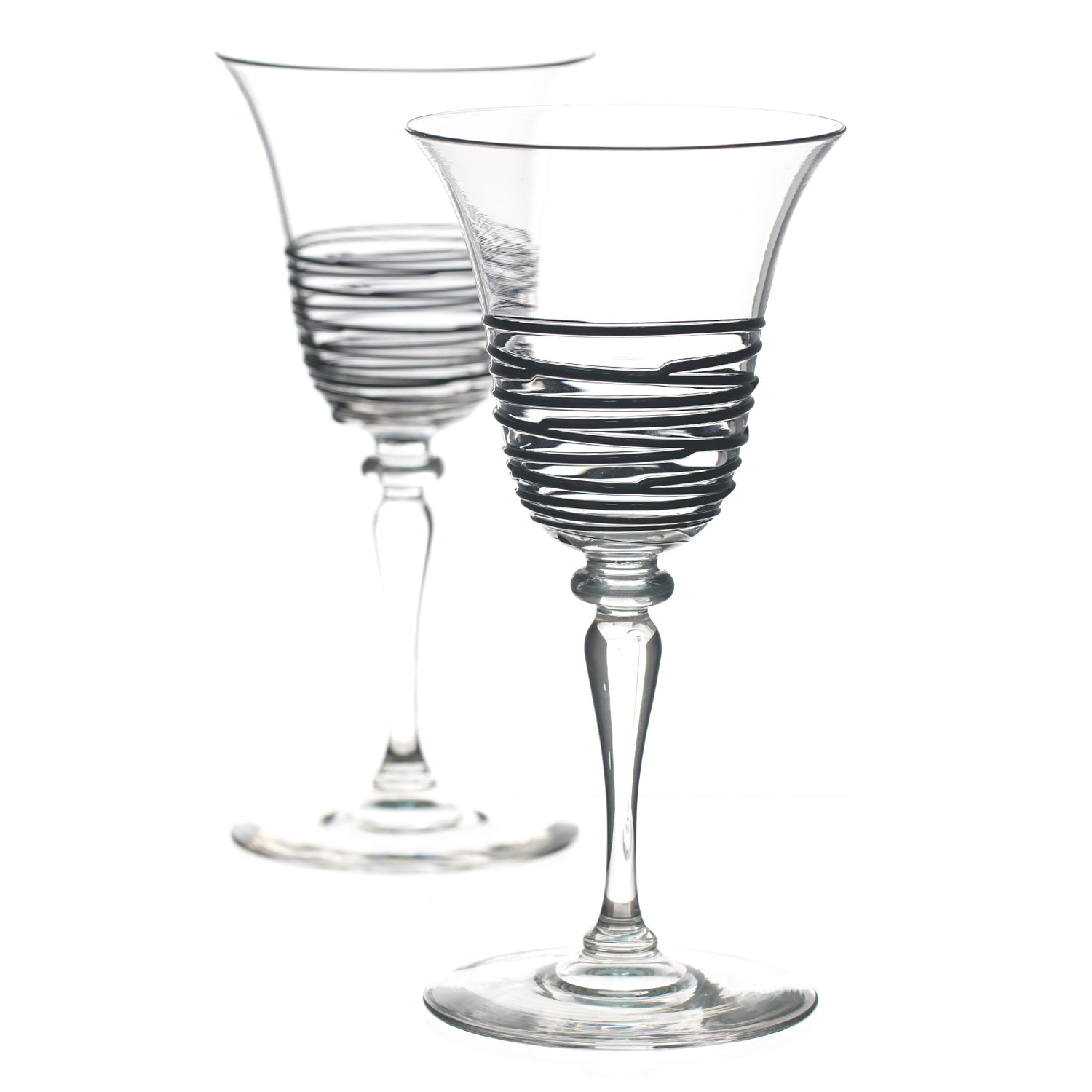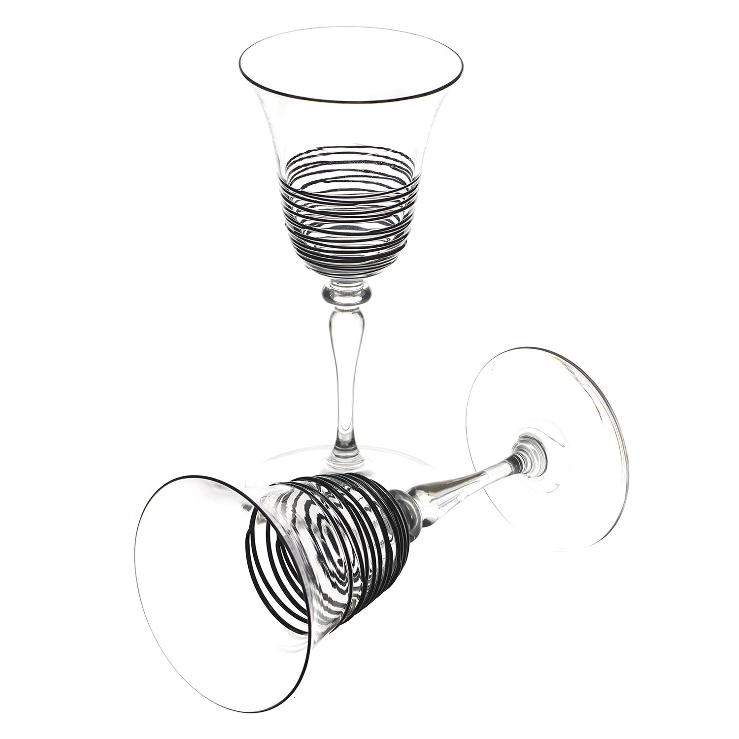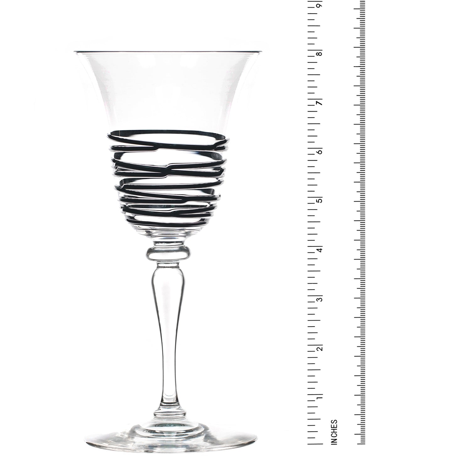 Circa 1920s, by Steuben, American. This stunning set of twelve hand-blown water goblets decorated with Steuben's signature applied threading demonstrates their mastery of striking simplicity and advanced methods. Clean, lines, inspired by colonial glass, are made modern or more to the point Deco by making the color scheme black and white. Designed by Frederick Carder, each glass in the set is meticulously made and in excellent condition.