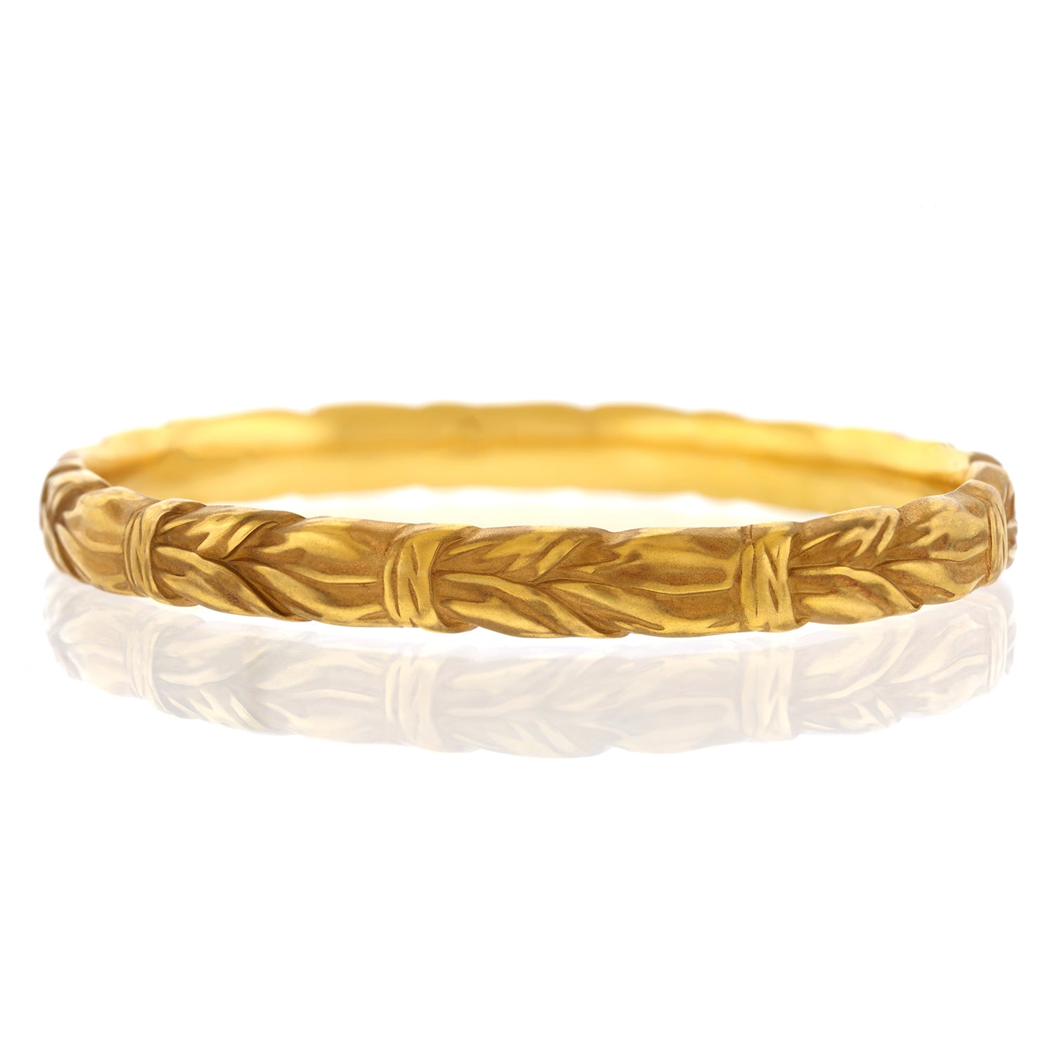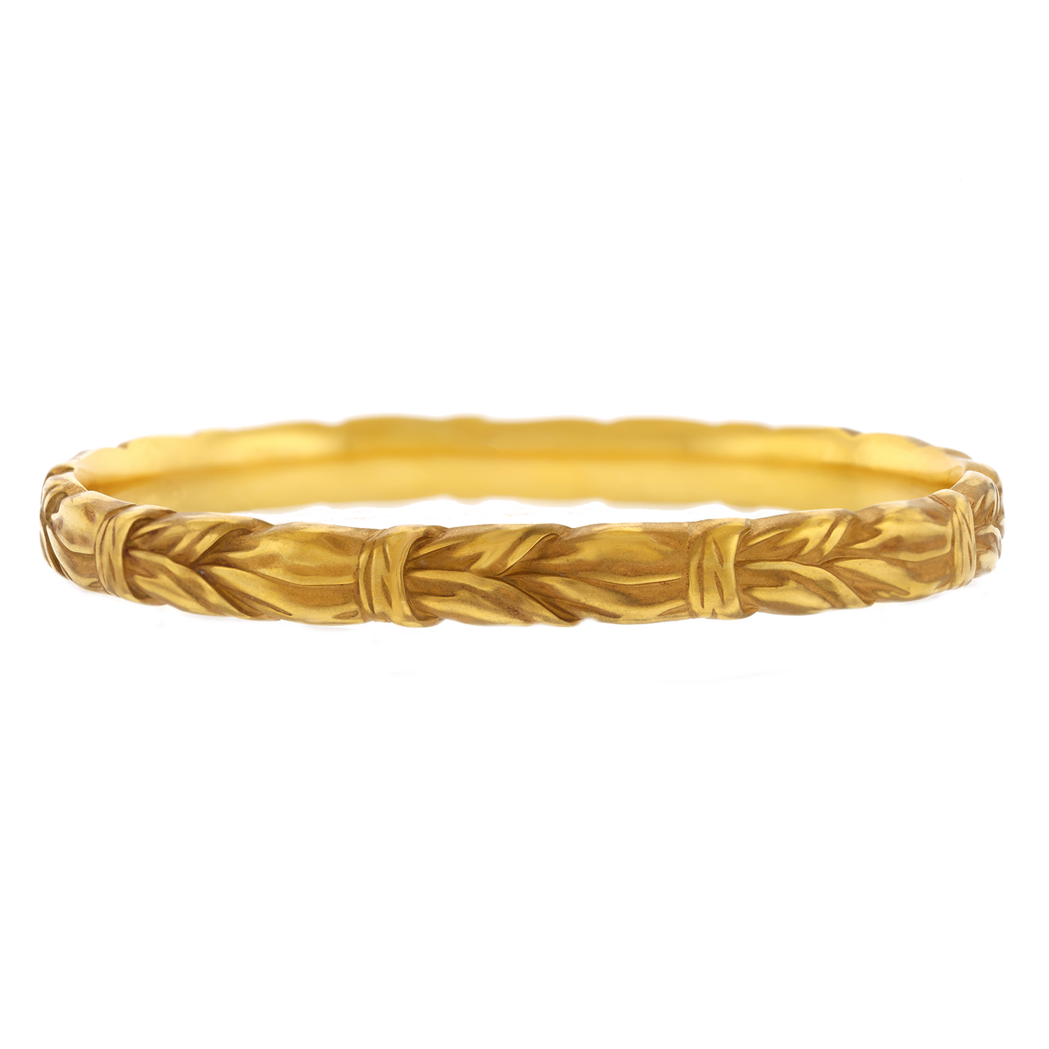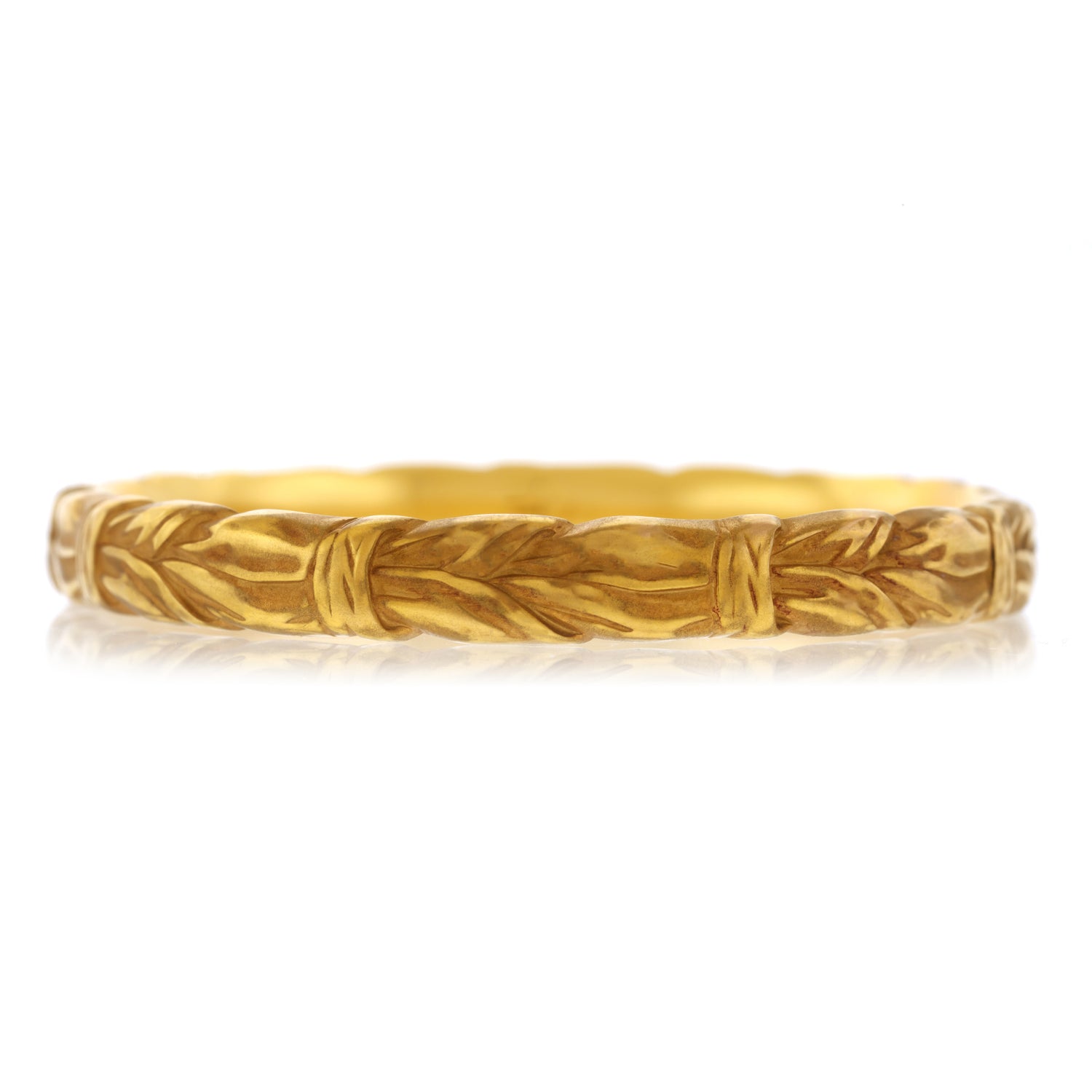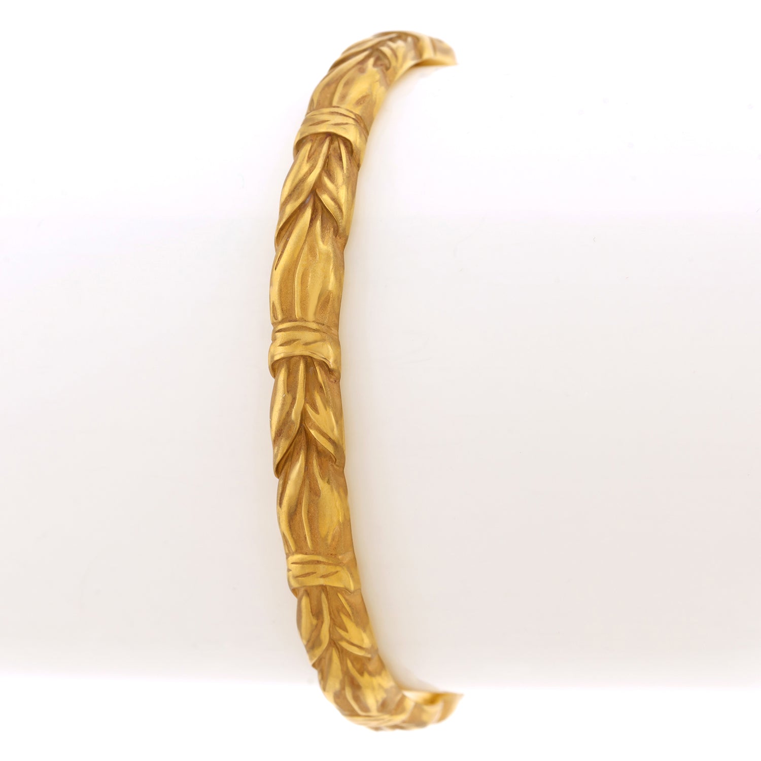 Circa 1890s, 14k, attributed to Riker Brothers, American. This beautiful Art Nouveau bangle features a cinched fabric motif reminiscent of Roman designs. Delightfully antique-chic, it looks amazing worn alone or added to your "arm candy." Pieces like this one are quintessential examples of how Riker Brothers were central to the Aesthetic movement in America. Beautifully made, it is in very good condition.