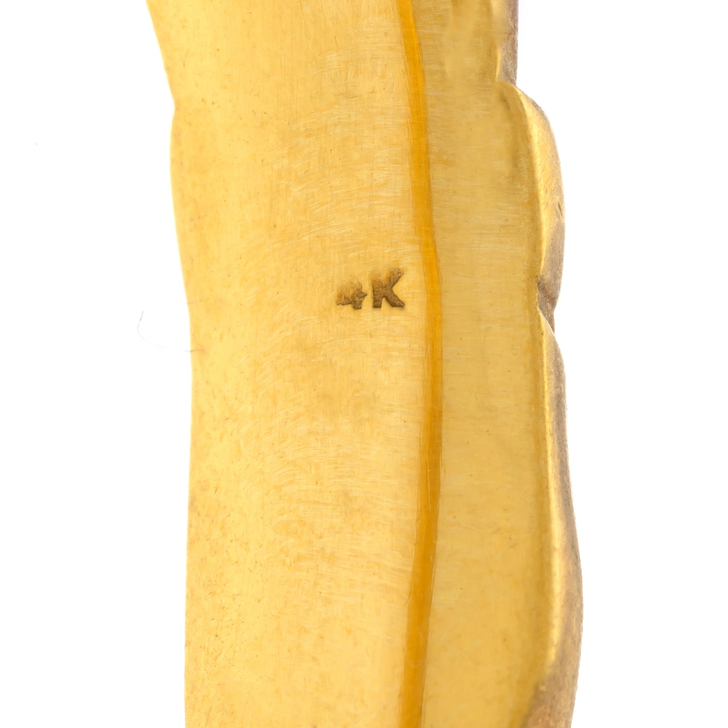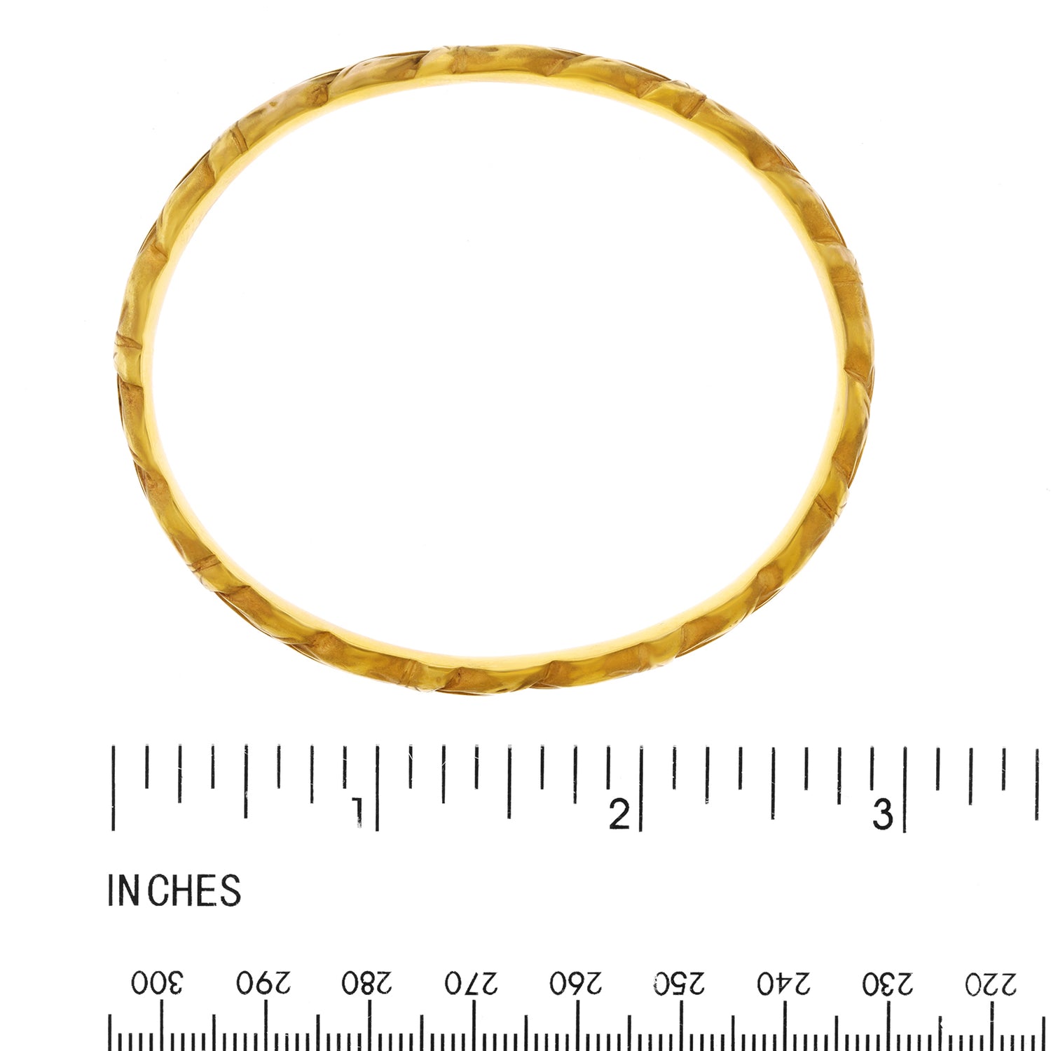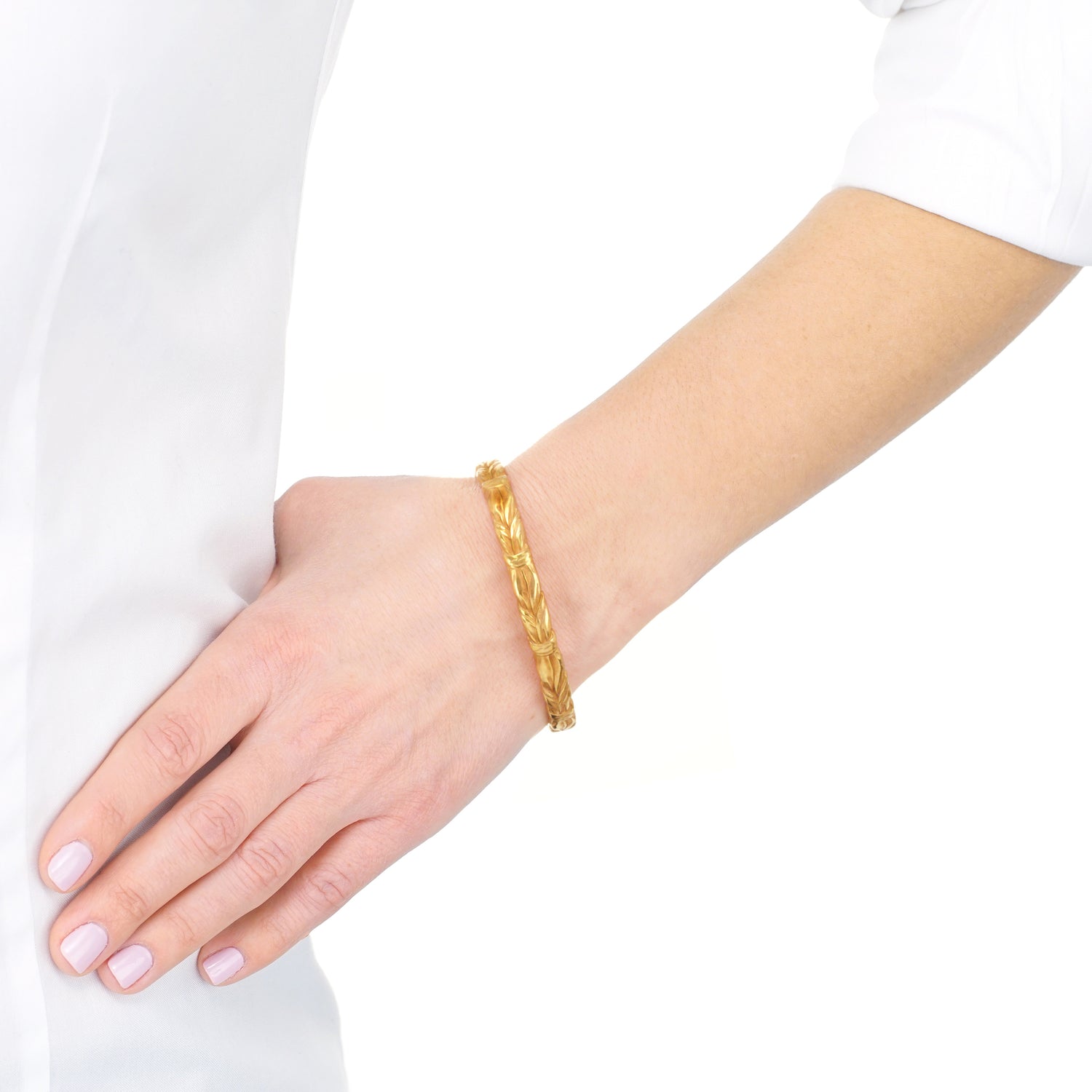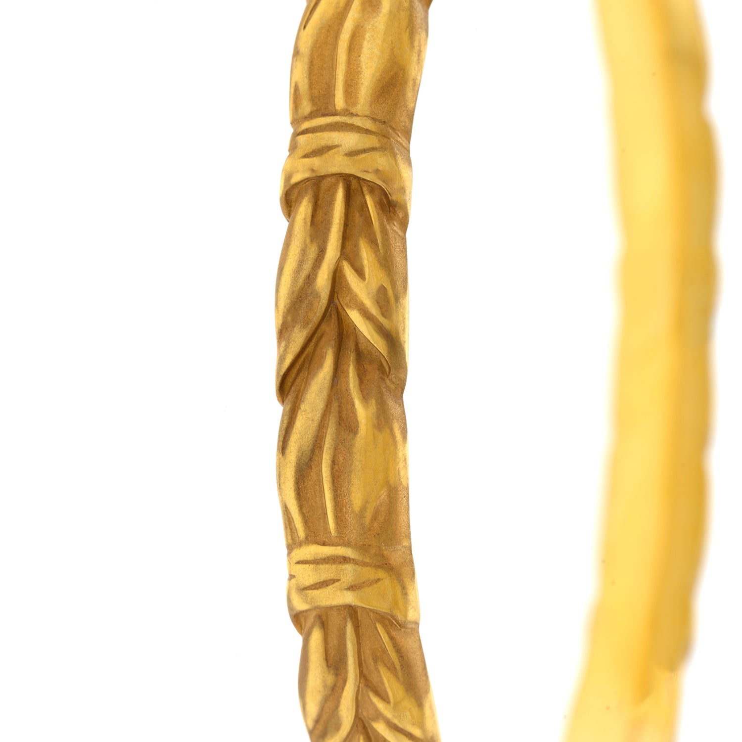Circa 1890s, 14k, attributed to Riker Brothers, American. This beautiful Art Nouveau bangle features a cinched fabric motif reminiscent of Roman designs. Delightfully antique-chic, it looks amazing worn alone or added to your "arm candy." Pieces like this one are quintessential examples of how Riker Brothers were central to the Aesthetic movement in America. Beautifully made, it is in very good condition.