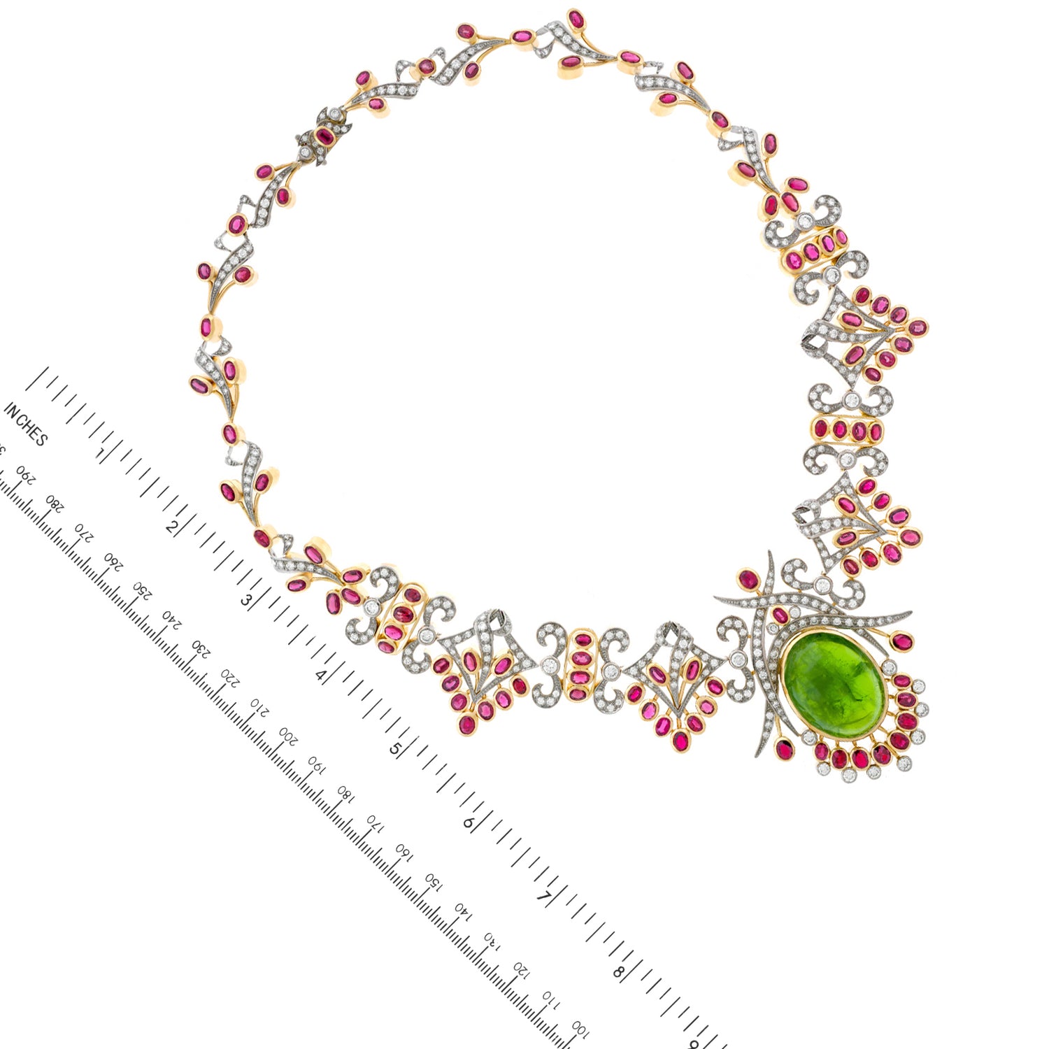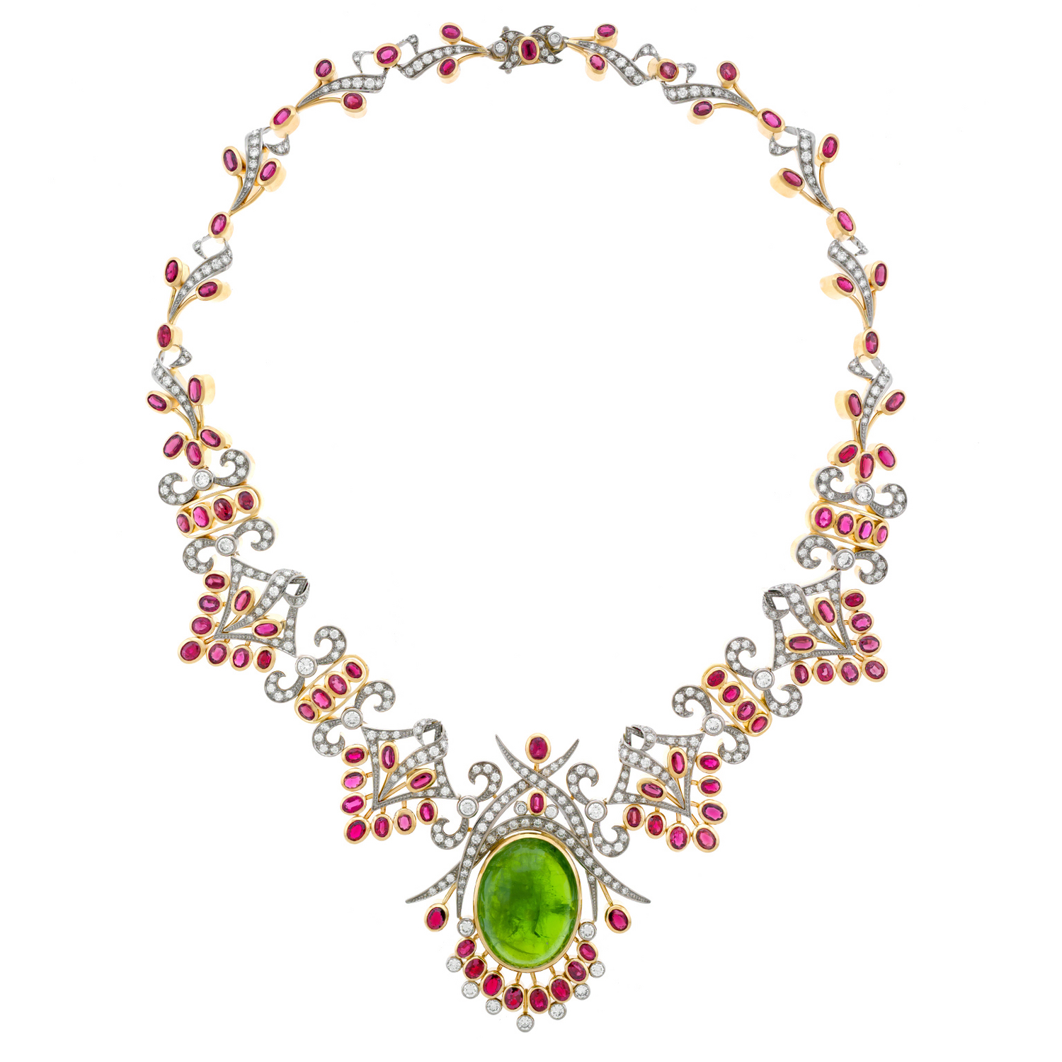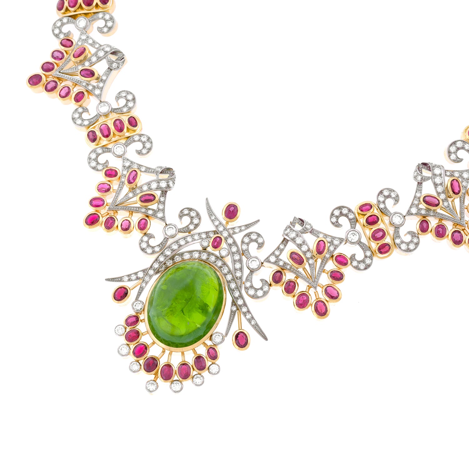 Circa 1980s, 18k, Swiss. This stunning necklace is a suite of jewelry made as an homage to Verdi’s operas. Using superb color, brilliant white diamonds, and a striking design, the goldsmith wrote his aria's into this necklace. The look is one-of-a-kind fashion theater! Comfortable on and finely made, it is in excellent condition.