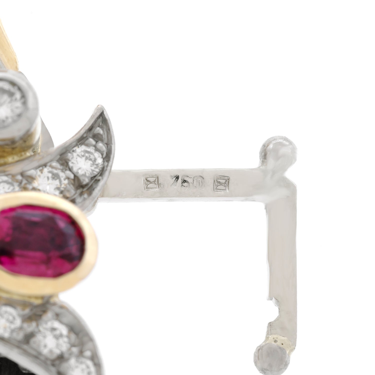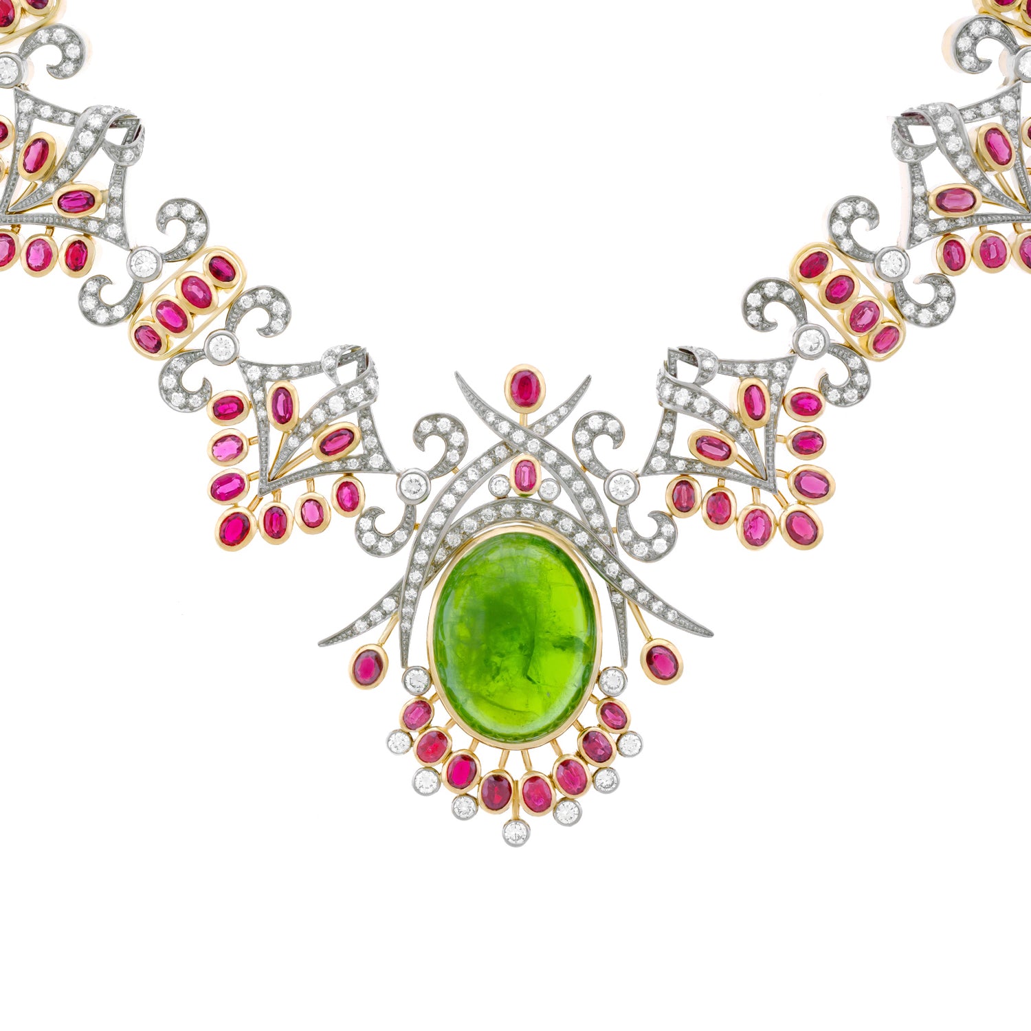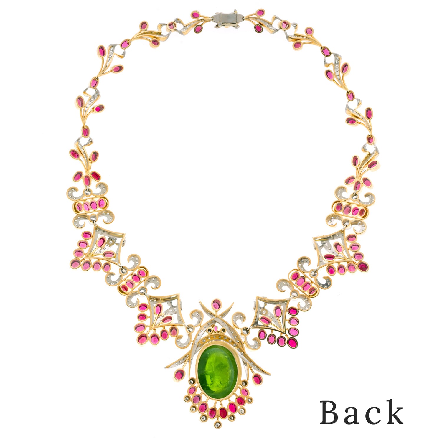 Circa 1980s, 18k, Swiss. This stunning necklace is a suite of jewelry made as an homage to Verdi’s operas. Using superb color, brilliant white diamonds, and a striking design, the goldsmith wrote his aria's into this necklace. The look is one-of-a-kind fashion theater! Comfortable on and finely made, it is in excellent condition.
