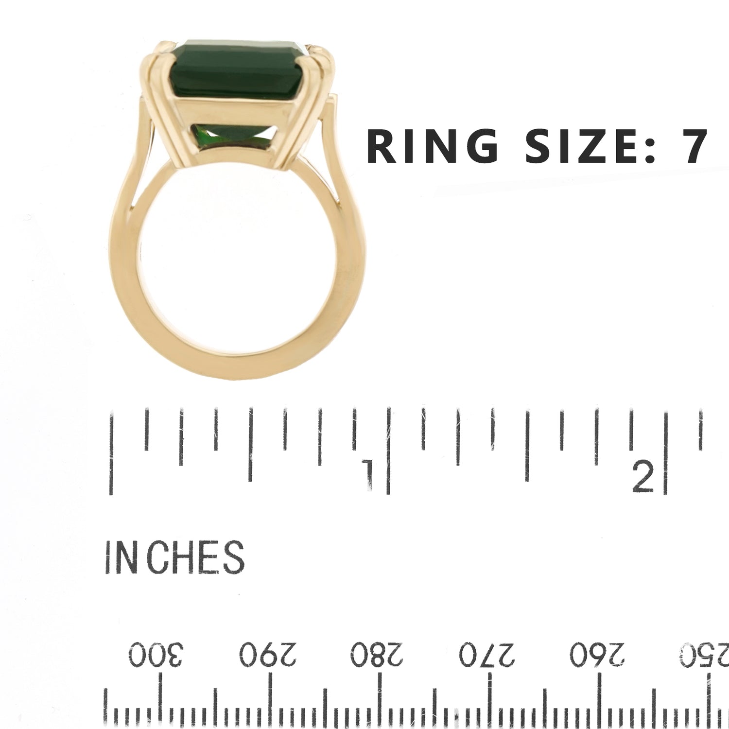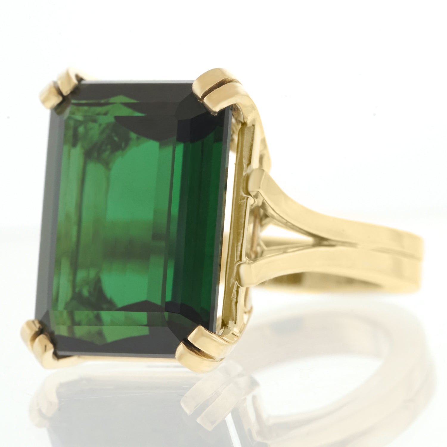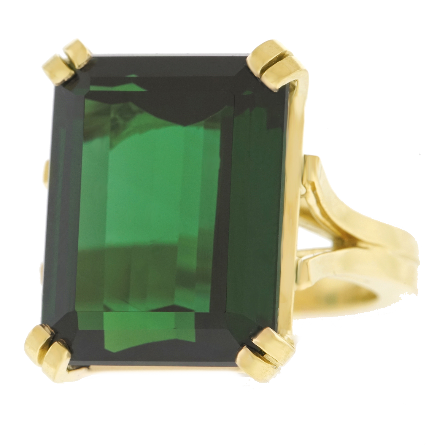 Circa 2020, 18k, by Lawrence Jeffrey, American. This is the ultimate colored gemstone fashion ring, the look is effortlessly glamorous. The 28.3-carat delicately deep green tourmaline is an impossibly exceptional color with perfect clarity. The elegant mounting in heavy 18k yellow gold balances the size of the stone perfectly. Rife with notes of Art Deco and Retro it is meticulously fabricated and in excellent condition.