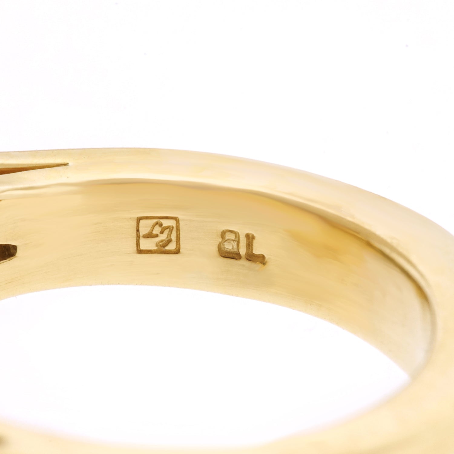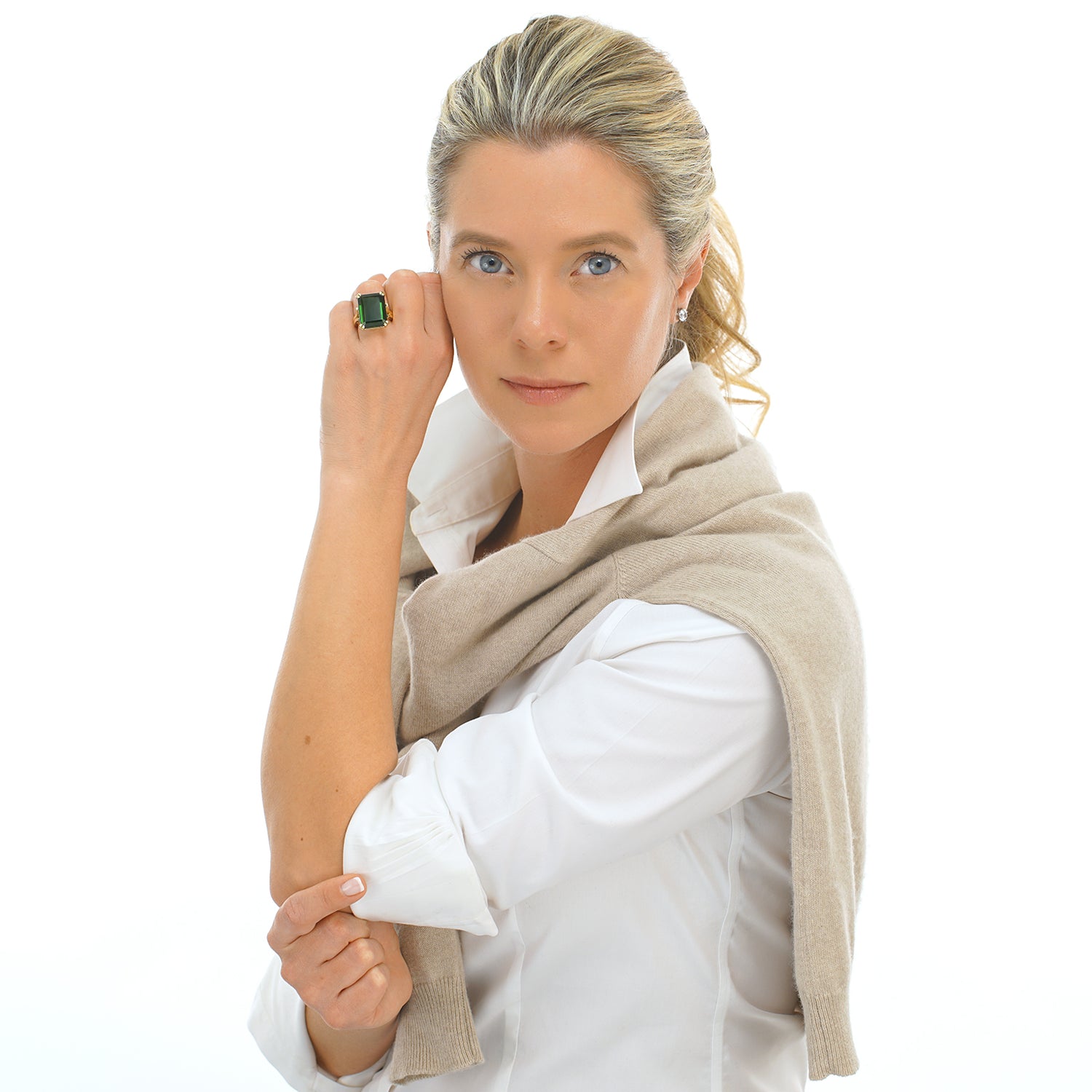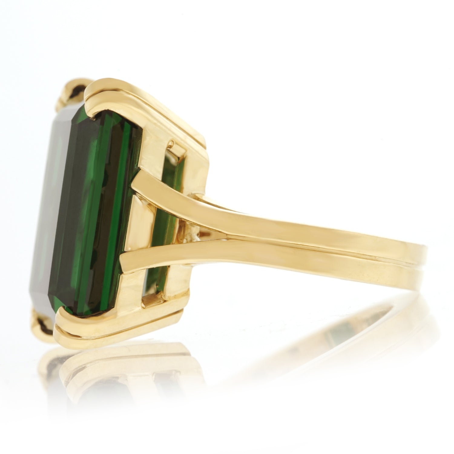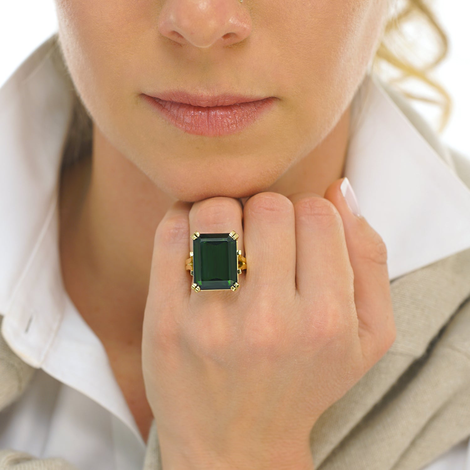 Circa 2020, 18k, by Lawrence Jeffrey, American. This is the ultimate colored gemstone fashion ring, the look is effortlessly glamorous. The 28.3-carat delicately deep green tourmaline is an impossibly exceptional color with perfect clarity. The elegant mounting in heavy 18k yellow gold balances the size of the stone perfectly. Rife with notes of Art Deco and Retro it is meticulously fabricated and in excellent condition.