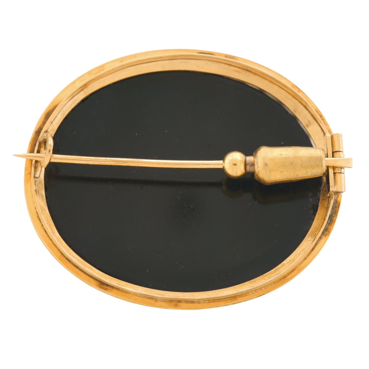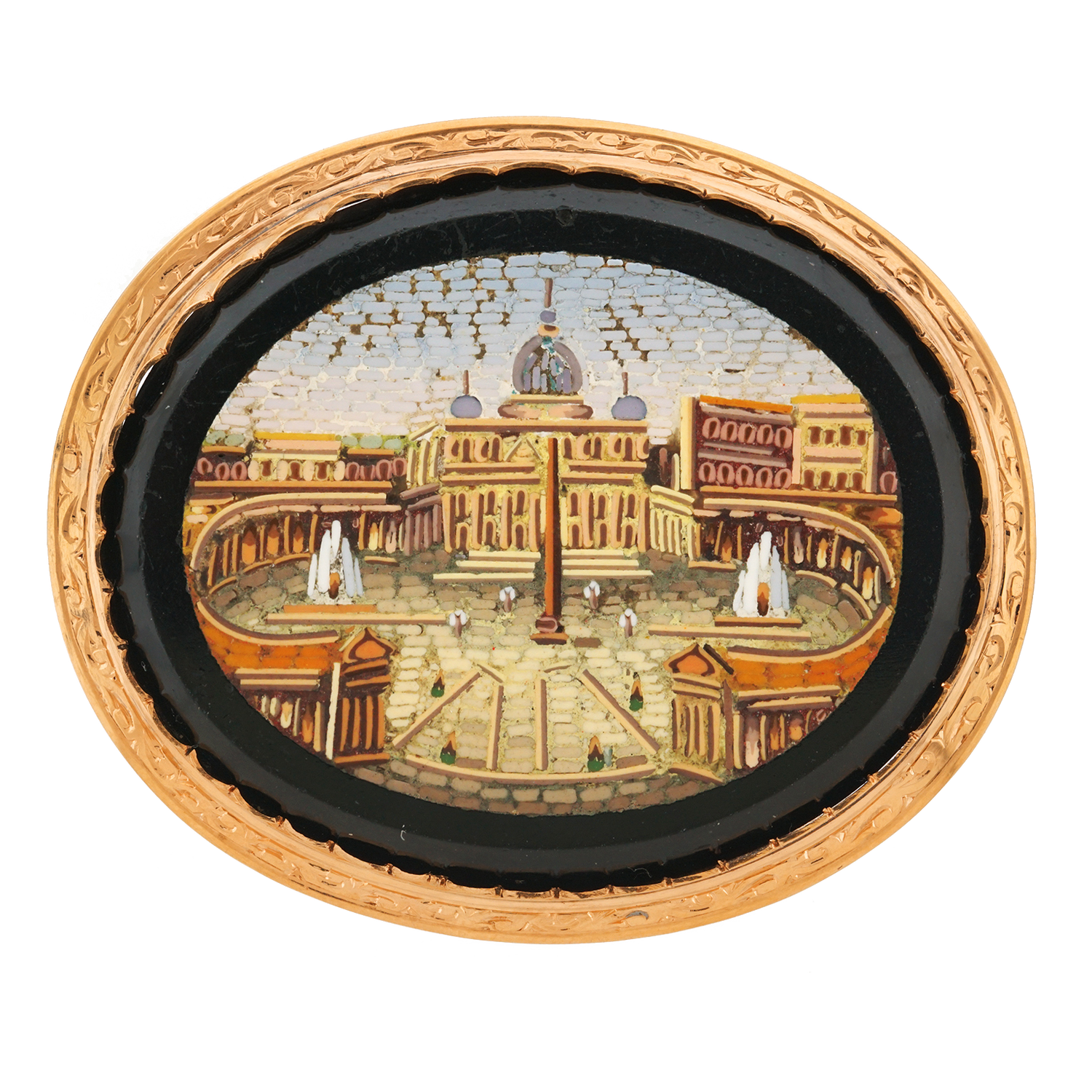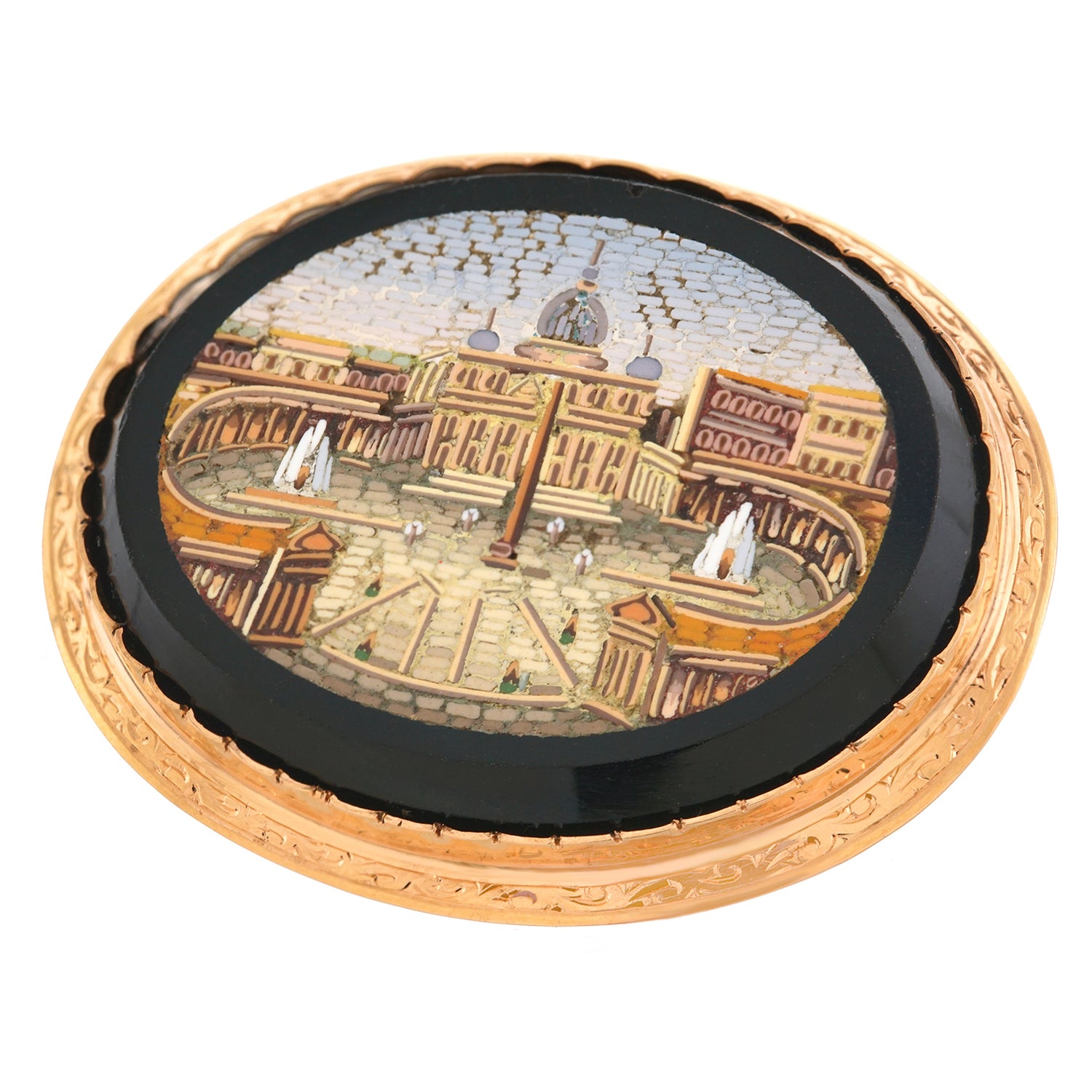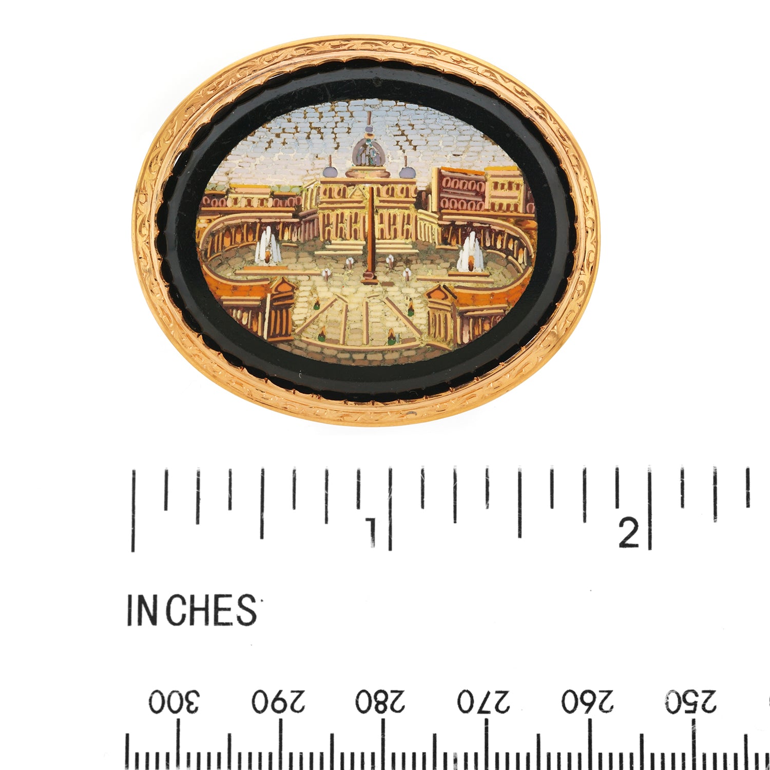Circa 1870, 18k, French. Featuring St. Peter's Square, this particularly exceptional micro mosaic pin features a heavy, finely detailed 18kt gold frame. An earlier example, the scene of St. Peter's Square in the Vatican is realistically depicted using extra small tesserae for superb detail. The goldwork is French and art Italian. An important part of the archeological revival movement, micro mosaic jewelry sits at a crossroads. Brilliantly combining fashion, fine art, and decorative arts, the result is a lasting legacy of unique pieces. Excellent condition.