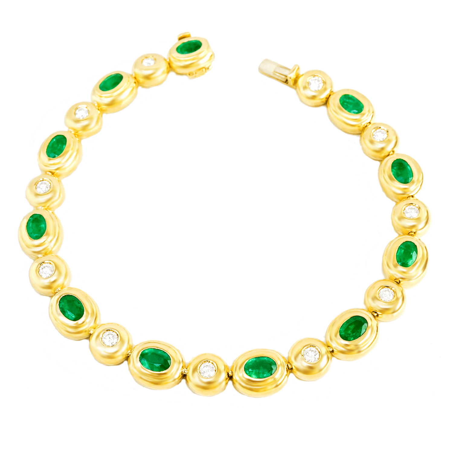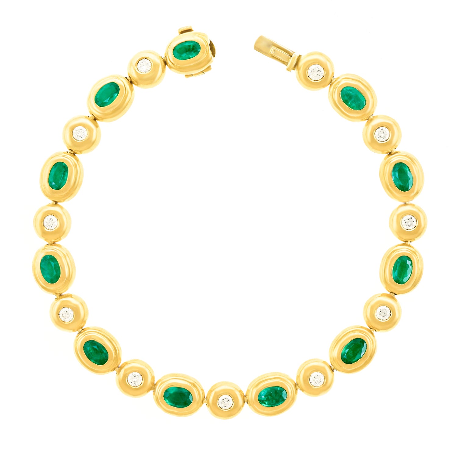 Circa 1970s, 18k. Featuring 4.0 carats of emeralds and 1.10 carats of brilliant white diamonds (G color and VS clarity), this stylish bracelet has a chic seventies look. Finely fabricated in 18k yellow gold, the smart construction offers protection to the stones. This bracelet is in excellent condition.