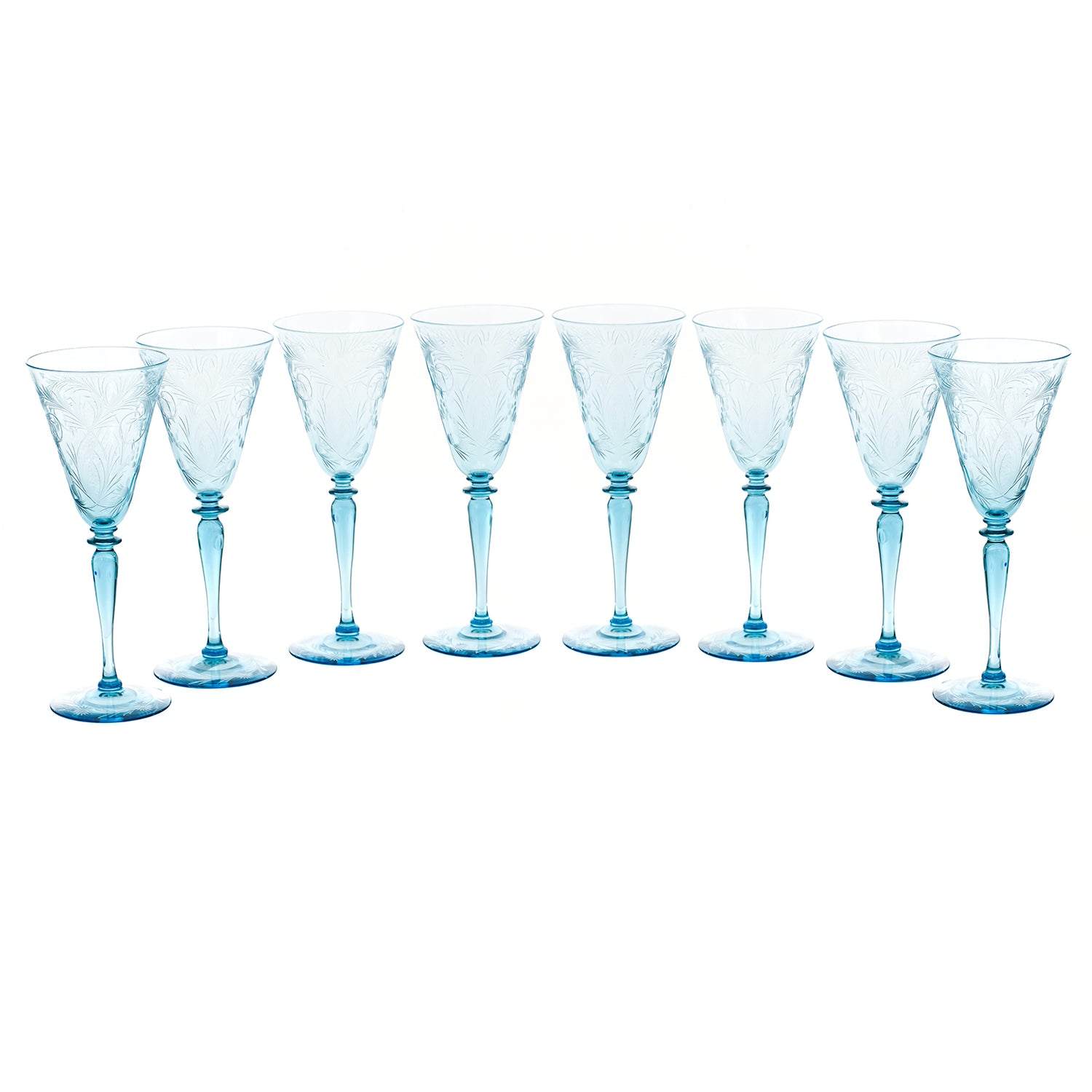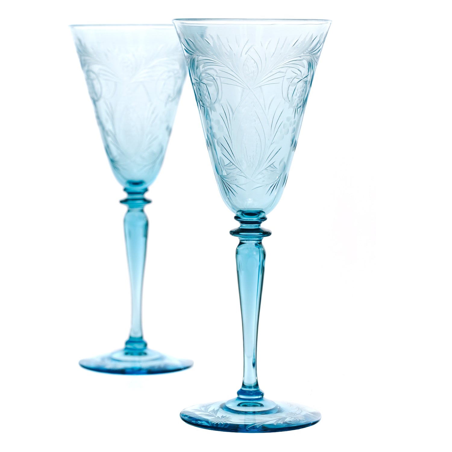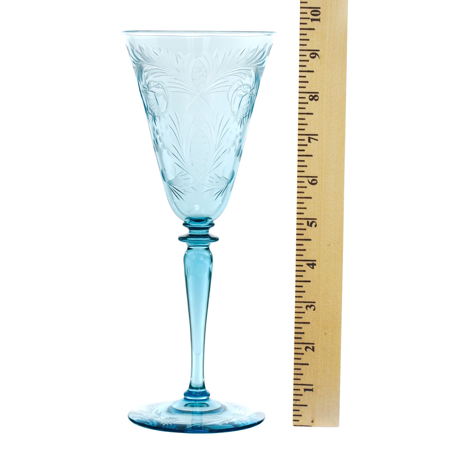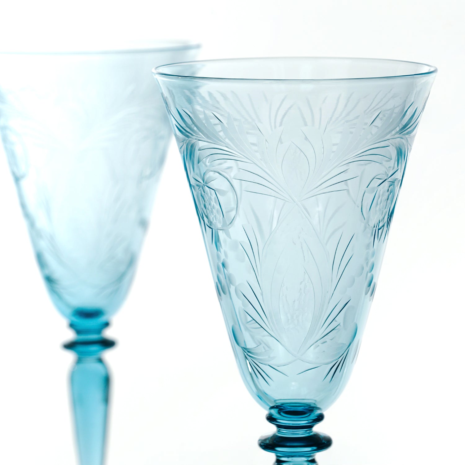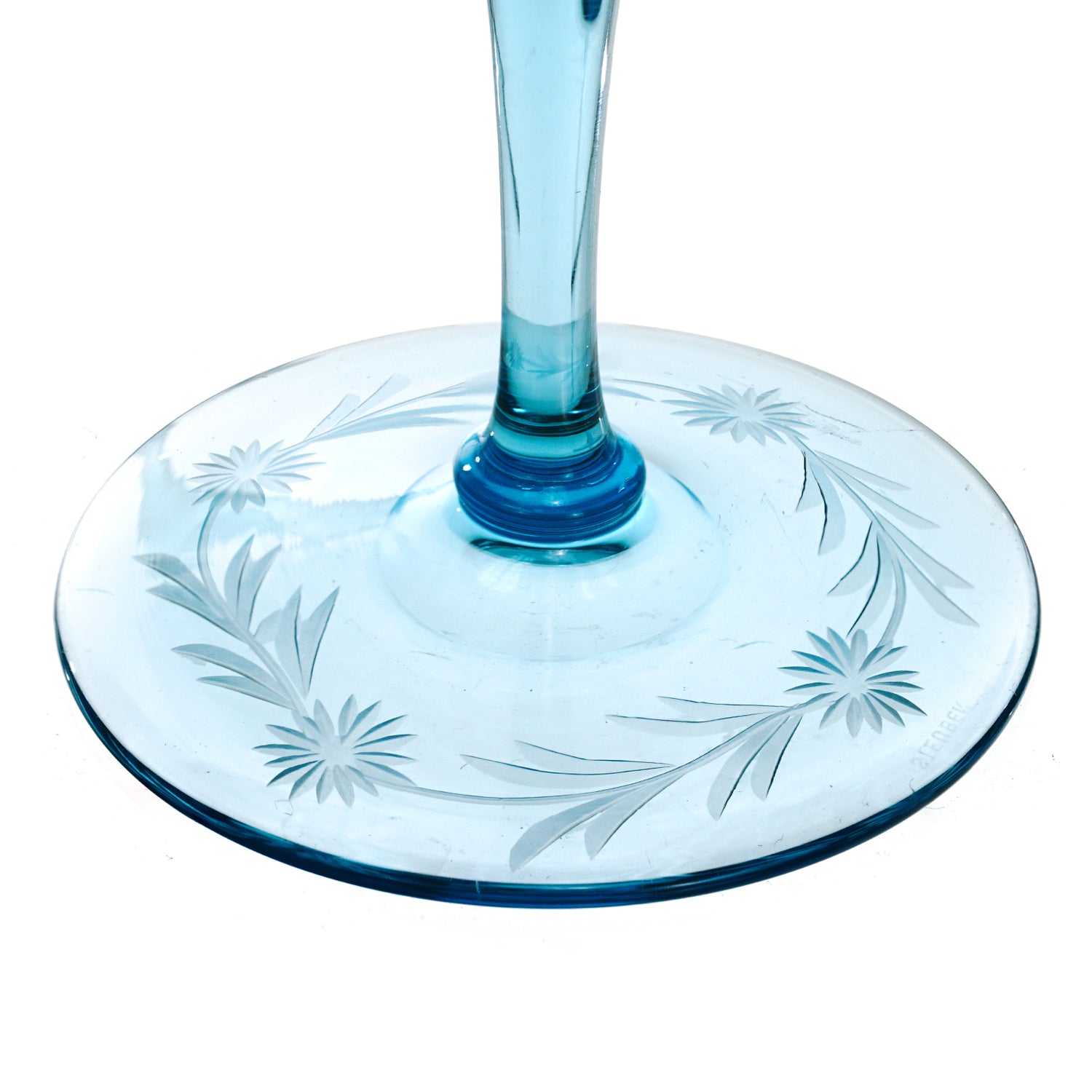 Circa 1920s, By Frederick Carder for Steuben, American. These one-of-a-kind goblets have it all, desirable silhouette, rare celeste blue color, extreme height, and custom engraved pattern. They are gorgeous. Excellent condition.