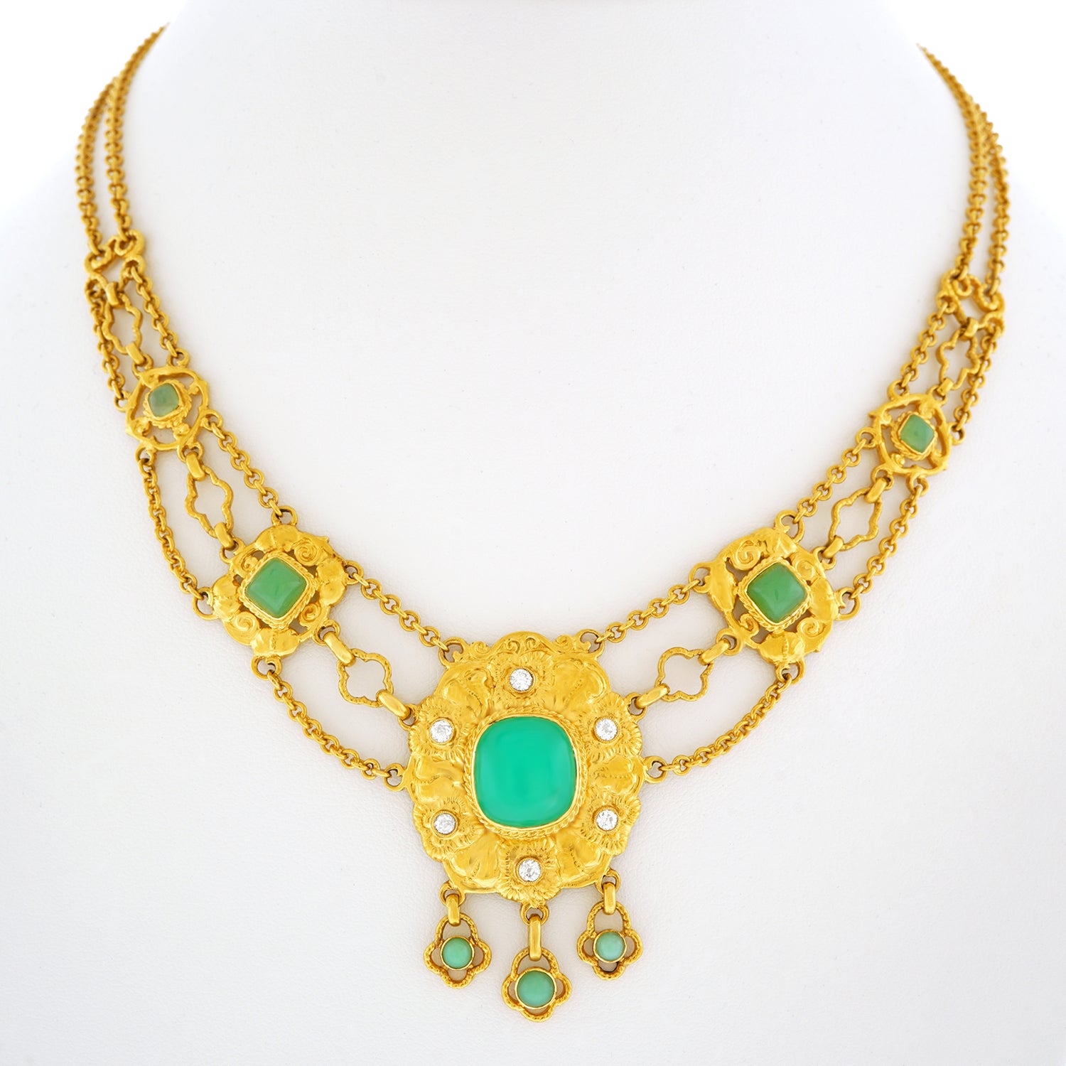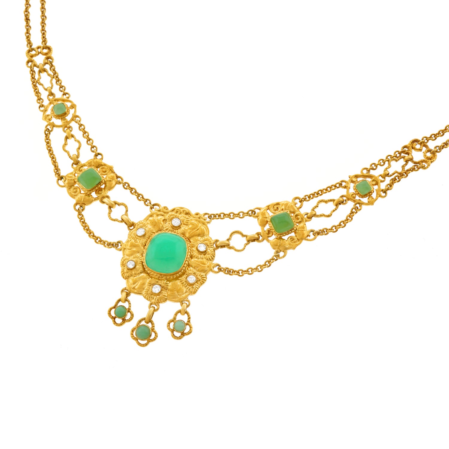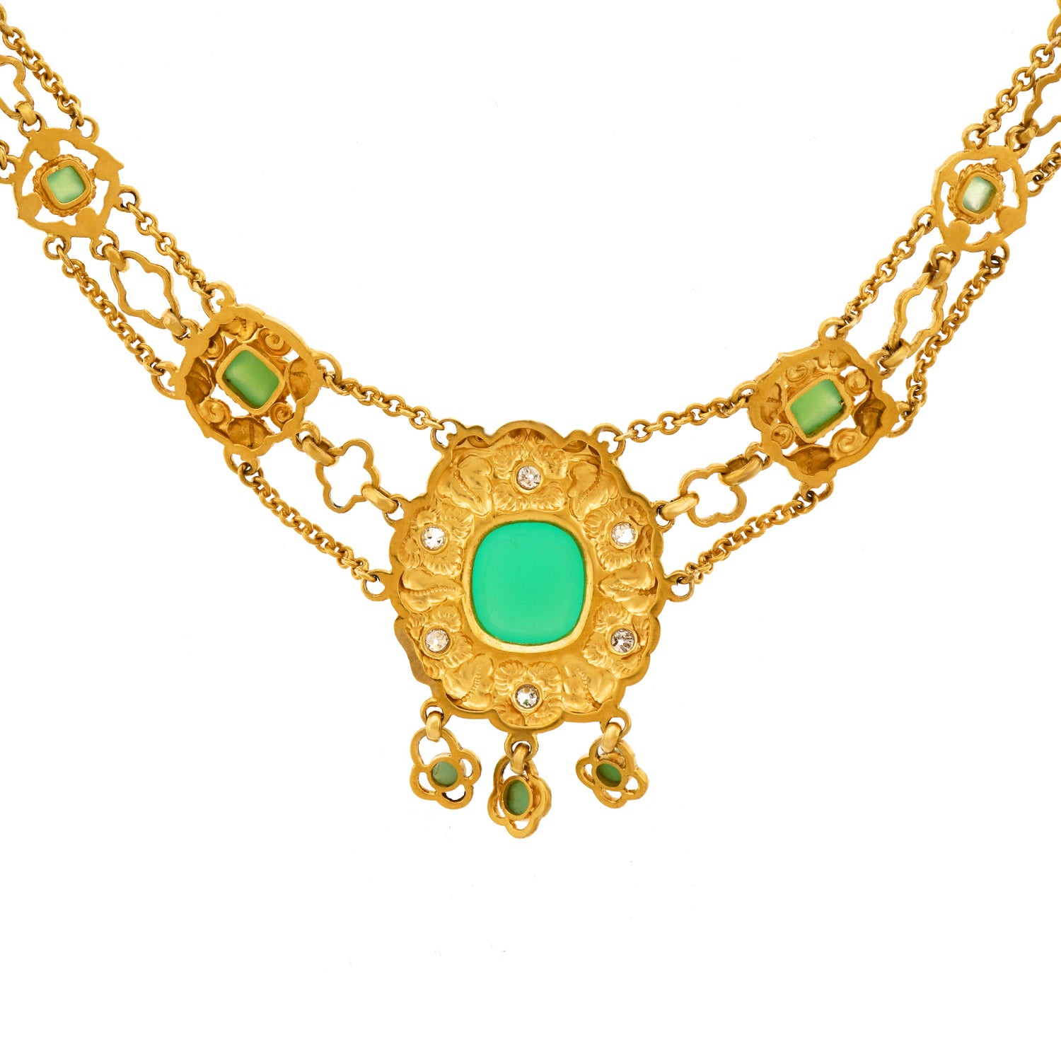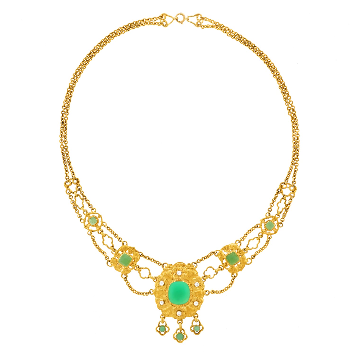 Circa 1890s, 18k, attributed Swiss. This sublime necklace melds Art, mysticism, and science. Set with bright chrysoprase and diamonds (.50cttw, H, SI1-2), this one-of-a-kind piece is meticulously hand fabricated in 18k yellow gold. Of particular note is the exceptional finely peened surface. The look is Arts and Crafts meets Art Nouveau. Brilliantly hand-made, it is in excellent condition.