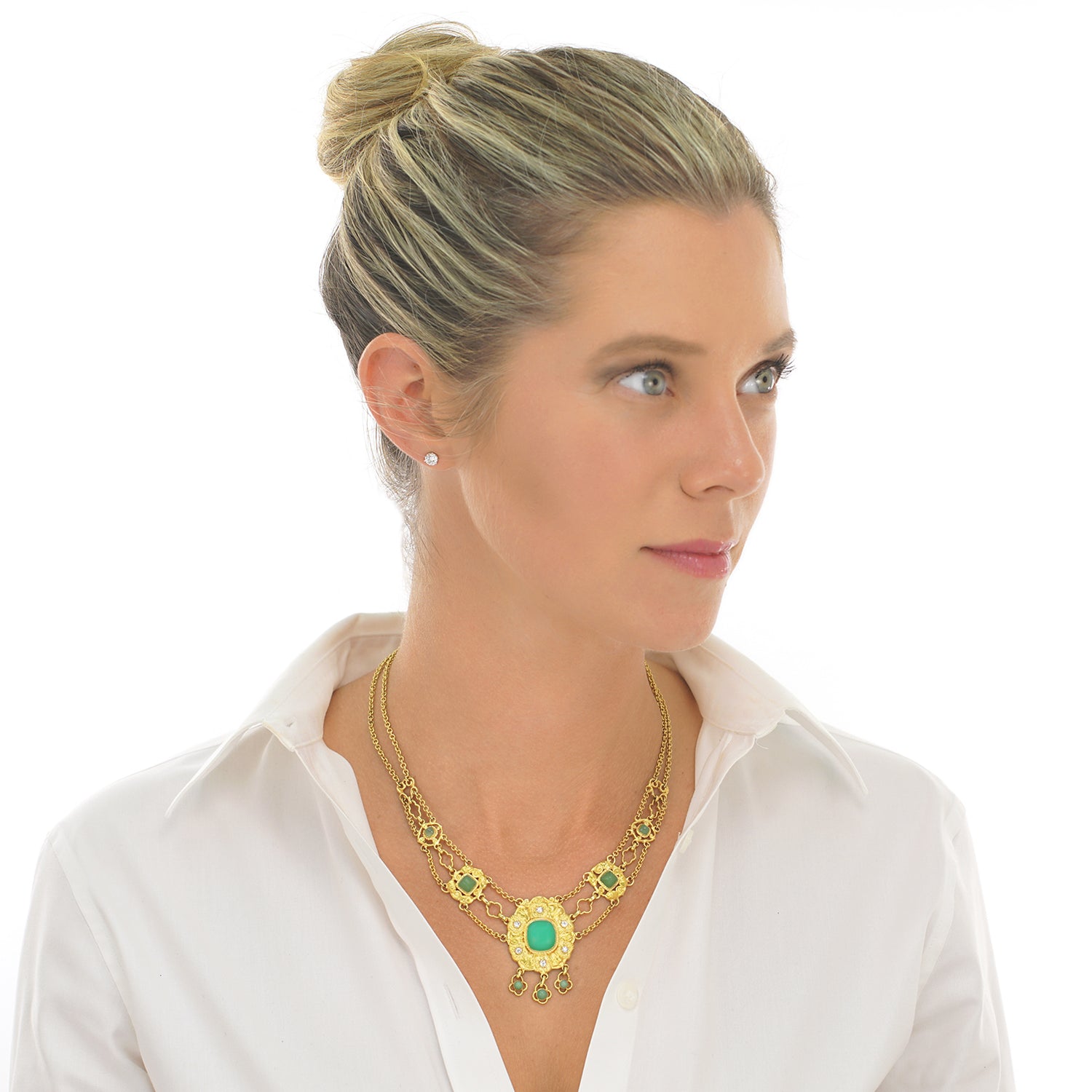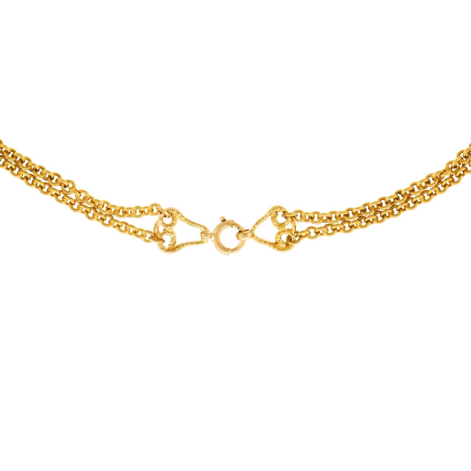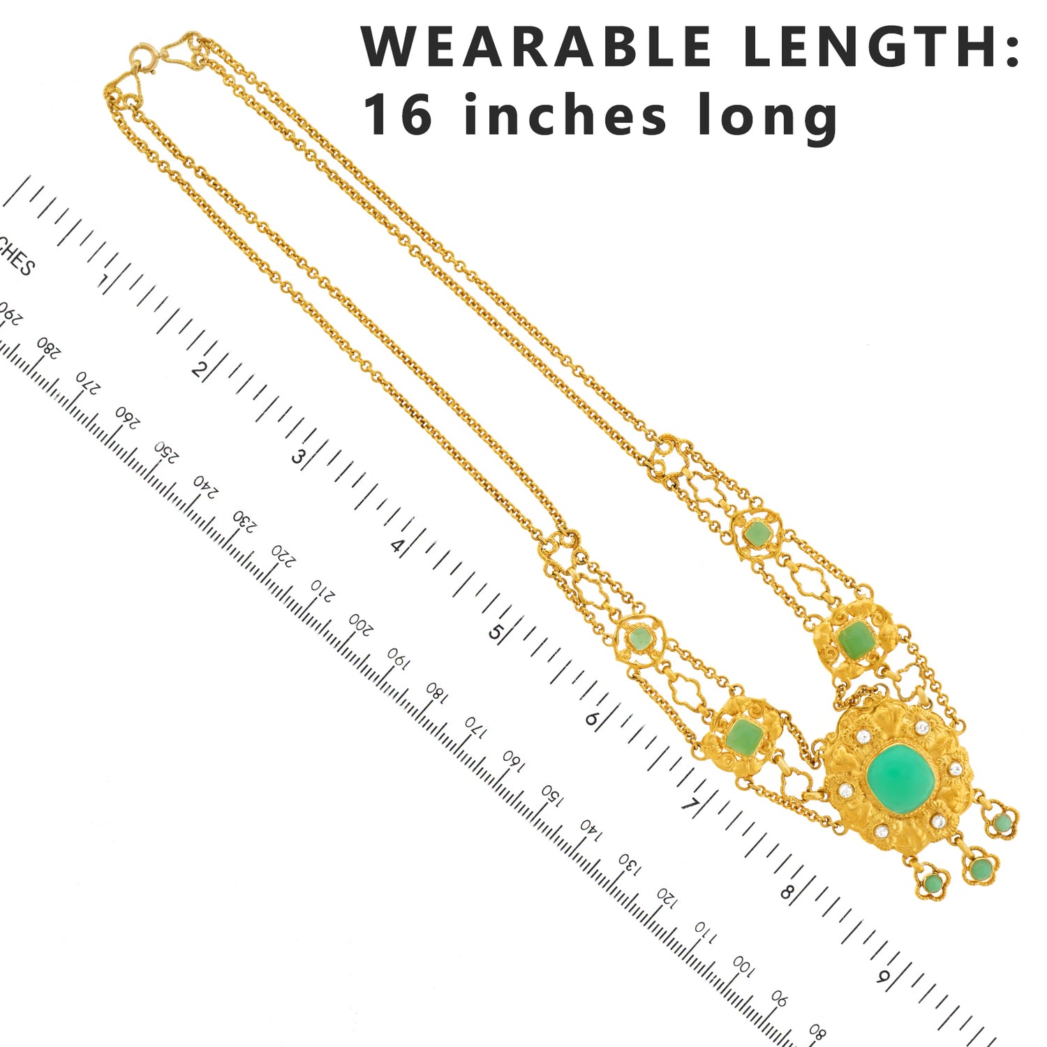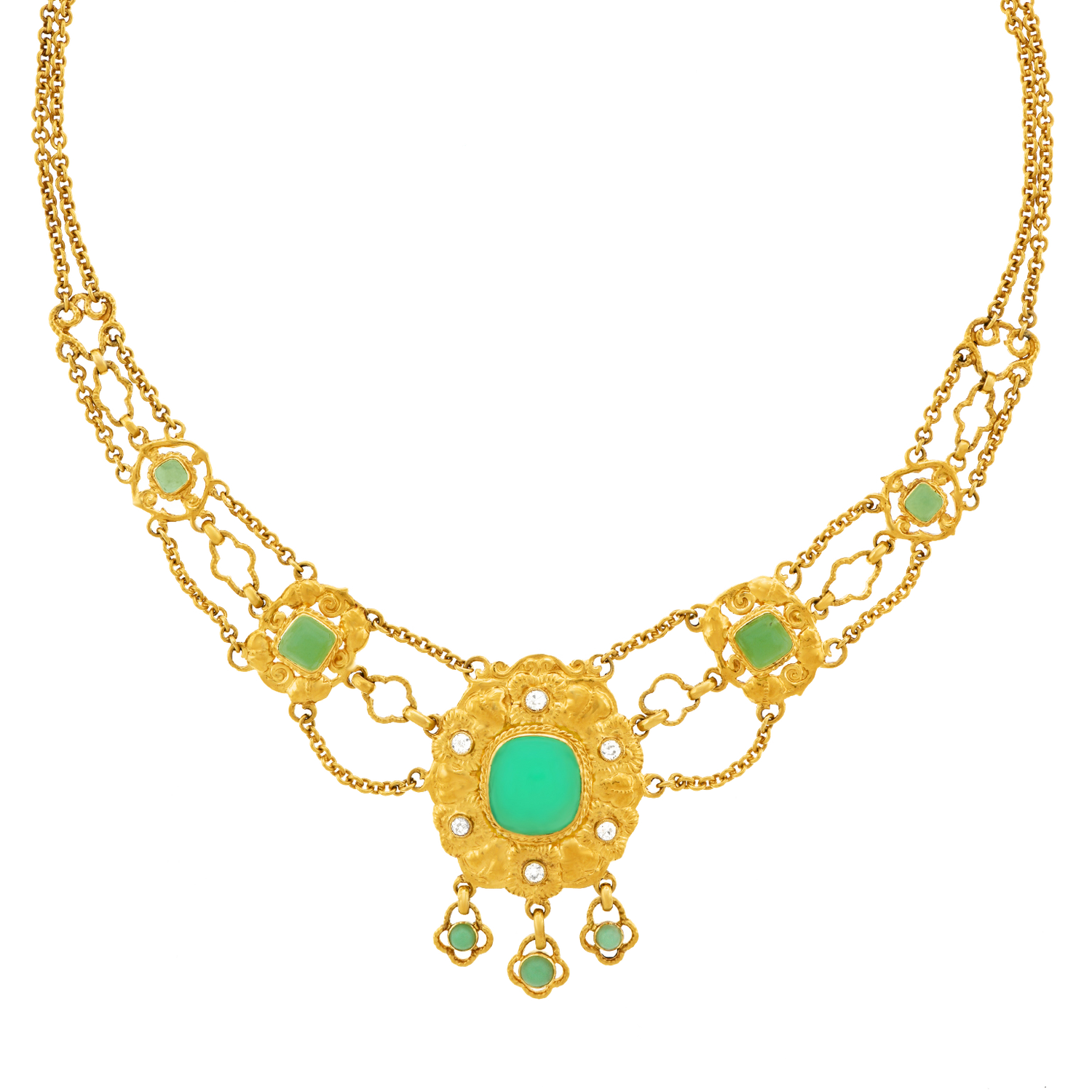 Circa 1890s, 18k, attributed Swiss. This sublime necklace melds Art, mysticism, and science. Set with bright chrysoprase and diamonds (.50cttw, H, SI1-2), this one-of-a-kind piece is meticulously hand fabricated in 18k yellow gold. Of particular note is the exceptional finely peened surface. The look is Arts and Crafts meets Art Nouveau. Brilliantly hand-made, it is in excellent condition.