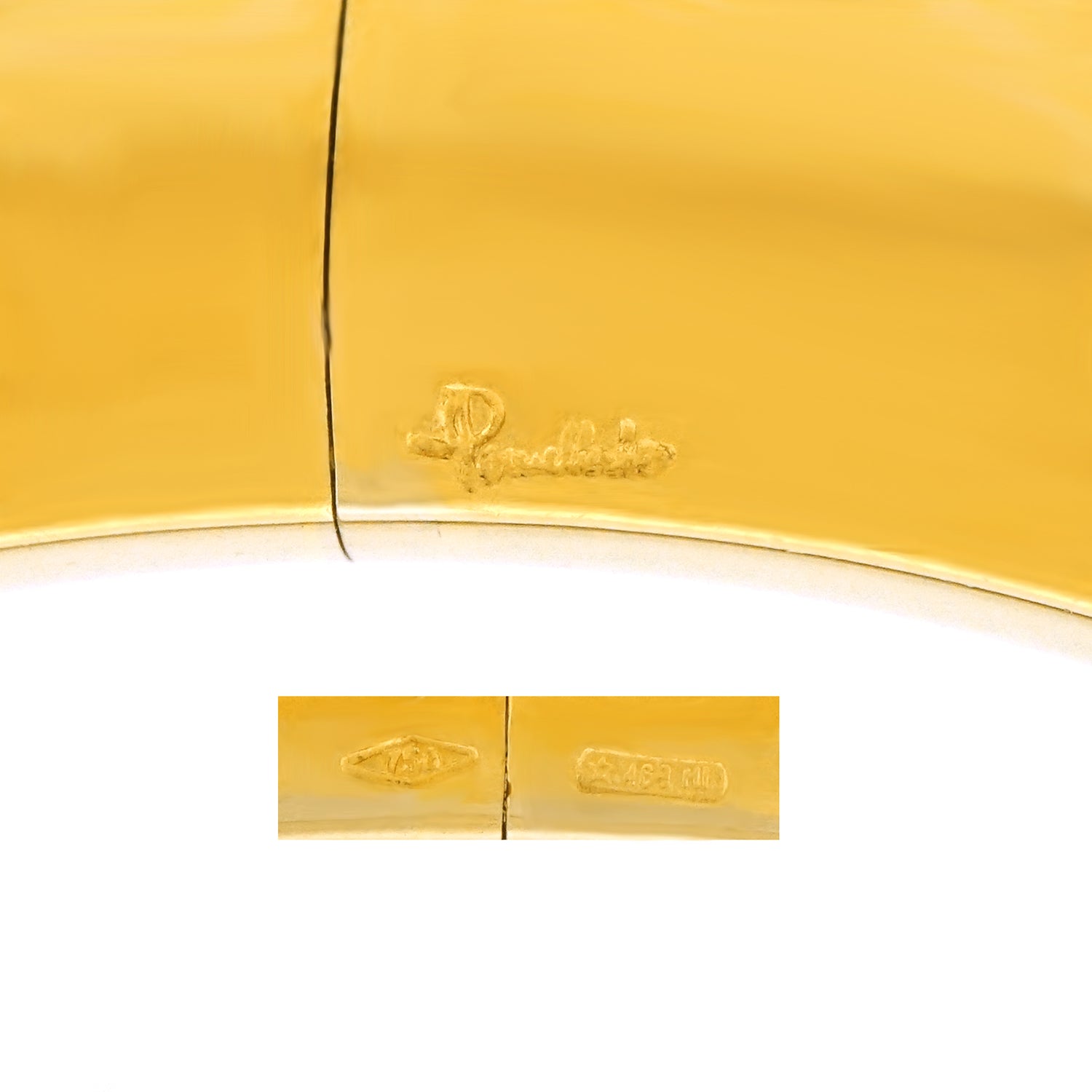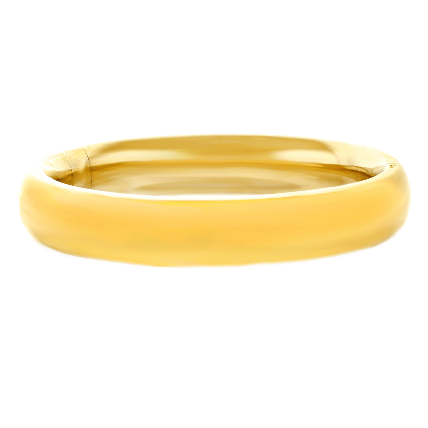 Circa 2000s, 18k, Pomellato, Italy. A seamless blend of art, contemporary design and sublime fashion, this bracelet has an elegant look that is underscored by brilliant craftsmanship. Pomellato leads the world in jewelry fashion. This yellow gold bangle bracelet makes the statement “Less is more” –or is it “More is more”? Heavy and finely fashioned in polished 18k yellow gold, it is exceedingly comfortable and its hidden hinge makes it delightfully easy to put on. Excellent condition.