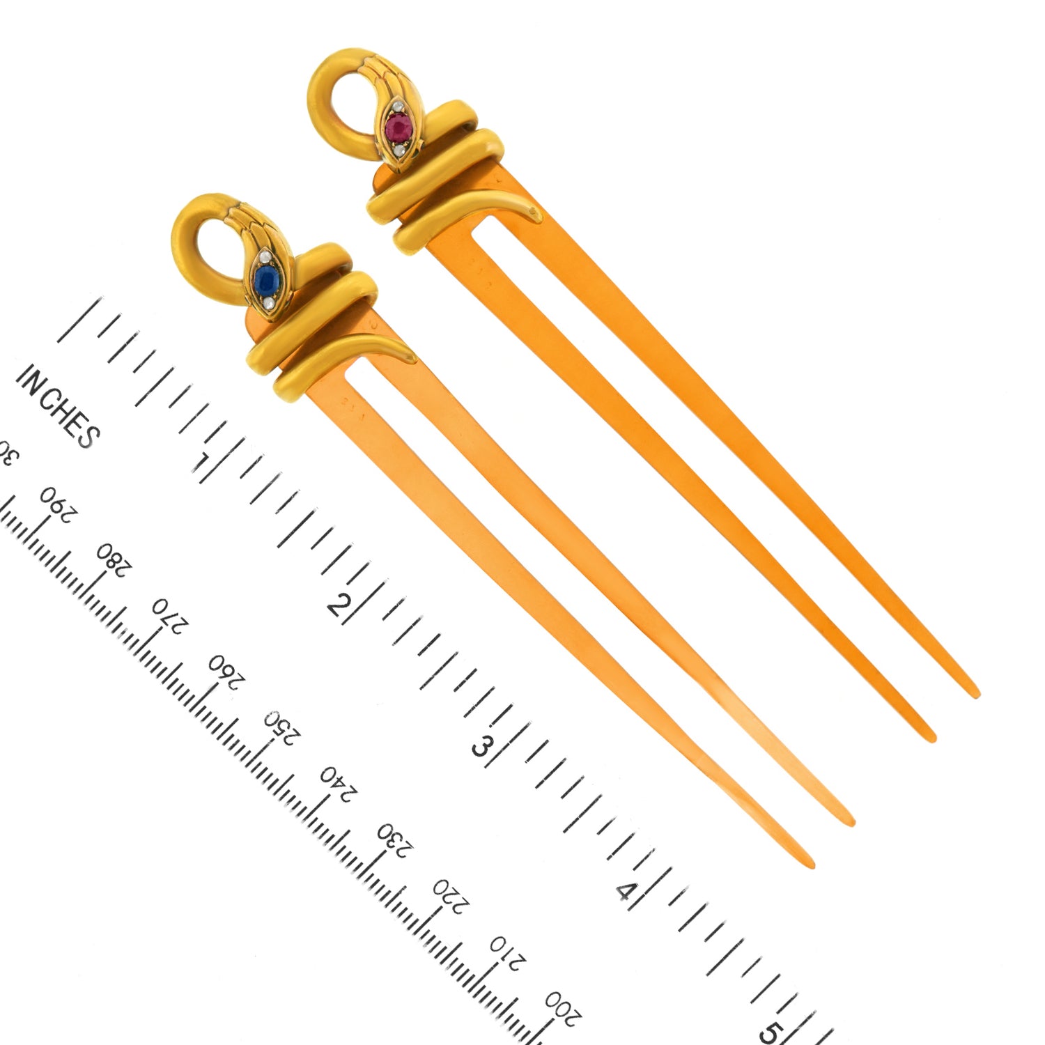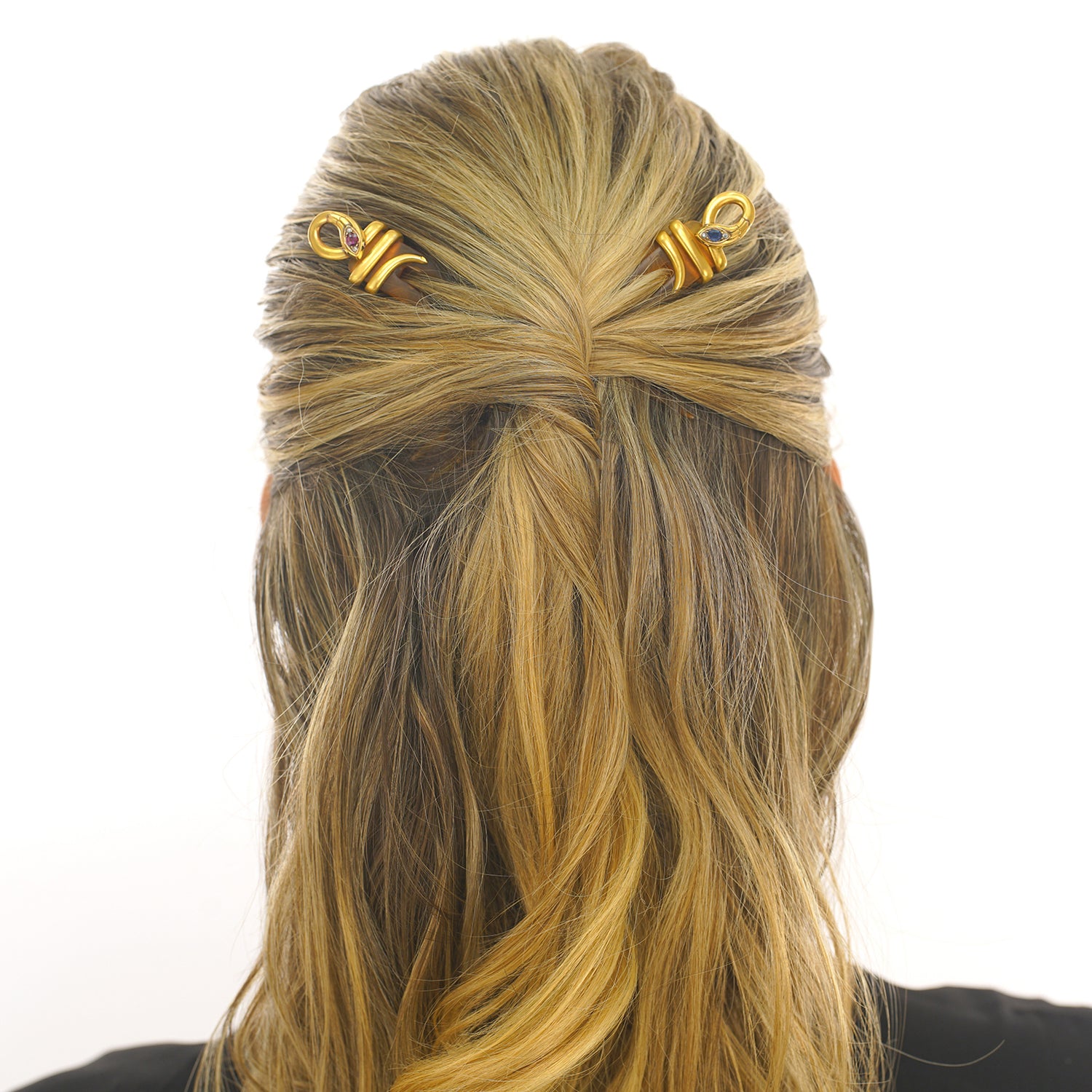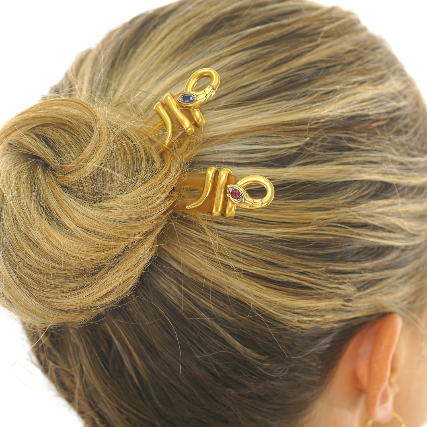 Circa 1890s, 18k, retailed by Chaumet, France. Ornamented with sapphire and ruby set 18k gold snakes, these hairpins from the renowned house of Chaumet, are one-of-a-kind delights. Retailed by Chaumet in the late 19th century, they add a mystical, exotic flair to any moment of fashion, then or now. Excellent condition.