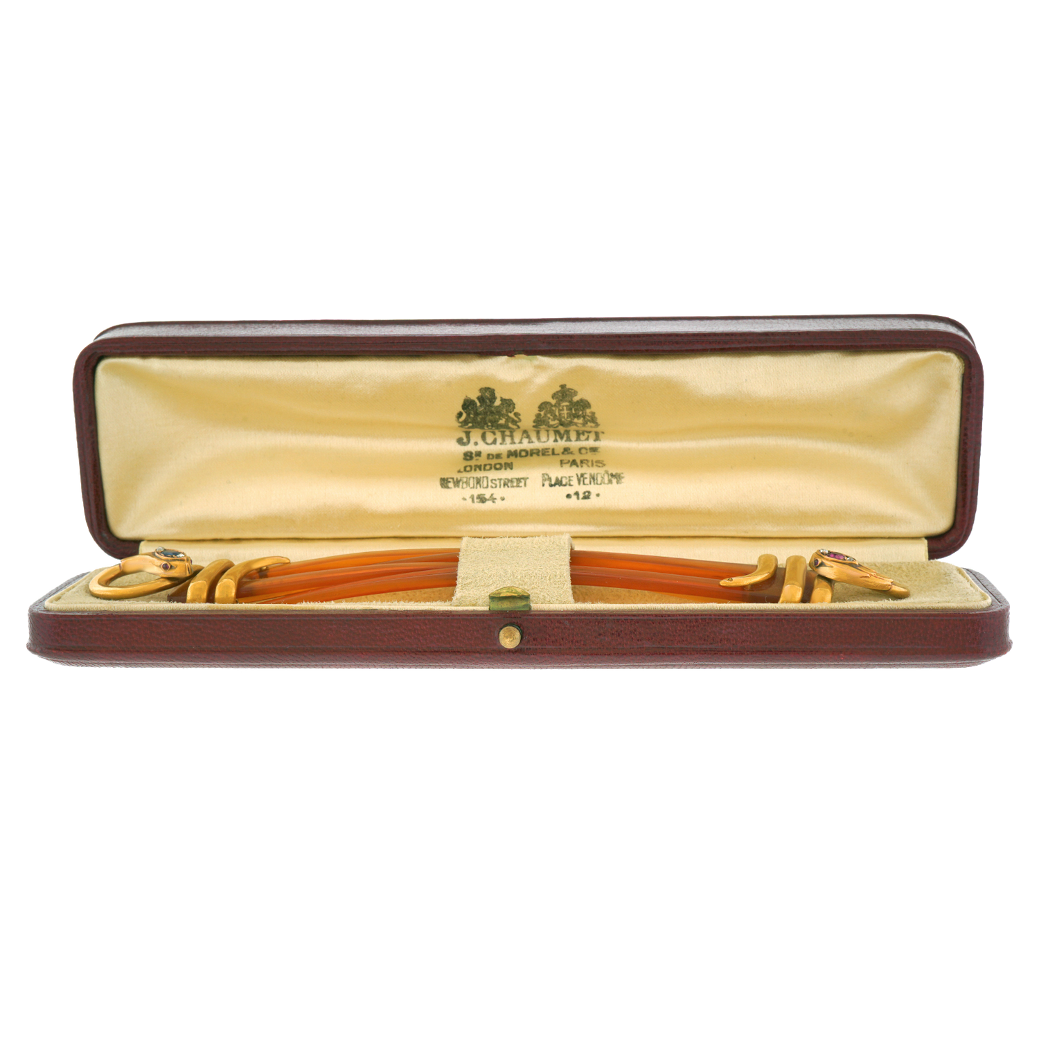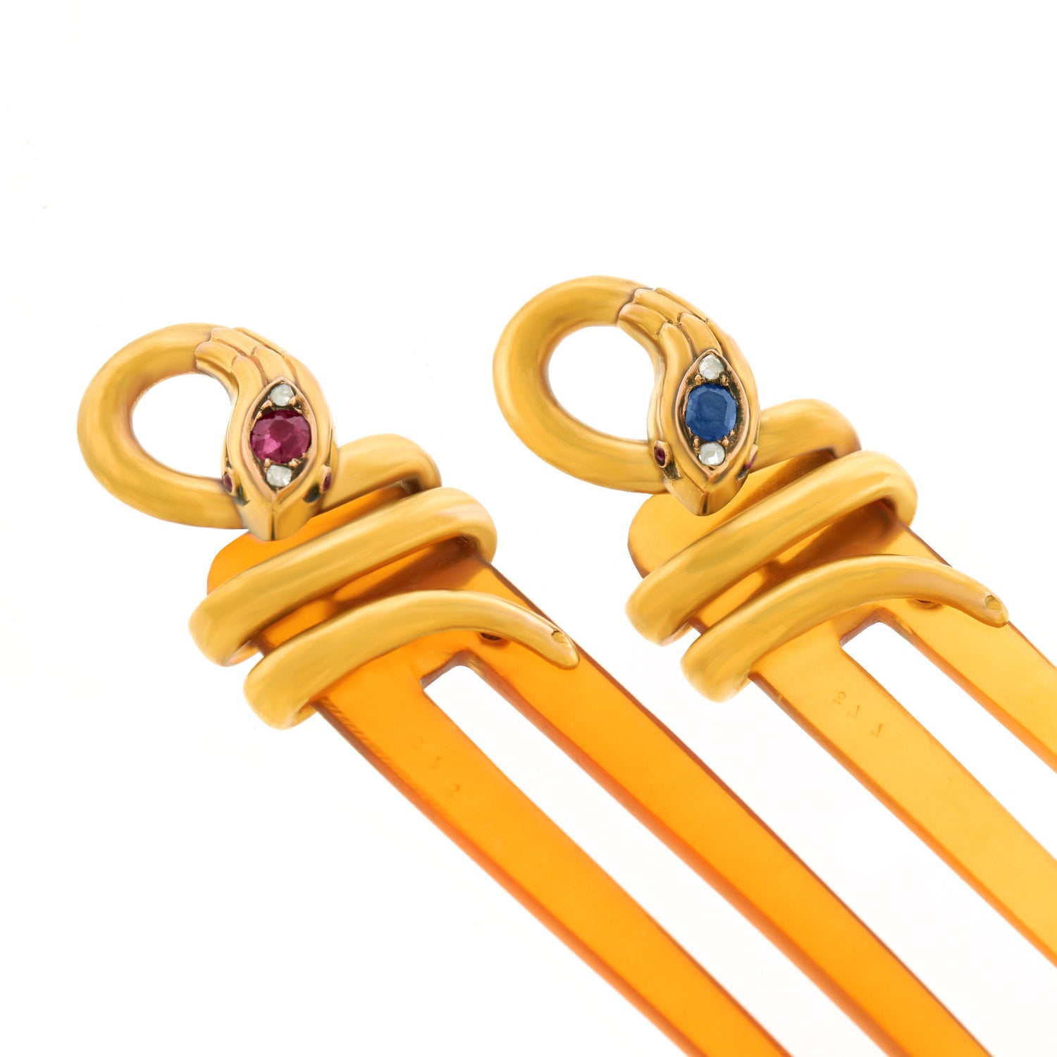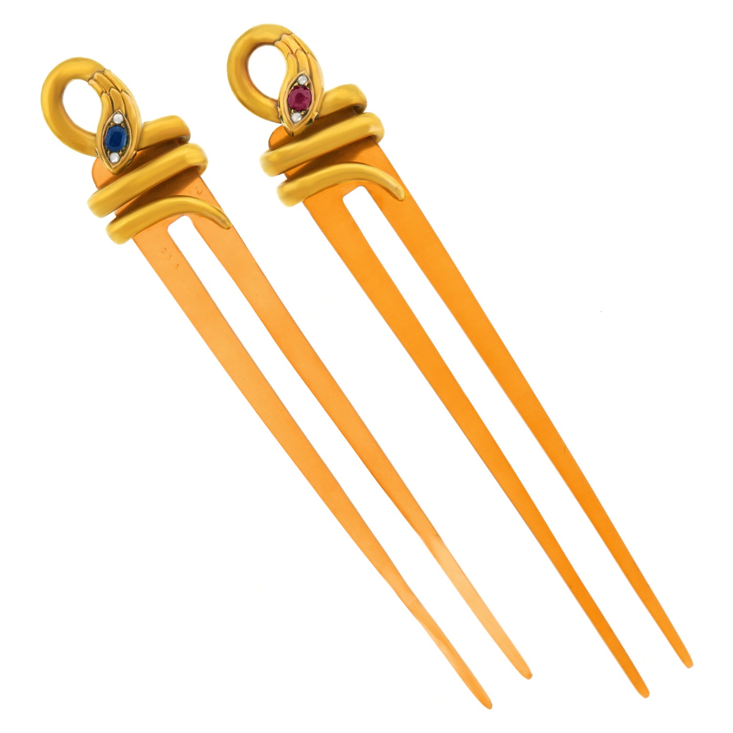 Circa 1890s, 18k, retailed by Chaumet, France. Ornamented with sapphire and ruby set 18k gold snakes, these hairpins from the renowned house of Chaumet, are one-of-a-kind delights. Retailed by Chaumet in the late 19th century, they add a mystical, exotic flair to any moment of fashion, then or now. Excellent condition.