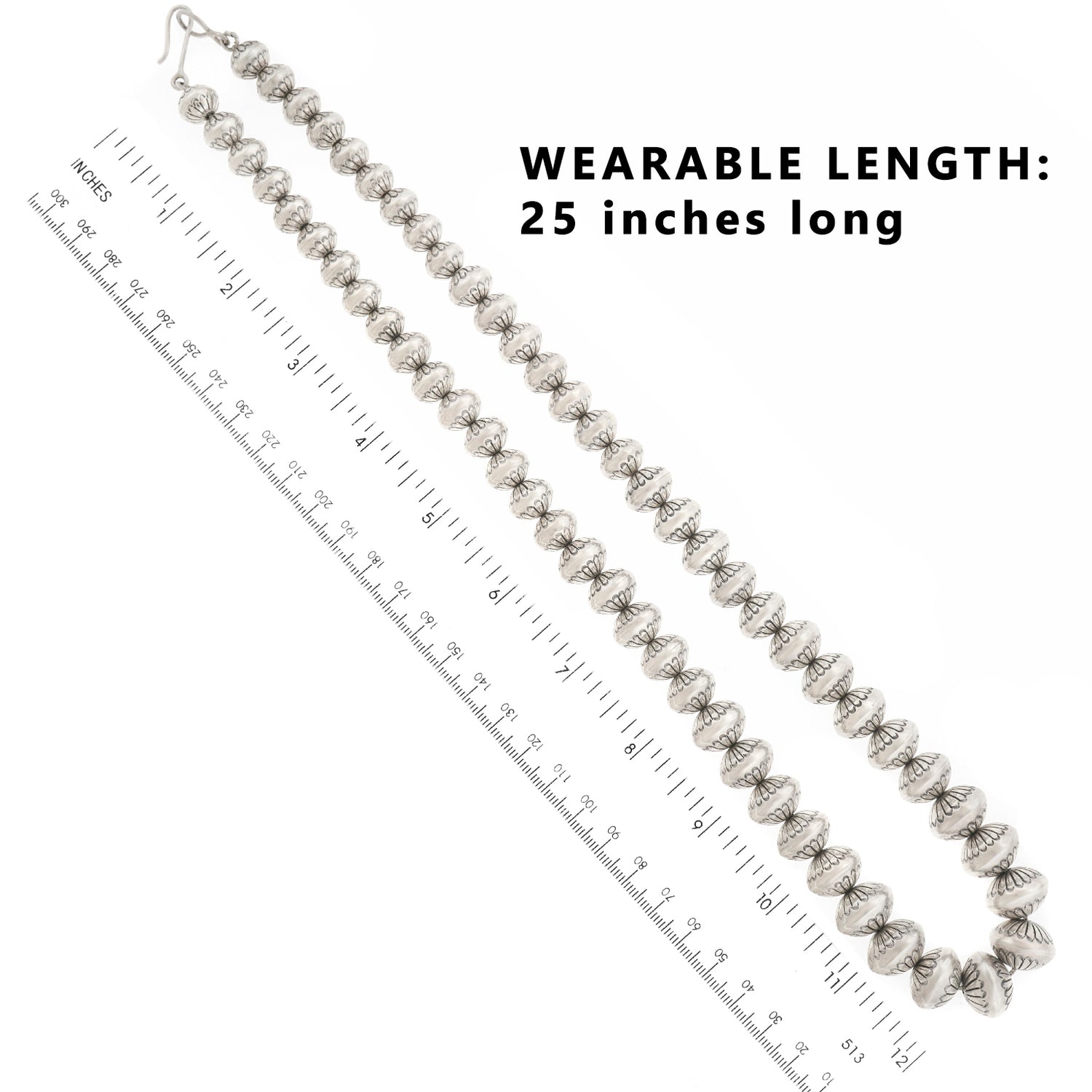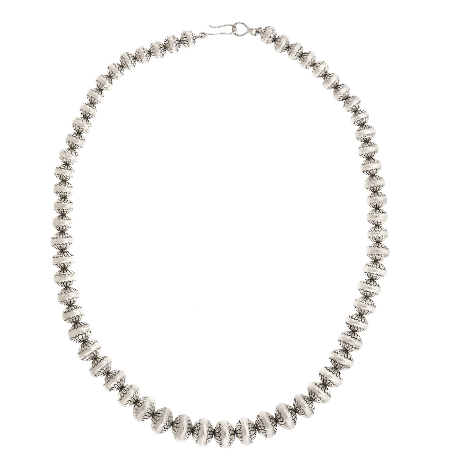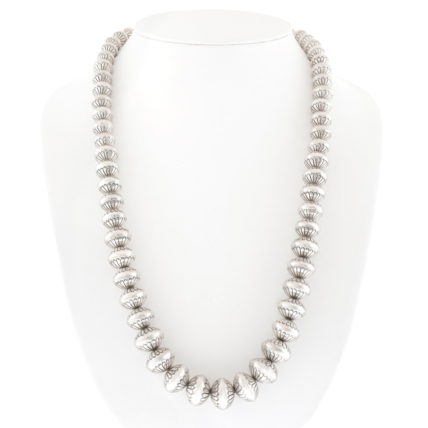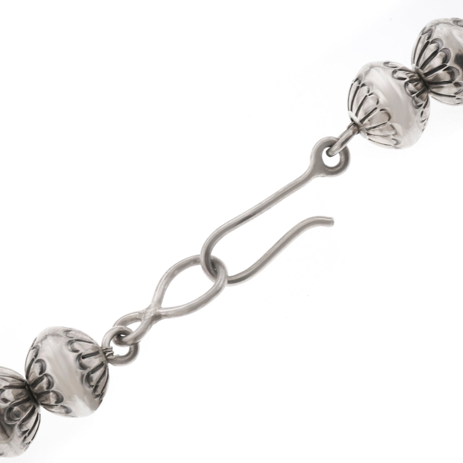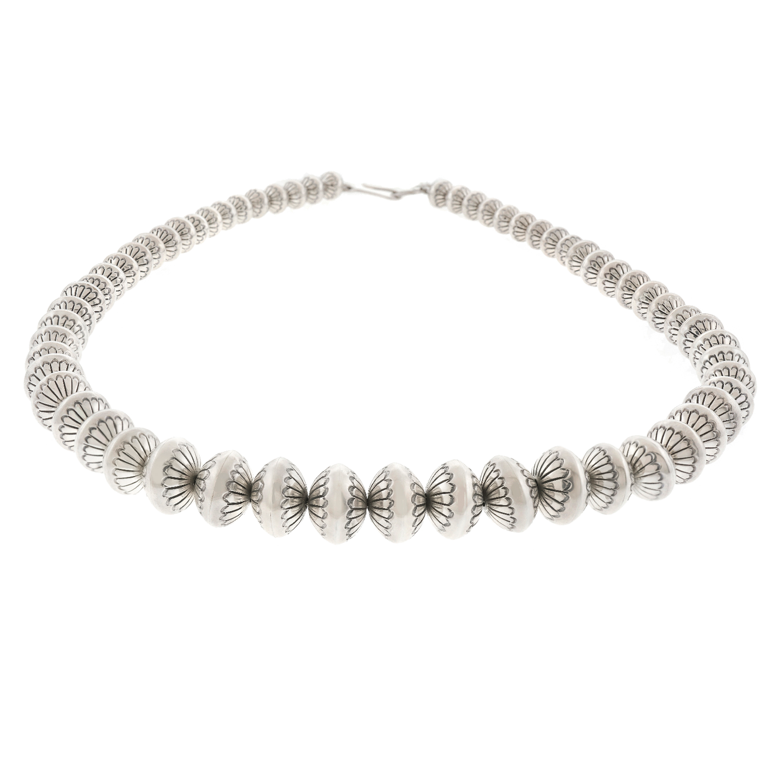 Circa 1980s, sterling, Navajo. This Navajo necklace features graduated Concho-stamped beads. Their large size, heavy construction in sterling, and superb design make this a uniquely stylish strand. Excellent condition.