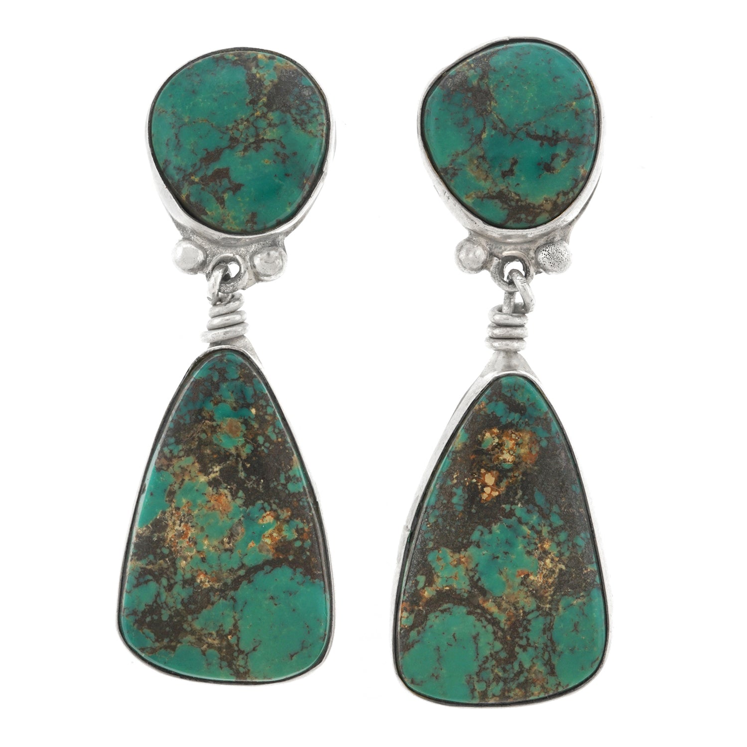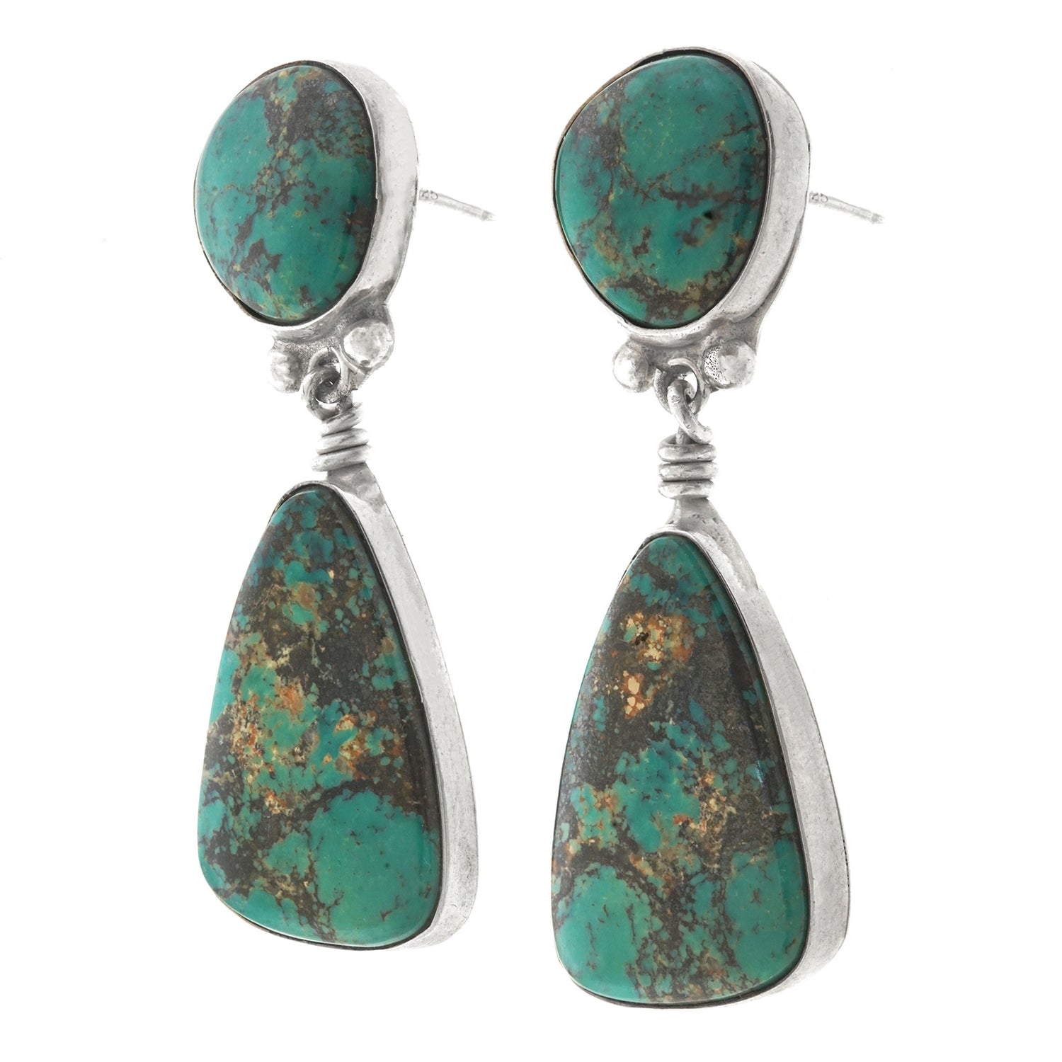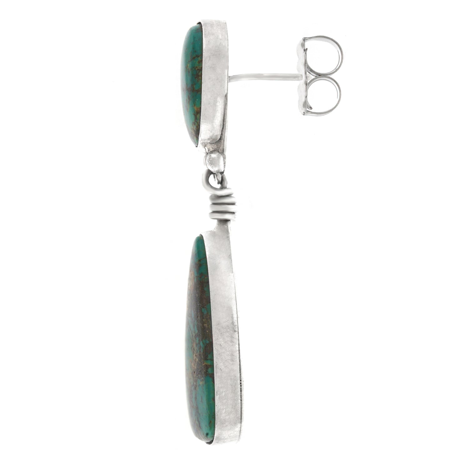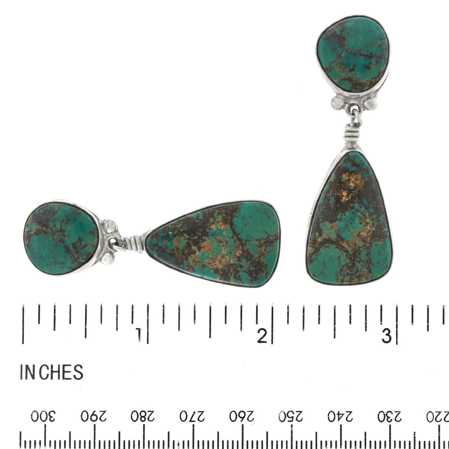 Circa 1980s, Sterling, By David Lister, Navajo. These 2 and 3/4s inch long Navajo earrings are set with gorgeous matrix turquoise in sterling silver. The look is effortless American style. Excellent condition.