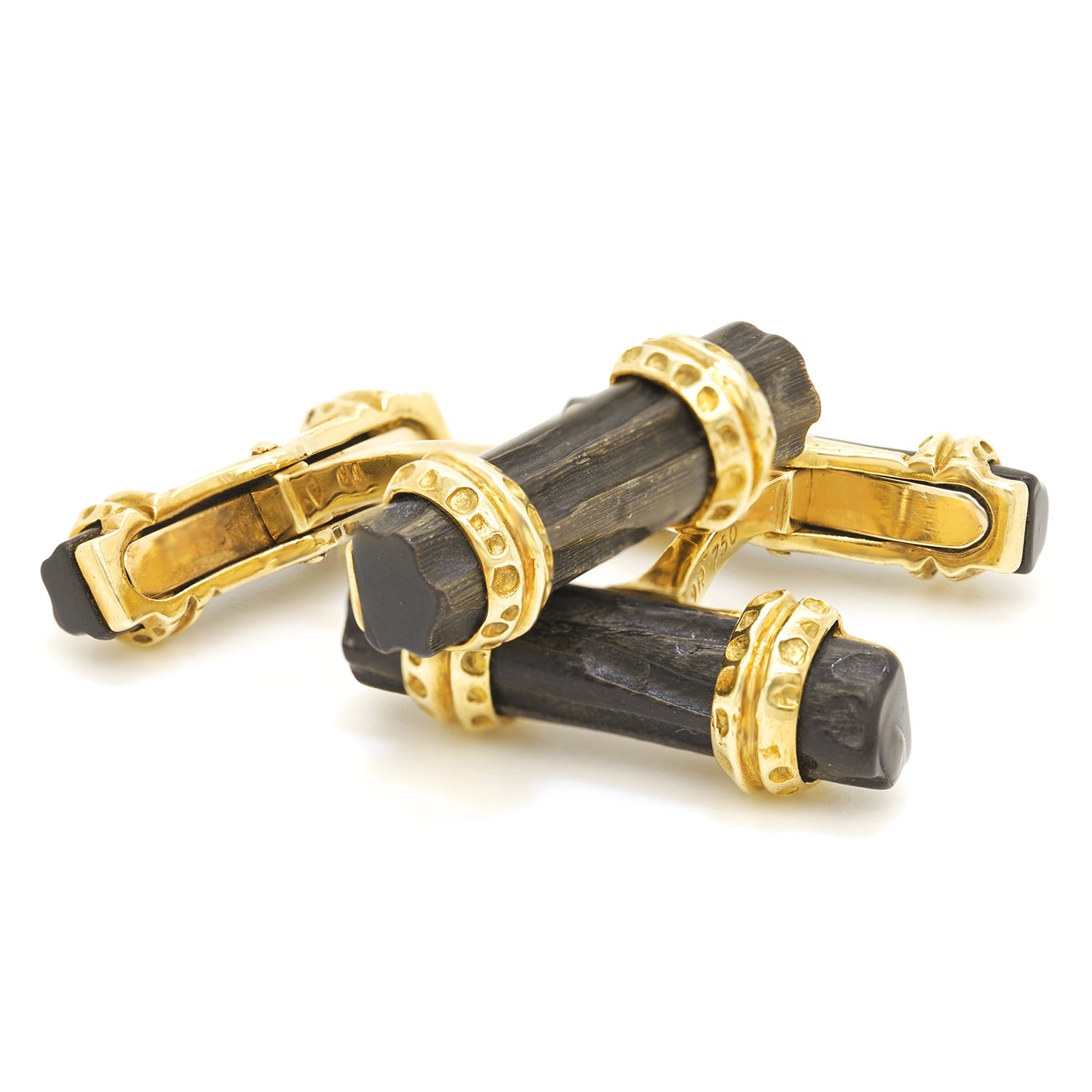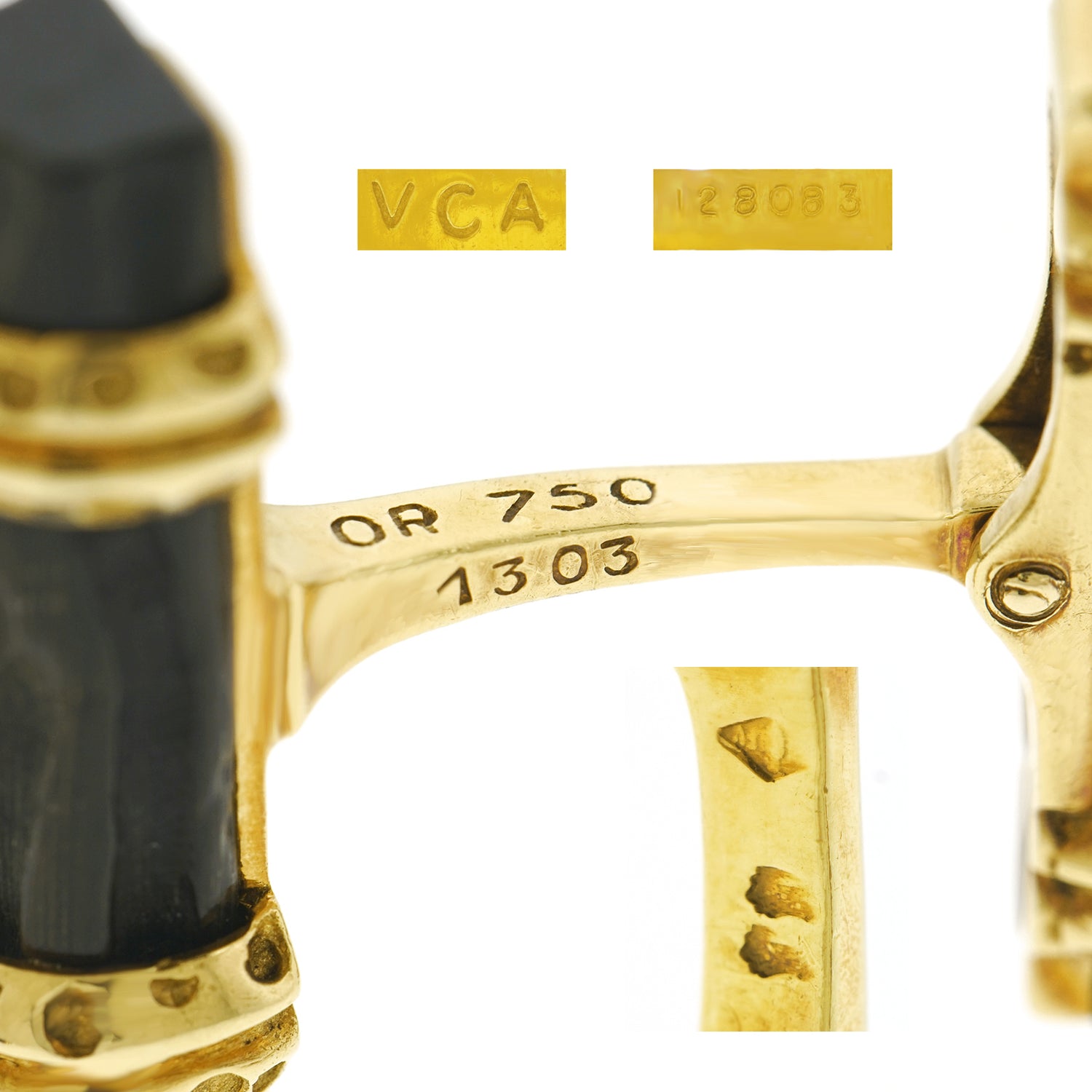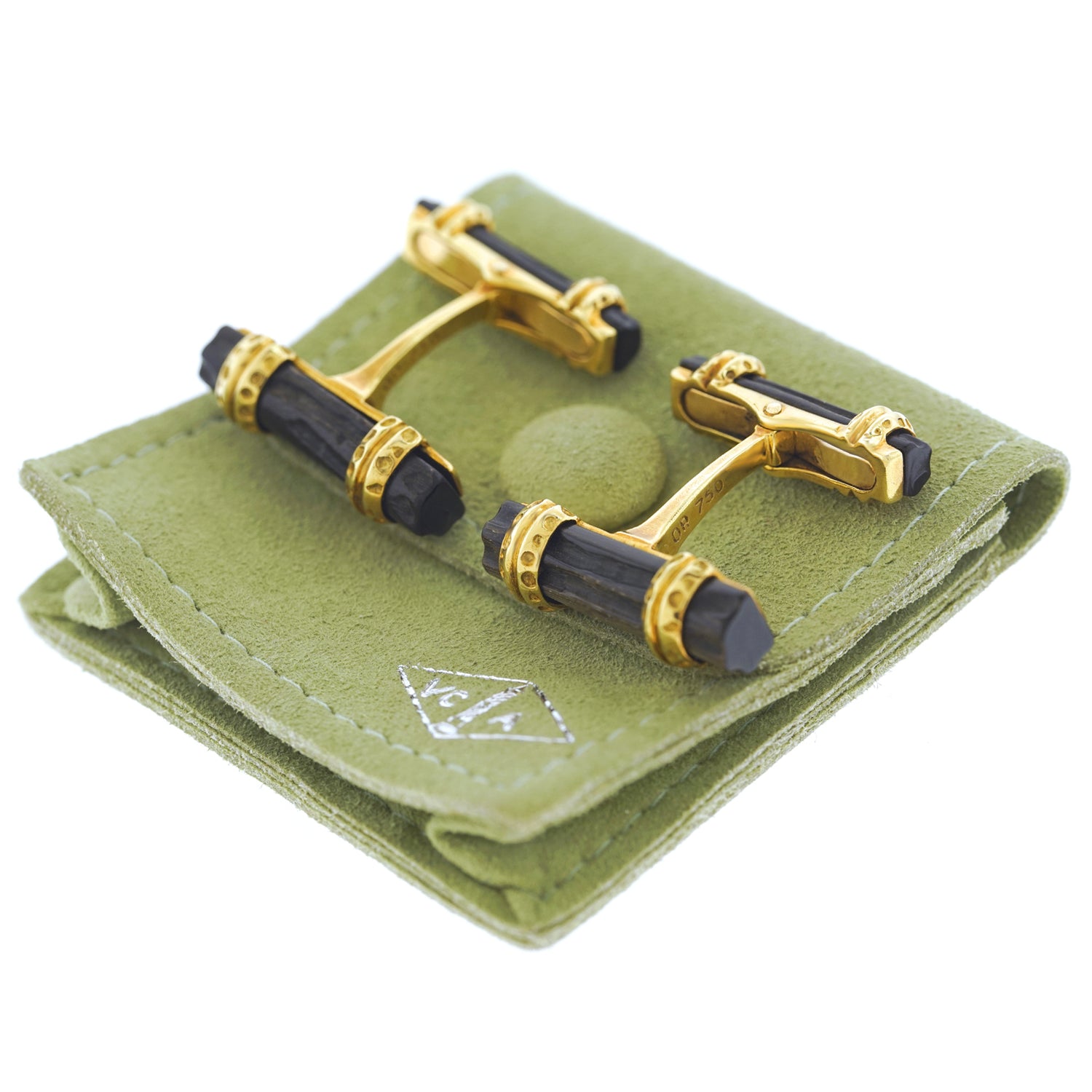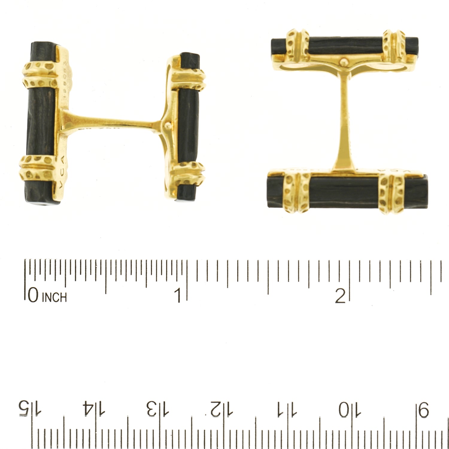 Circa 1960s 18k by Van Cleef and Arpels, France. VCA is known for stylishly elegant cufflinks … Well, for stylishly elegant everything! Set with carved black coral in a brutalist motif, these urbane examples of their work are perfect for any occasion. Excellent condition.