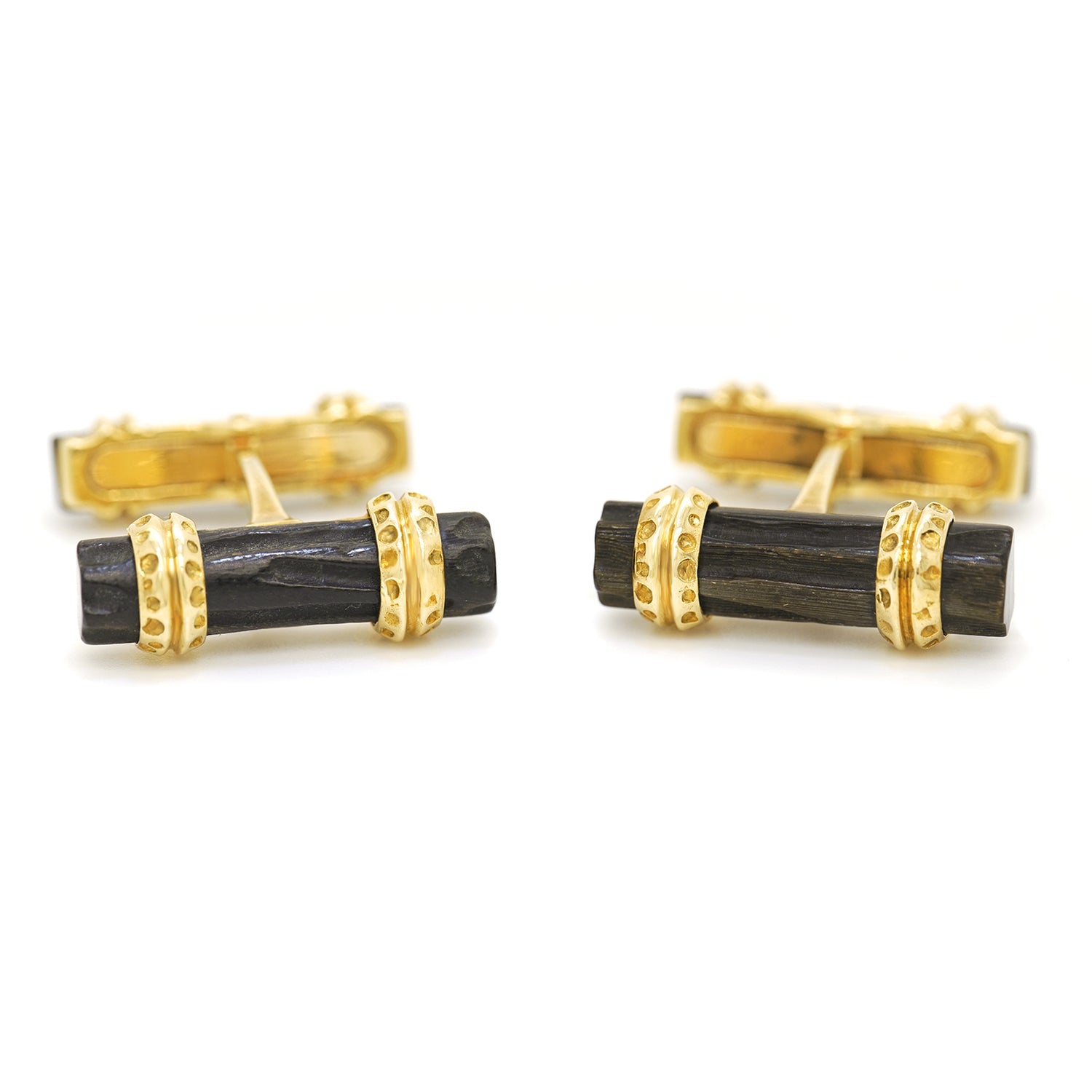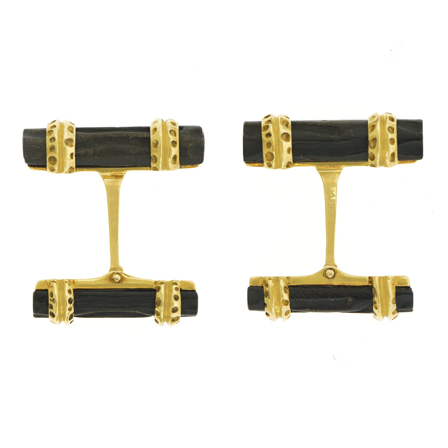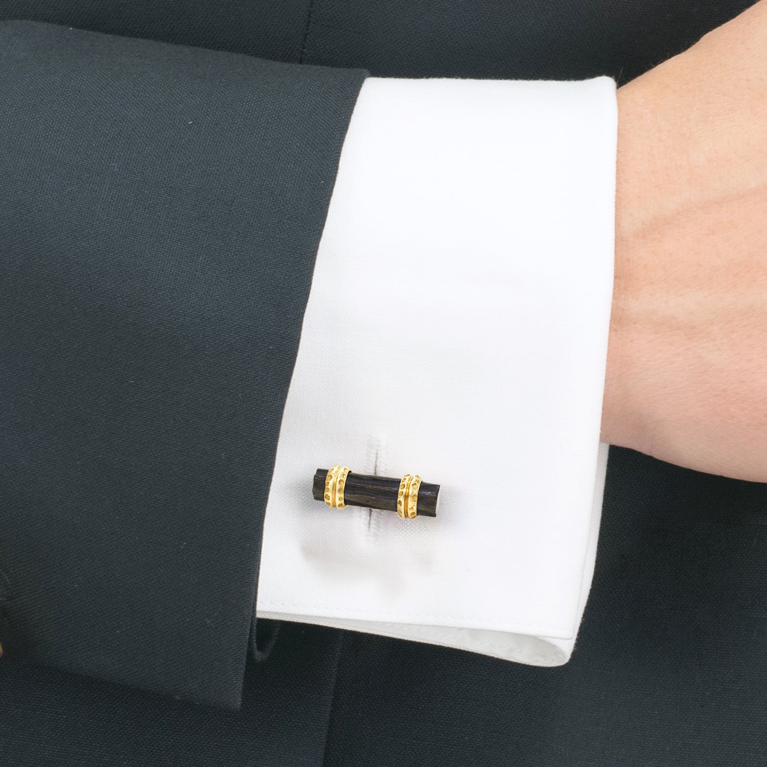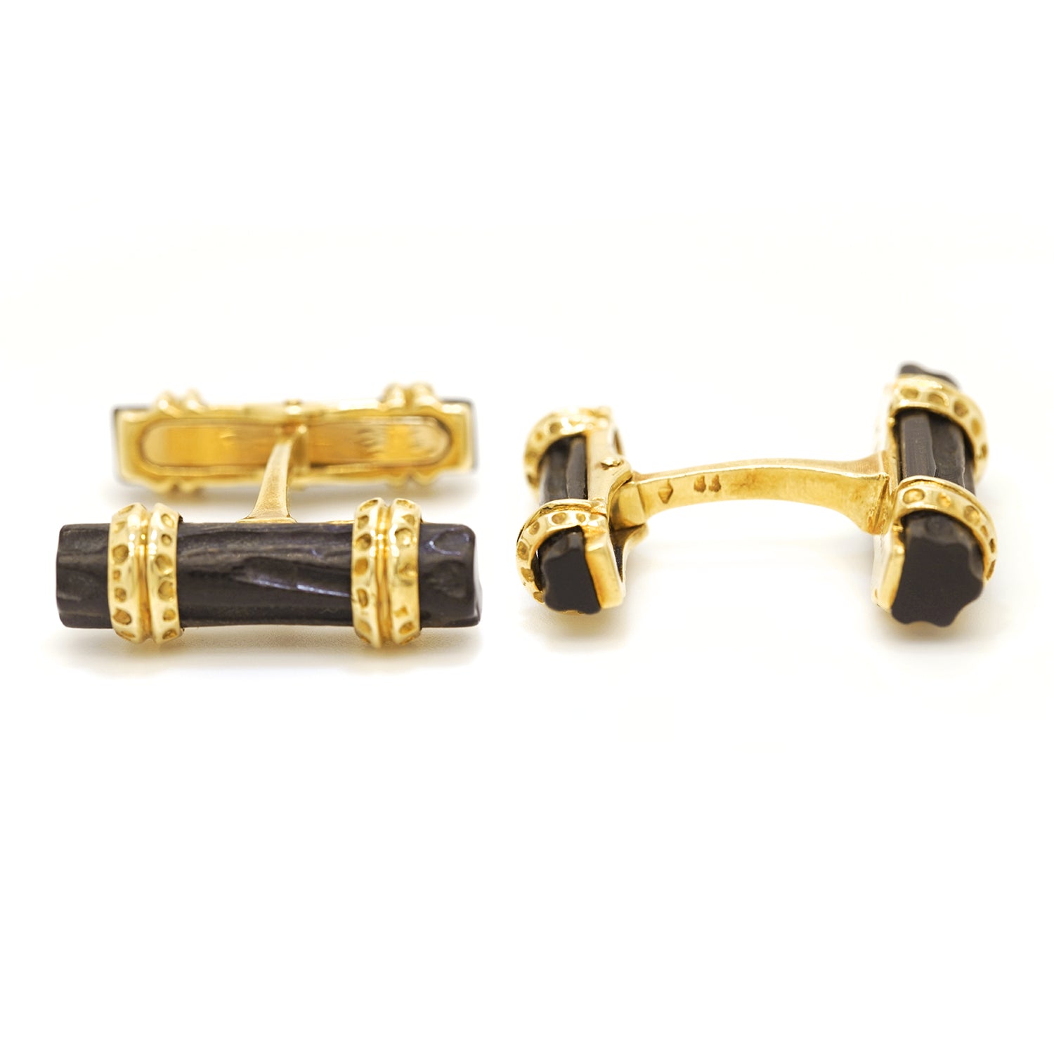 Circa 1960s 18k by Van Cleef and Arpels, France. VCA is known for stylishly elegant cufflinks … Well, for stylishly elegant everything! Set with carved black coral in a brutalist motif, these urbane examples of their work are perfect for any occasion. Excellent condition.