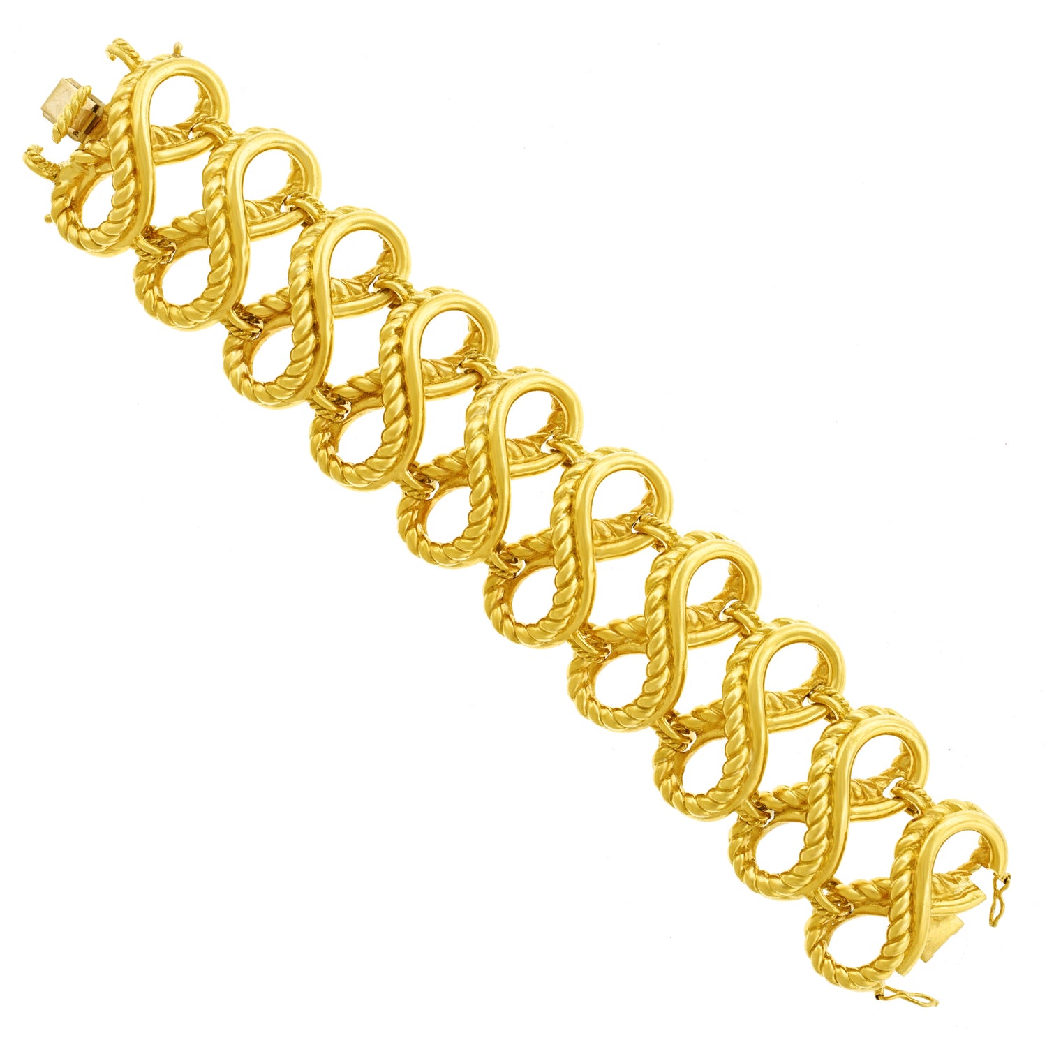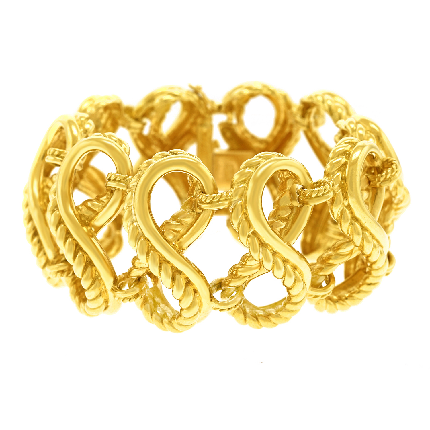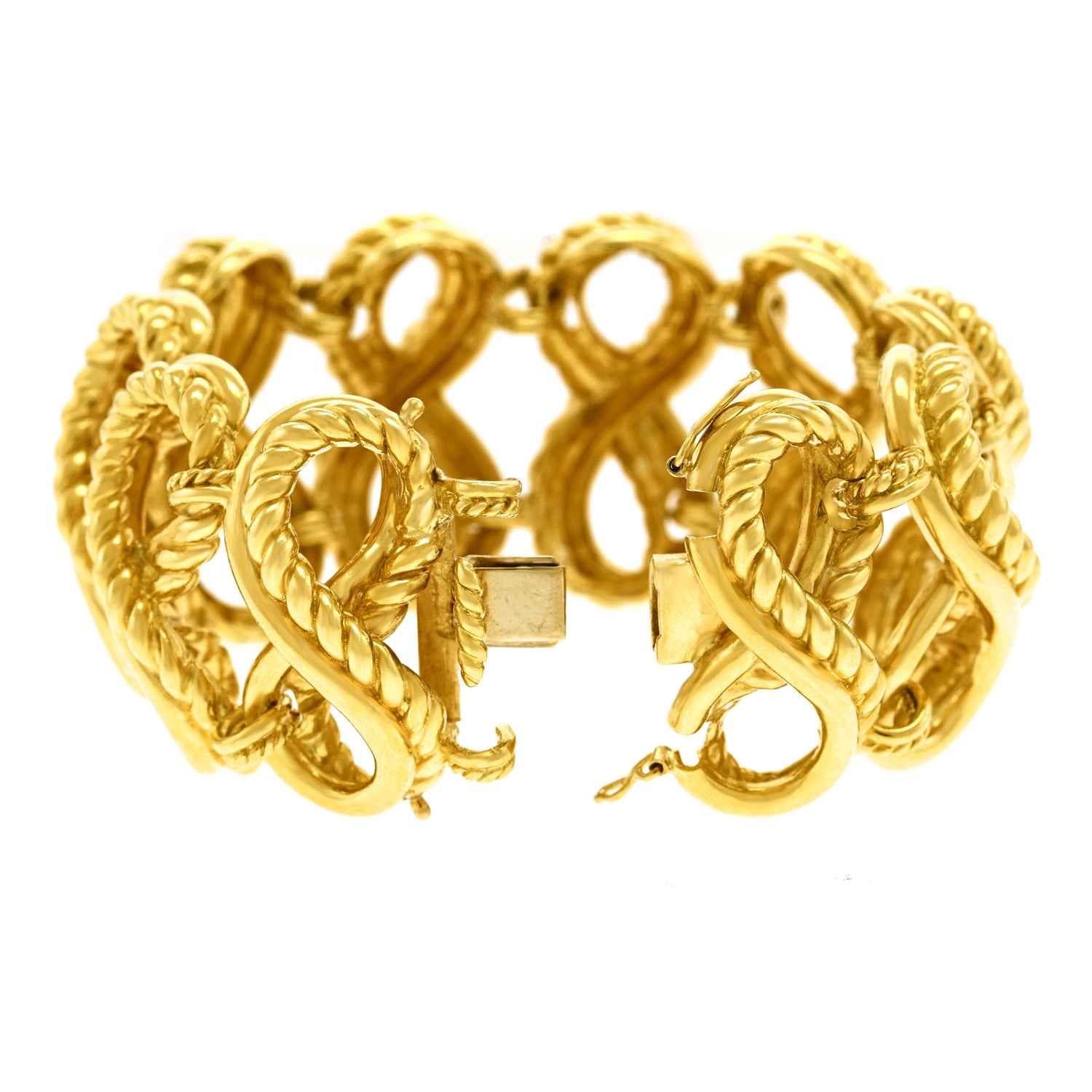 Circa 1970s, 18k, by Tiffany & Co. With a WOW! factor of 12 on the 10 scale, this bracelet is stylistically brilliant. Generous in size, heavy, and beautifully made, it is also very comfortable on, or in other words -- the look and feel are classic Tiffany. Originally purchased at the Zurich store, this is a fabulous example of European-made Tiffany. Excellent condition.