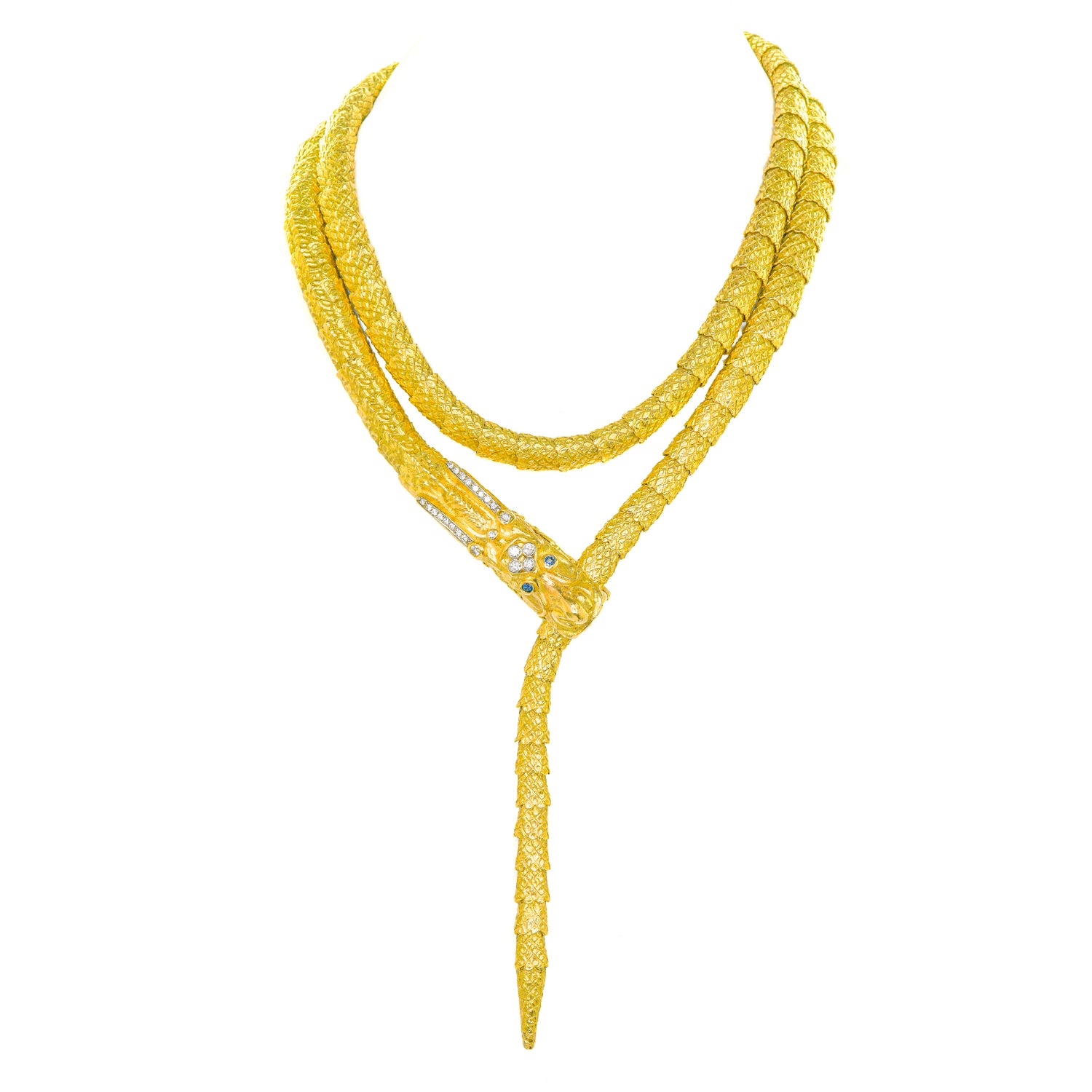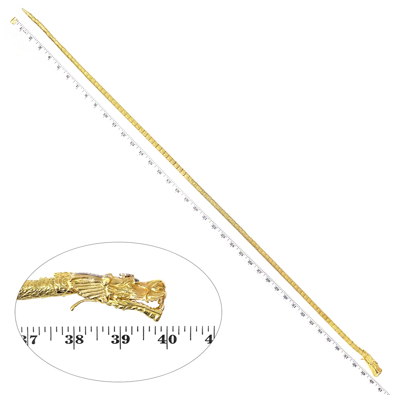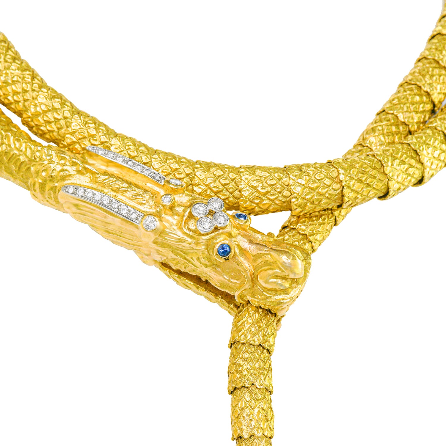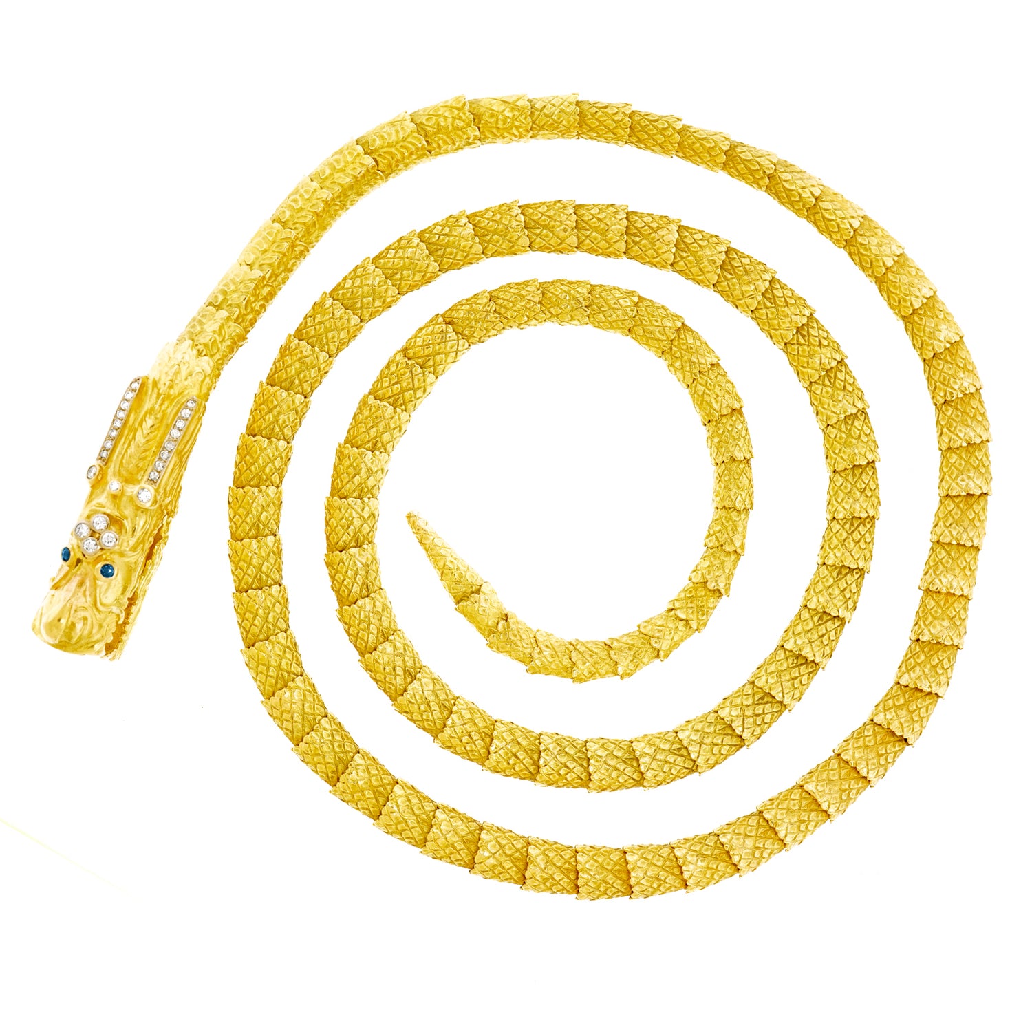 Circa 1960s, 18k, by Nussberger, Switzerland. This brilliantly sixties necklace is a pop art chinoiserie triumph! Very long (40 inches) and very heavy, it can be worn looped once or twice about the neck, hanging down the back or slung on the hip as a belt. Known for their superior skills as goldsmiths, Nussberger pieces are shown in textbooks as examples of superb workmanship. This necklace is no exception. The craftsmanship is magnificent. Excellent condition.