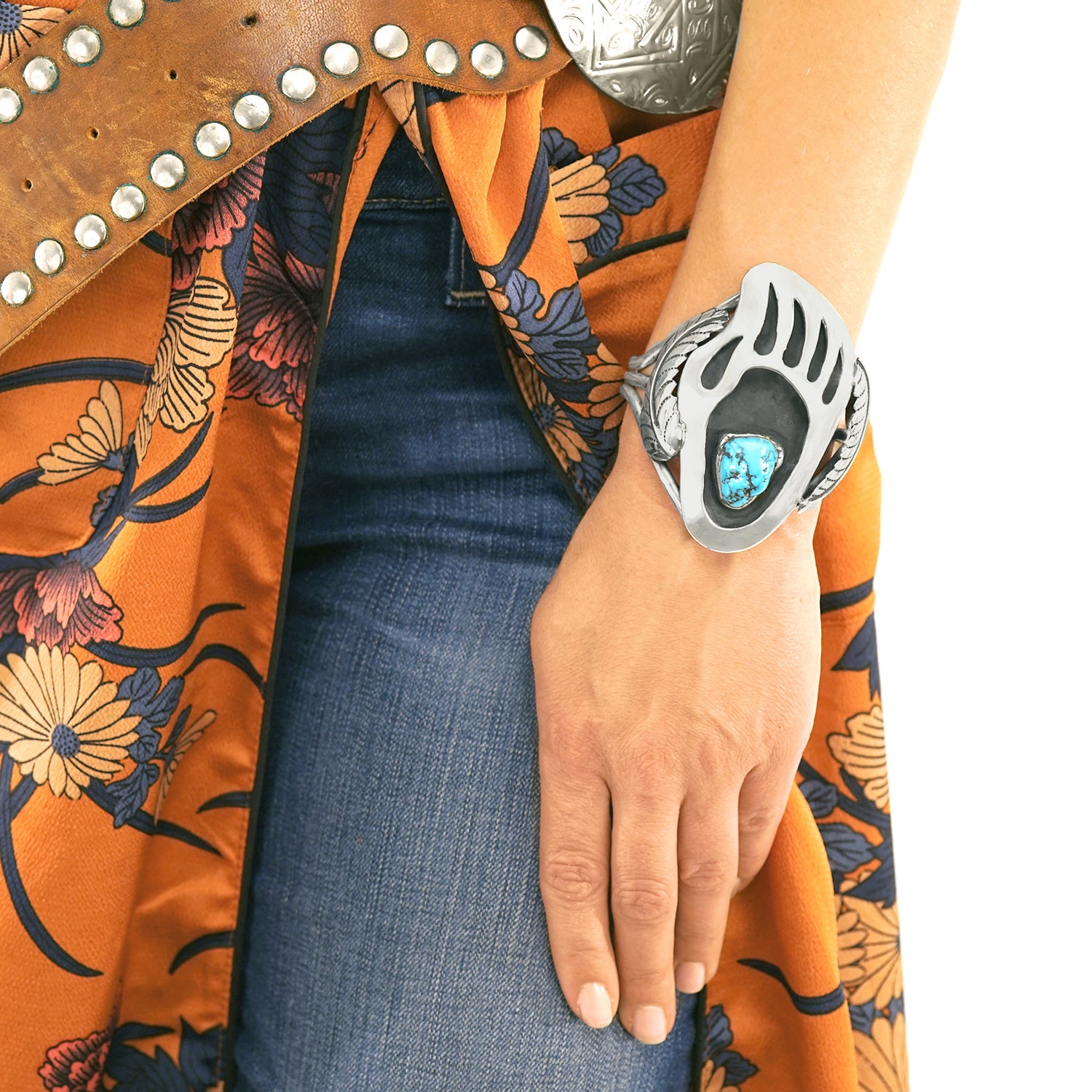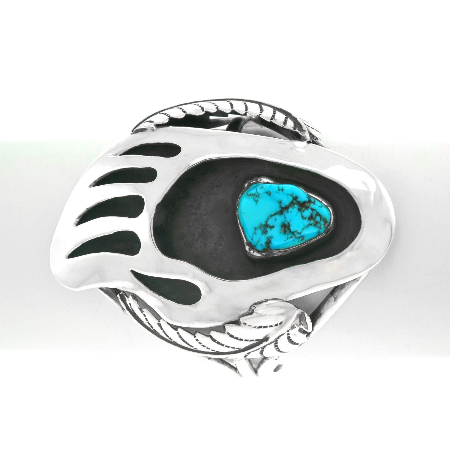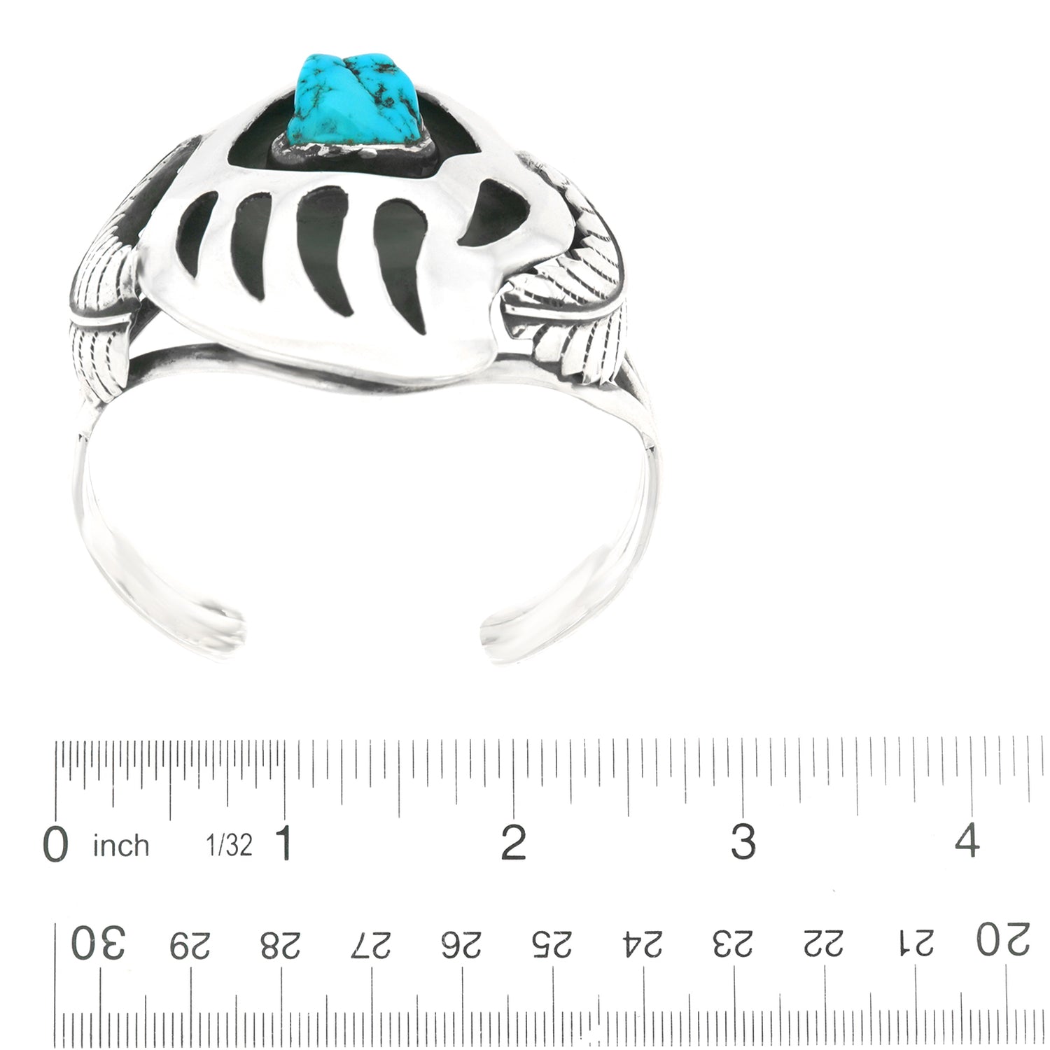 Circa 1980s, Sterling, Navajo, American. Mixing Bear claw and Leaf motifs with a shadowbox form centered by a finely hued turquoise, this Navajo bracelet tells a story. Fashion finds a mystical moment of reflection while effortlessly dressing up or down. Handmade it is in excellent condition.