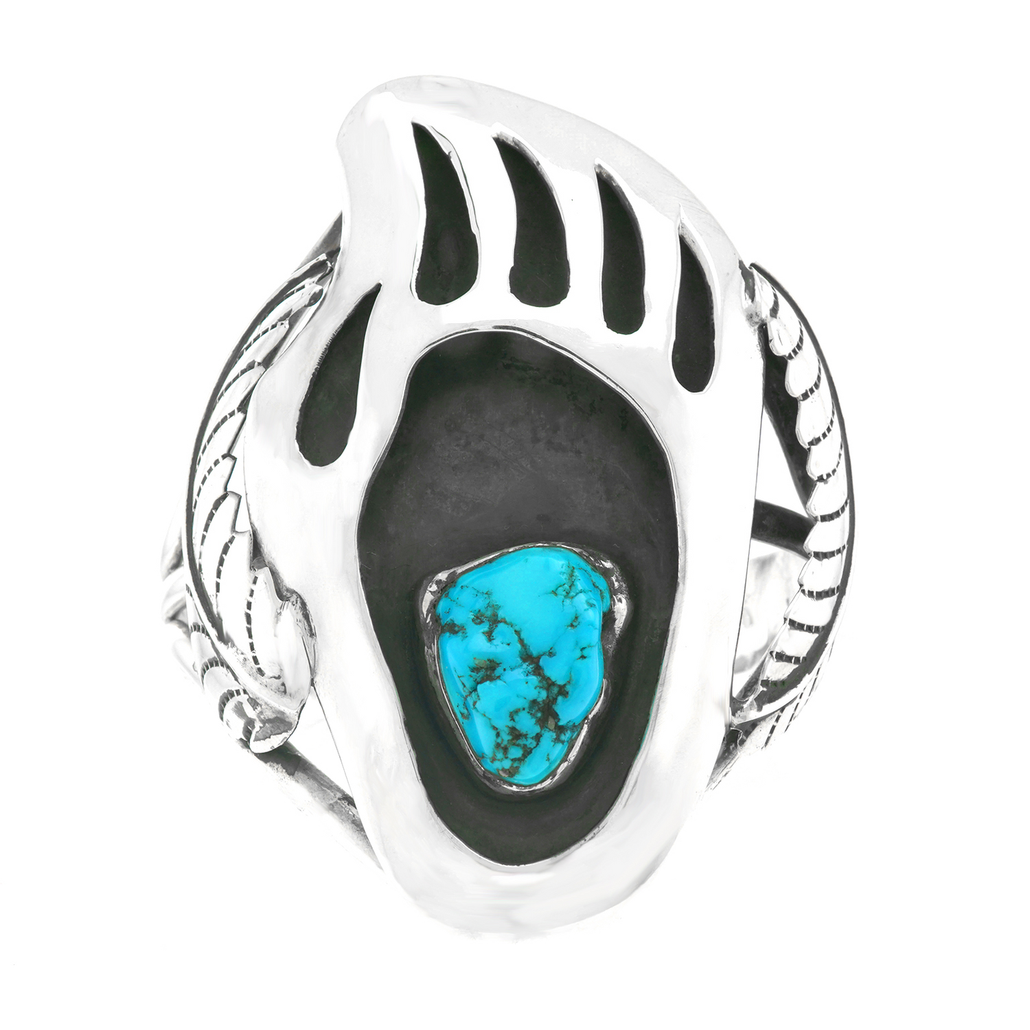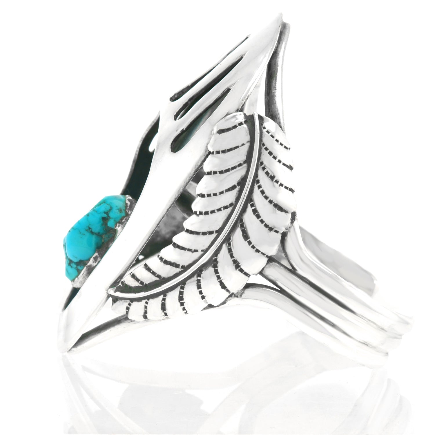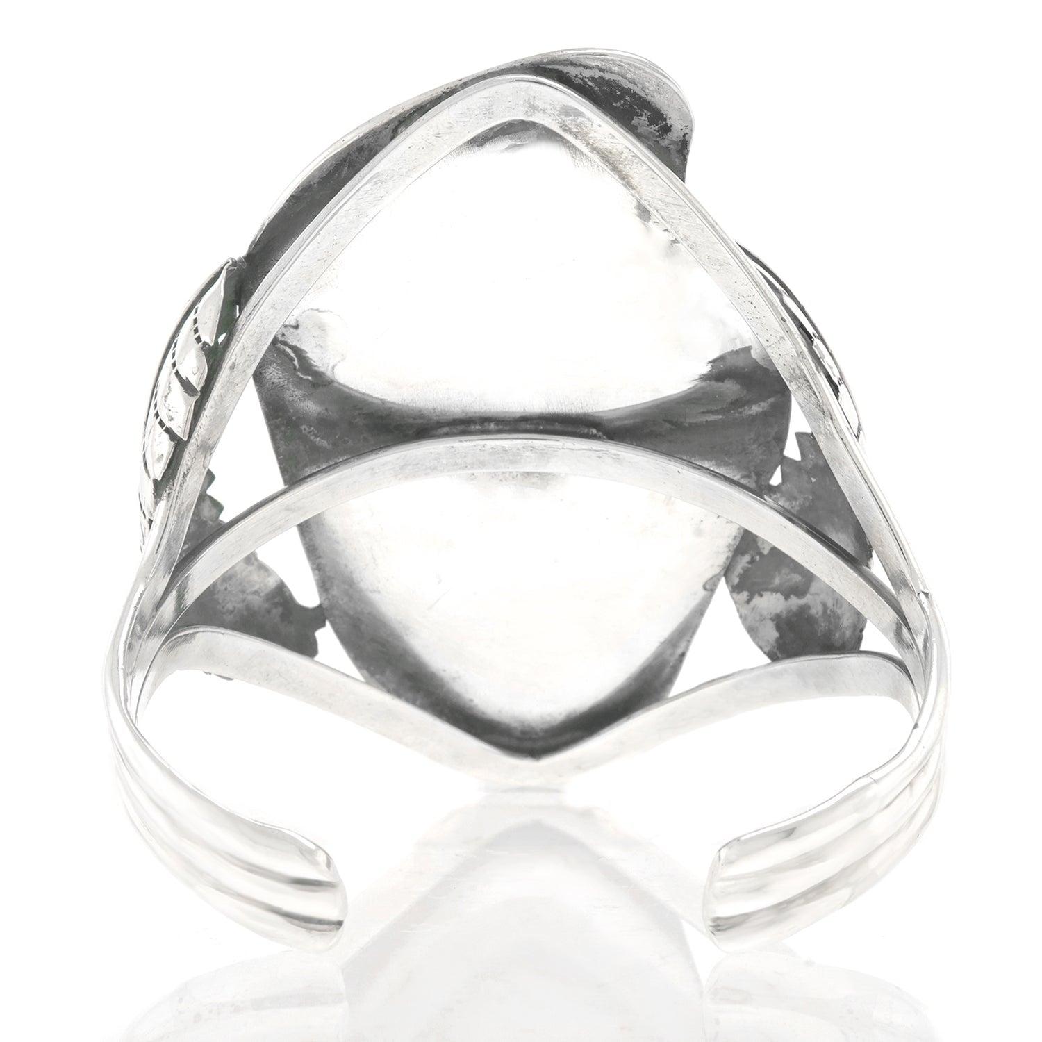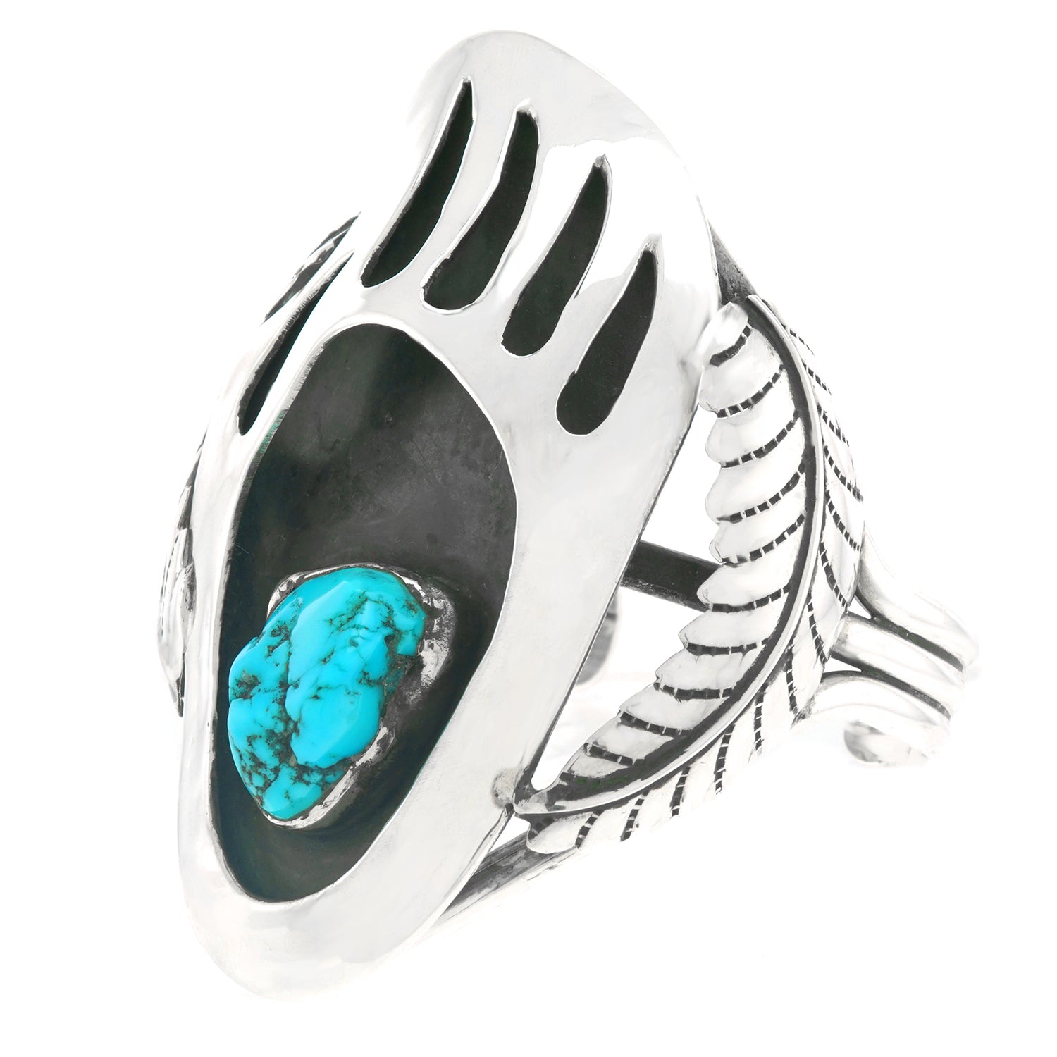 Circa 1980s, Sterling, Navajo, American. Mixing Bear claw and Leaf motifs with a shadowbox form centered by a finely hued turquoise, this Navajo bracelet tells a story. Fashion finds a mystical moment of reflection while effortlessly dressing up or down. Handmade it is in excellent condition.