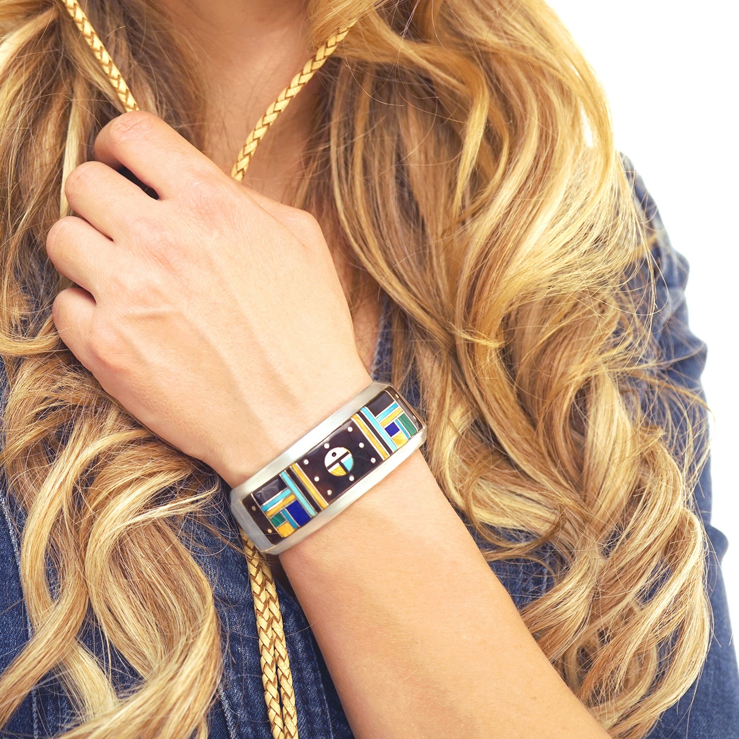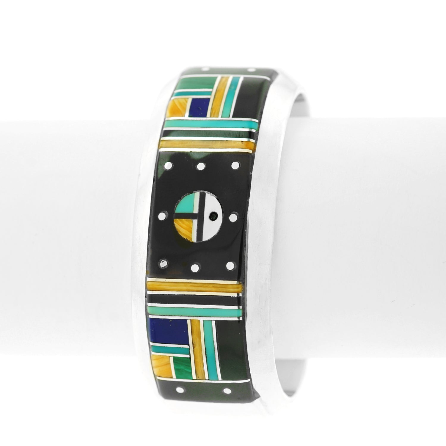 Circa 1980-90s, Sterling, Zuni. This gorgeous stone inlay bracelet is brilliantly colorful and fabulously chic. Transcendent from traditional to modern, it displays blanket geometrics, night sky and Sun God motifs, woven together creating a fiercely beautiful visual narrative. Excellent condition.