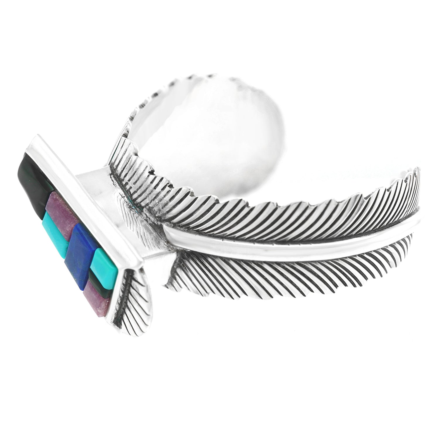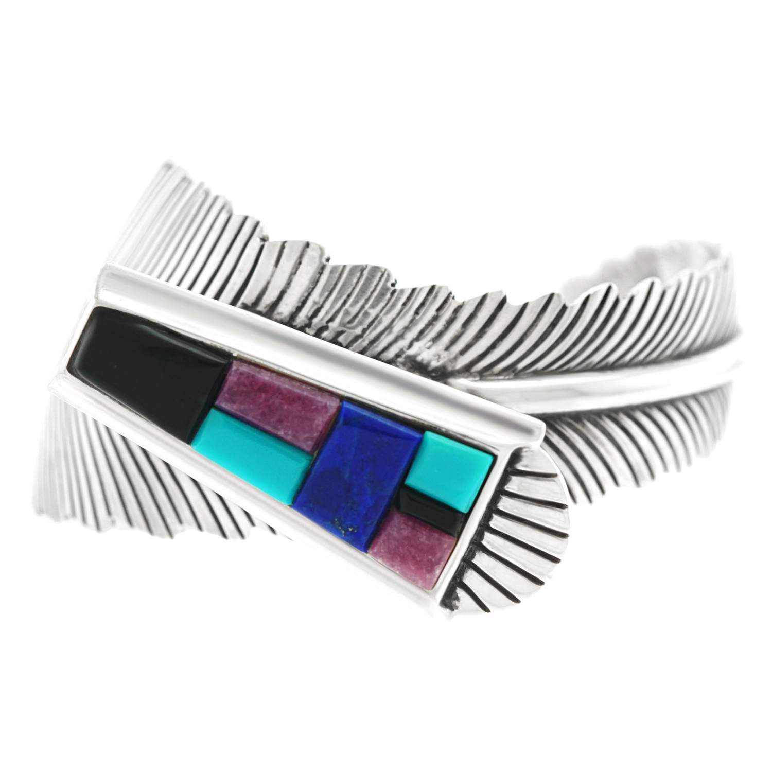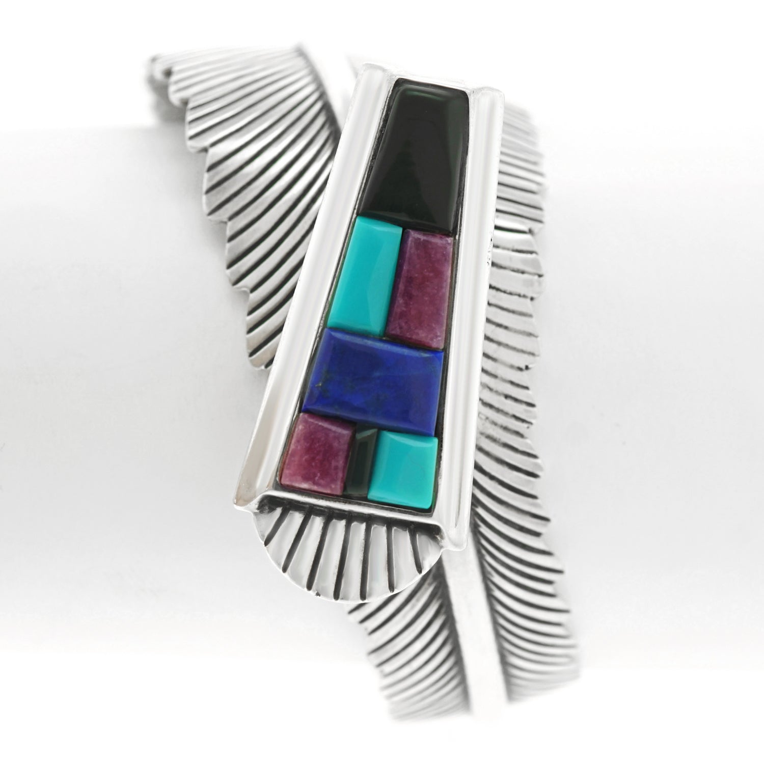 Circa 1990s, Sterling, by John Nelson, Navajo, American. This gorgeous Navajo bracelet is brilliantly colorful and fabulously chic. Transcendent from traditional to modern, it features a cobblestone motif over figural silver feathers. Finely hand-fashioned, it is in excellent condition.