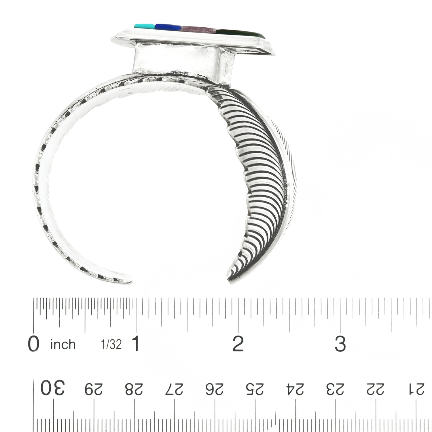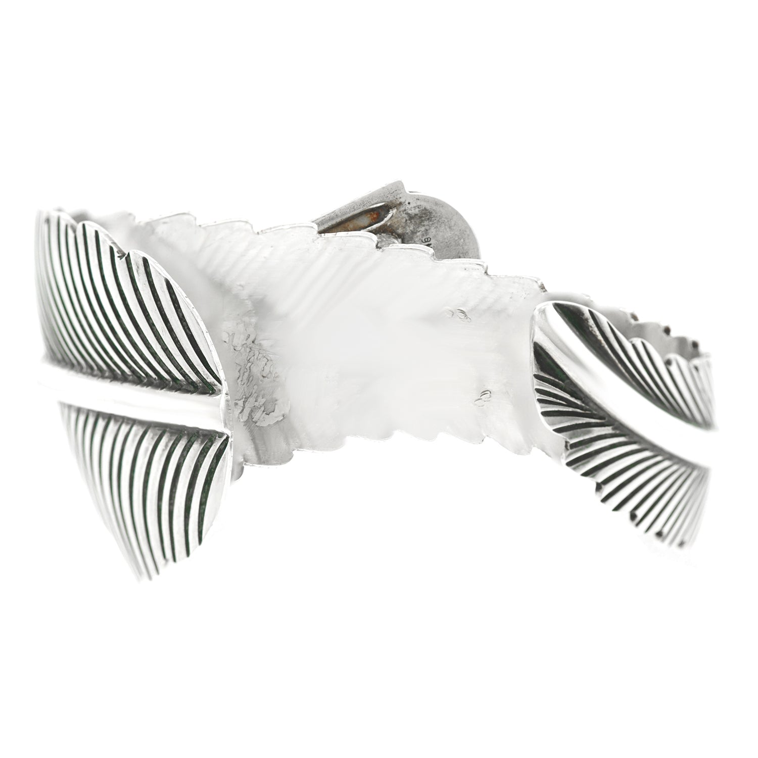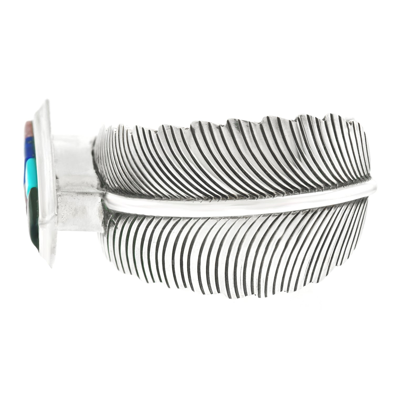 Circa 1990s, Sterling, by John Nelson, Navajo, American. This gorgeous Navajo bracelet is brilliantly colorful and fabulously chic. Transcendent from traditional to modern, it features a cobblestone motif over figural silver feathers. Finely hand-fashioned, it is in excellent condition.