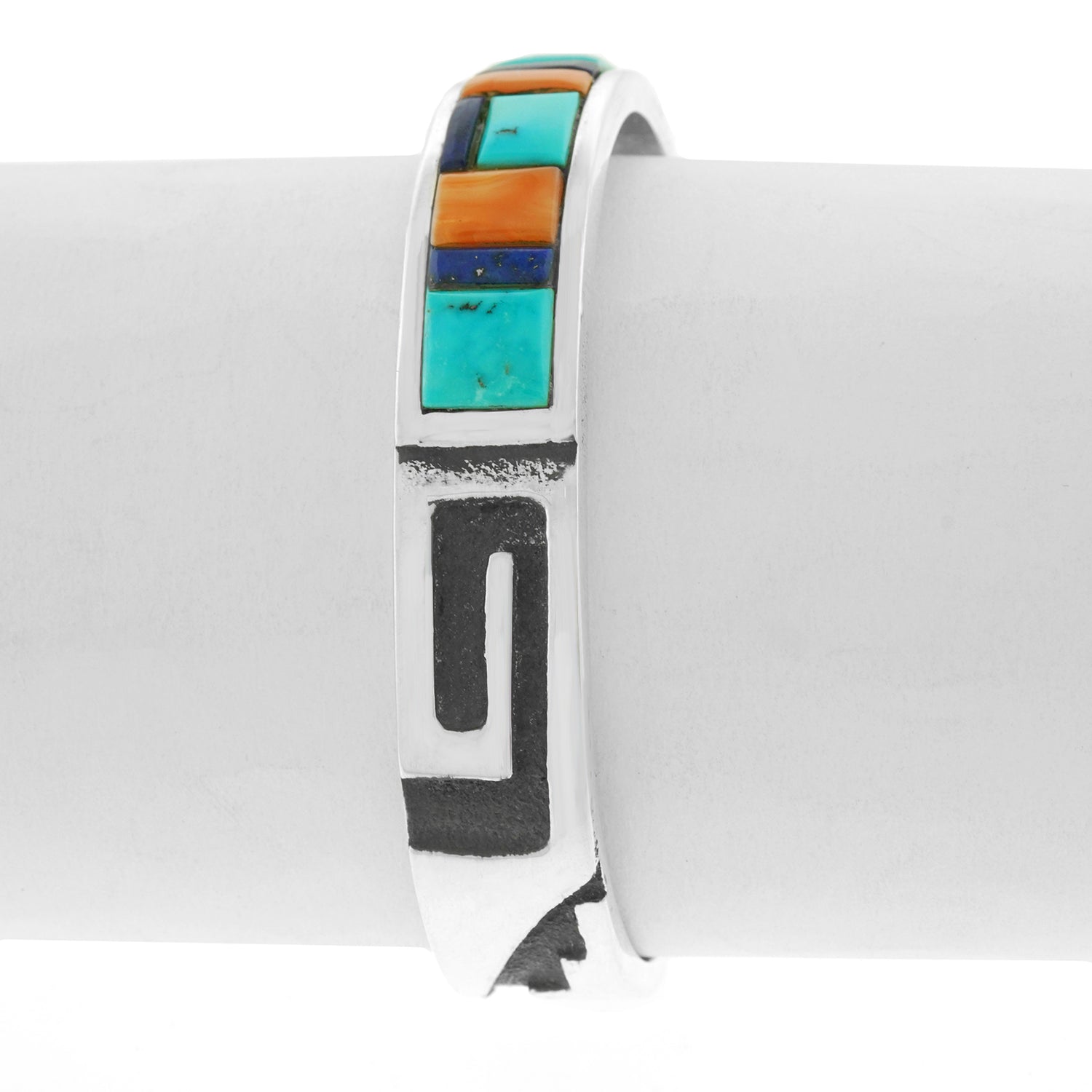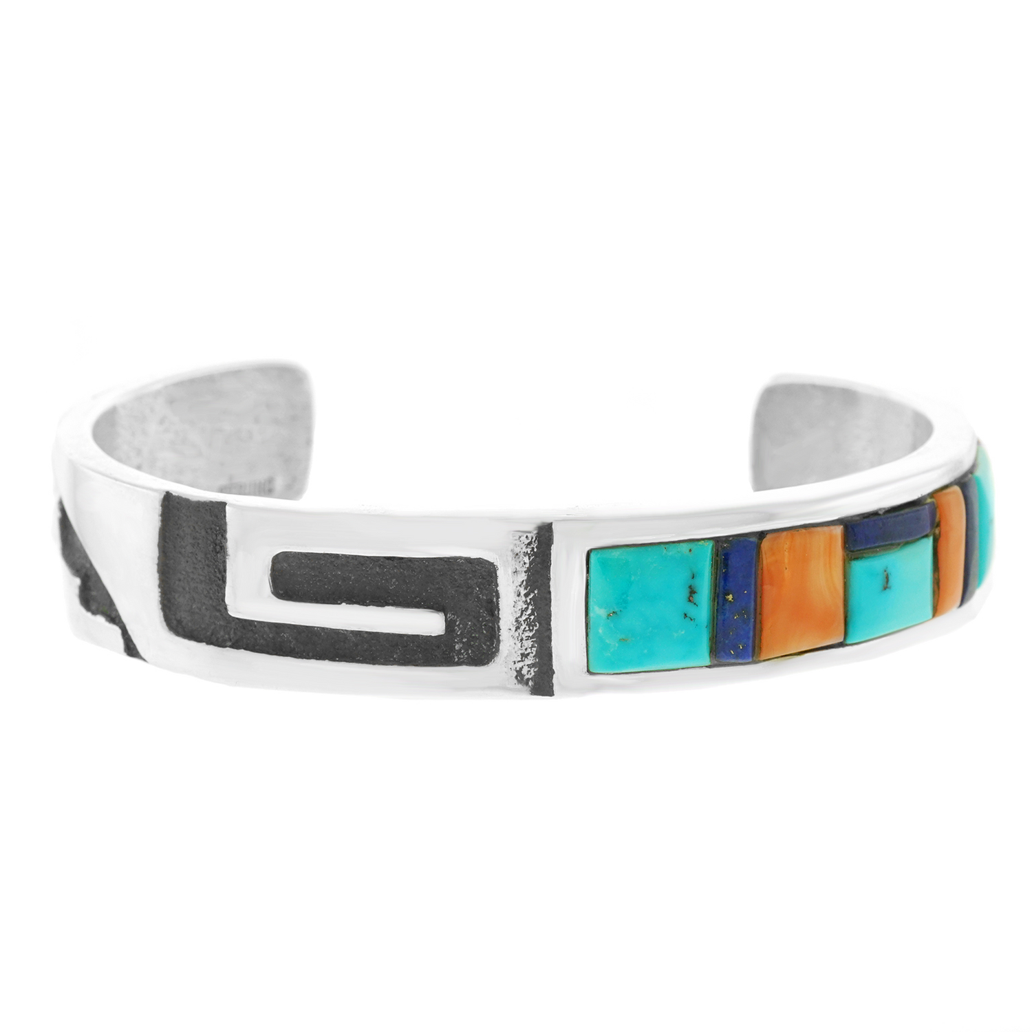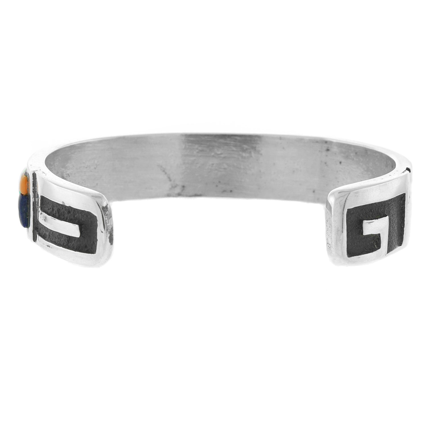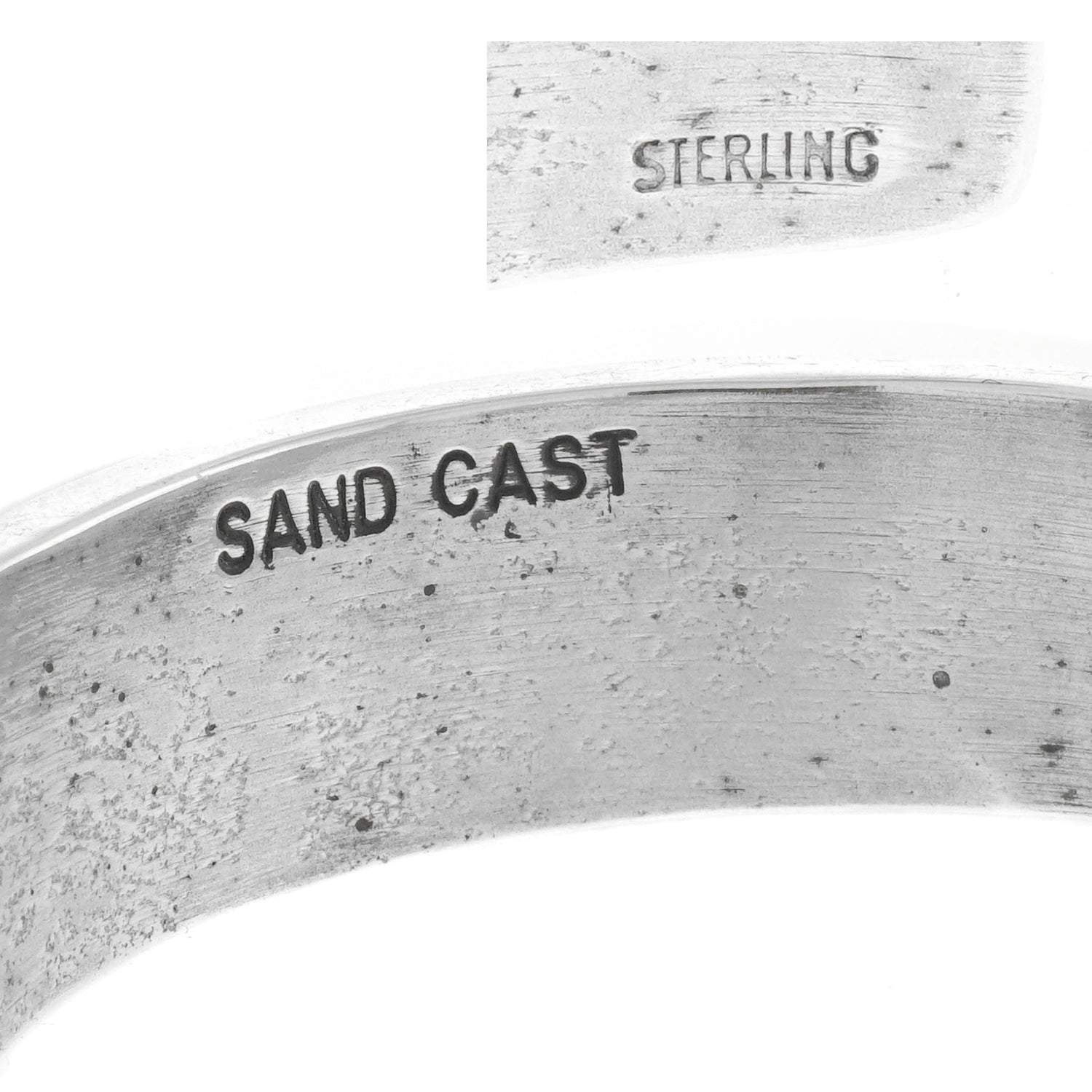 Circa 1980s, Sterling, Navajo, American. From Mondrian to Red Rock utopianist, compartmentalized Art finds its relevance. This chic bracelet is sand cast and also displays blackened motifs. Finely hand-fashioned, it is in excellent condition.