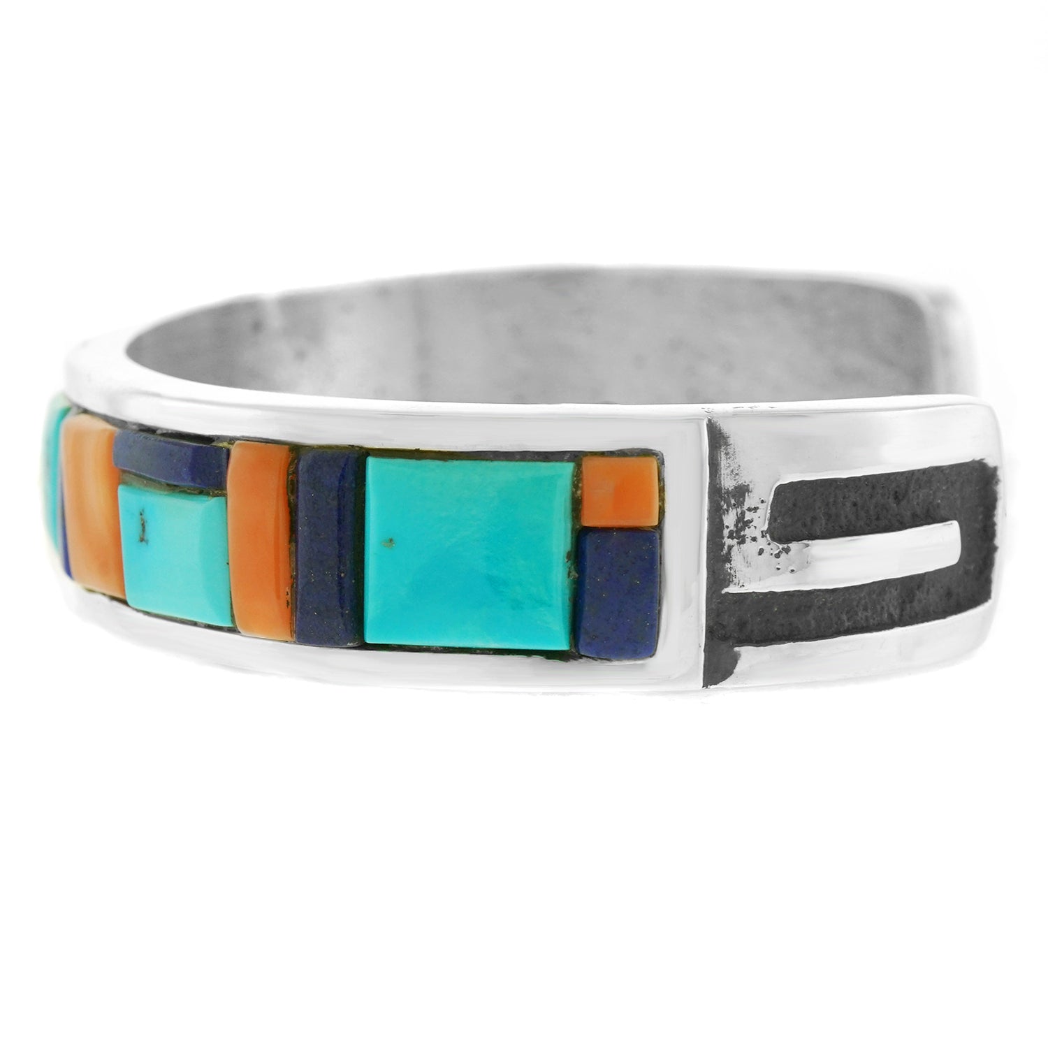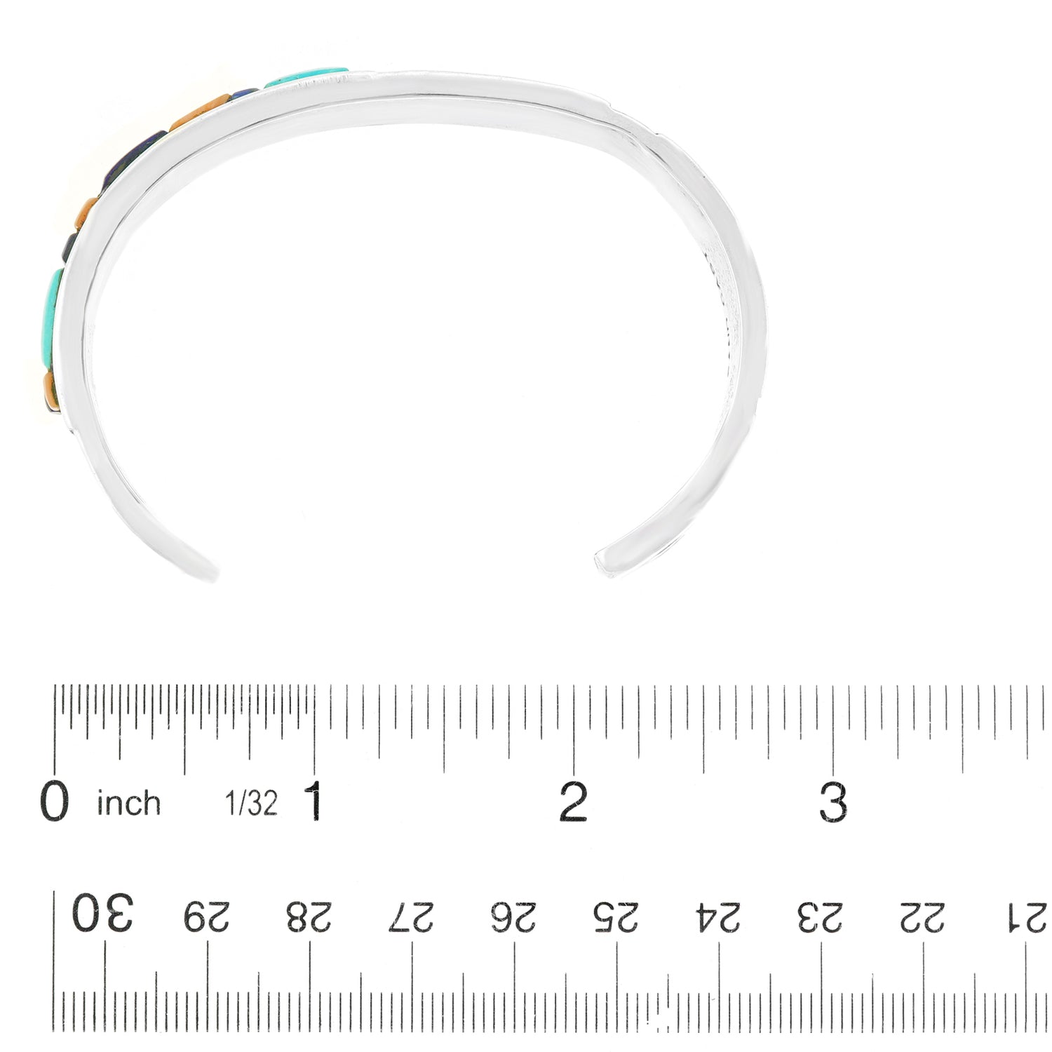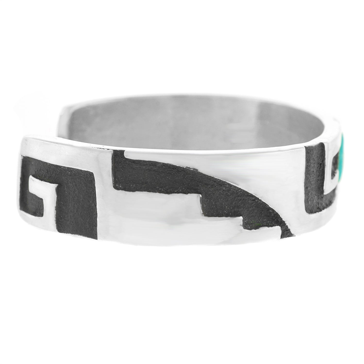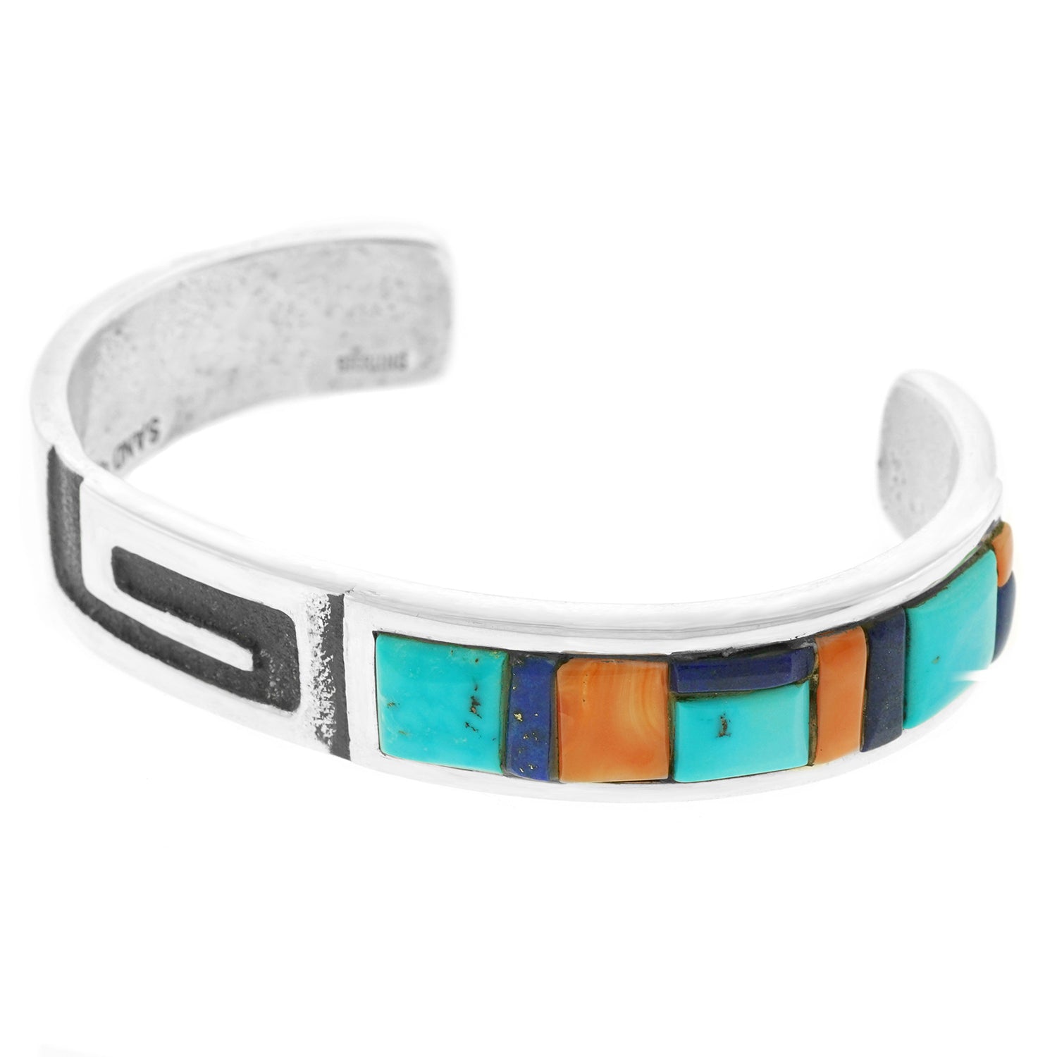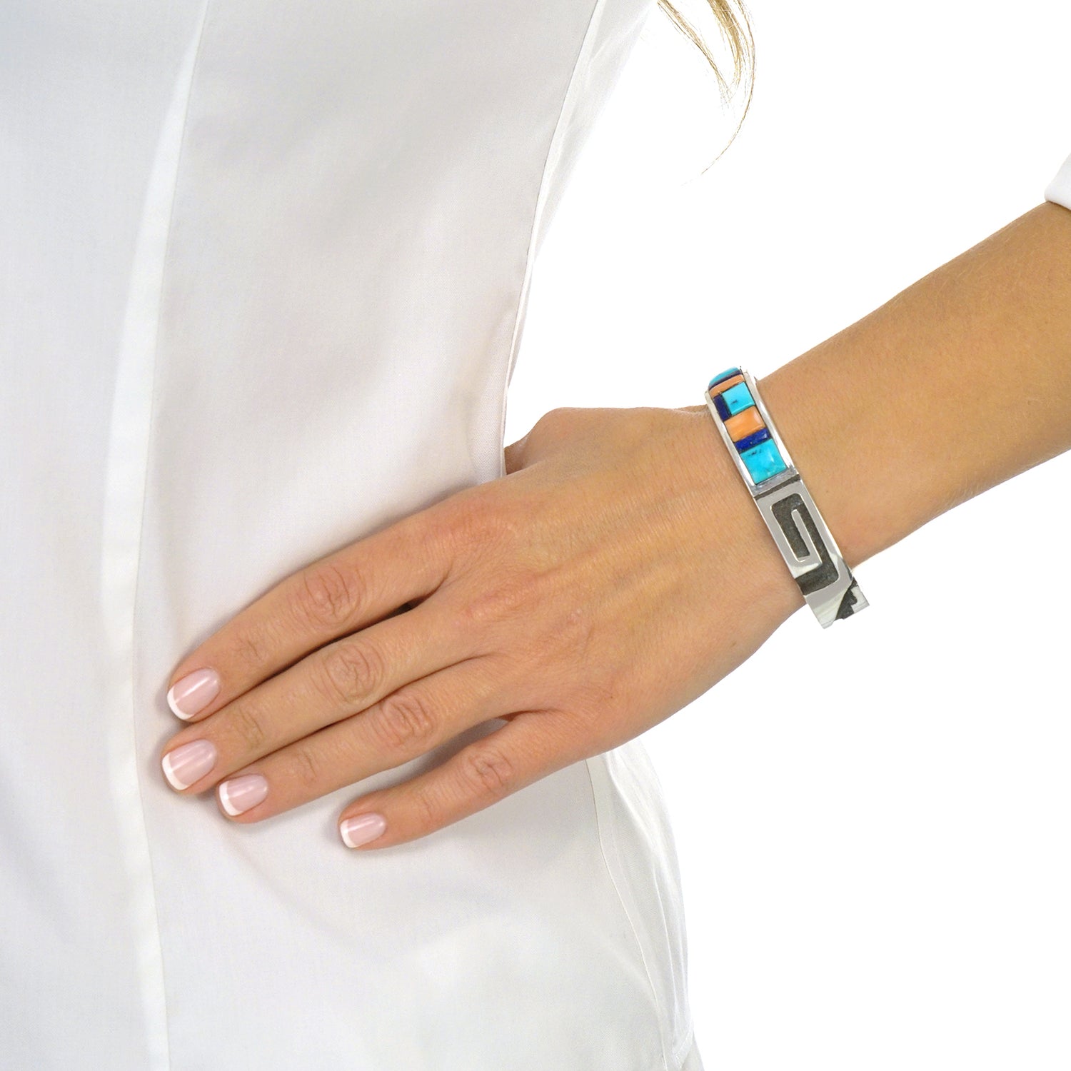 Circa 1980s, Sterling, Navajo, American. From Mondrian to Red Rock utopianist, compartmentalized Art finds its relevance. This chic bracelet is sand cast and also displays blackened motifs. Finely hand-fashioned, it is in excellent condition.