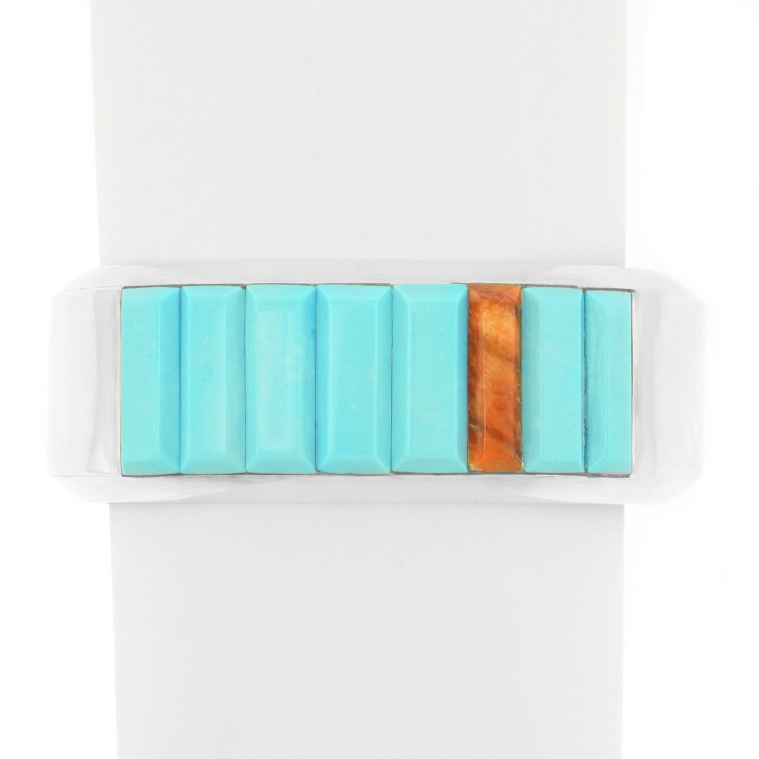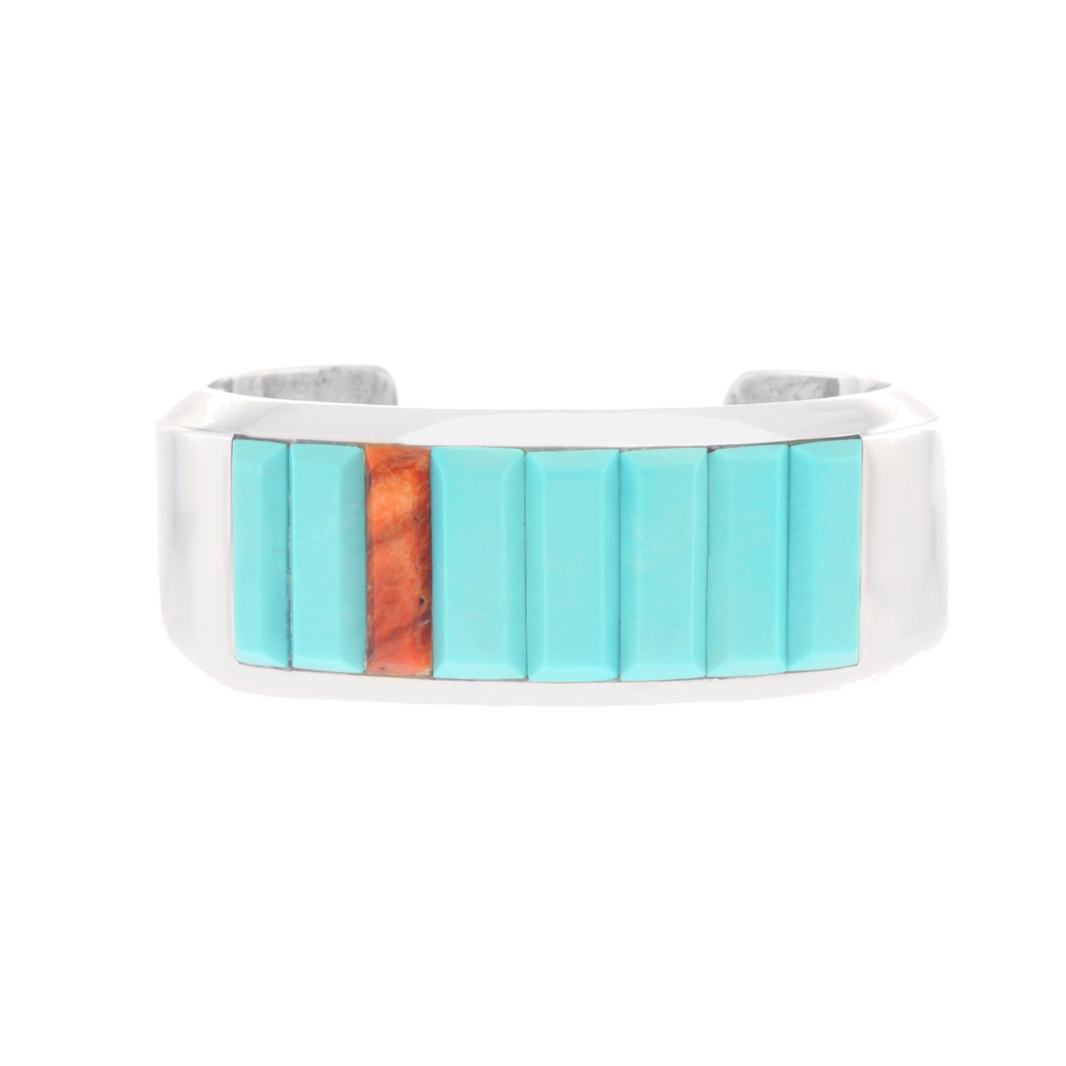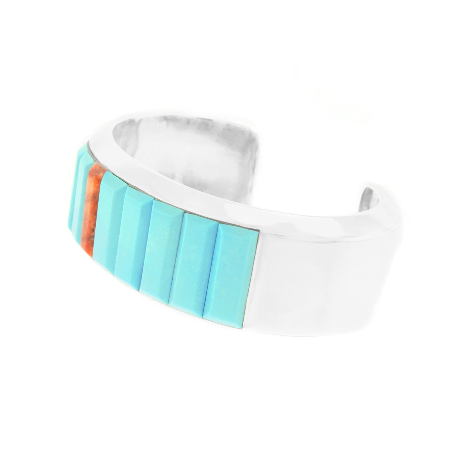 Circa 1980s, sterling, Navajo, American. Set with turquoise and spiny oyster in a cobblestone motif, this contemporary Navajo bracelet flawlessly blends modern design with Southwestern sensibilities. Hand-made and very heavy, is in excellent condition.