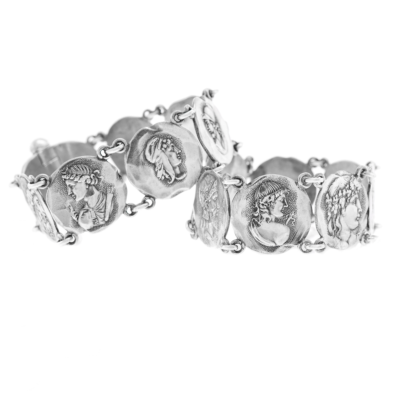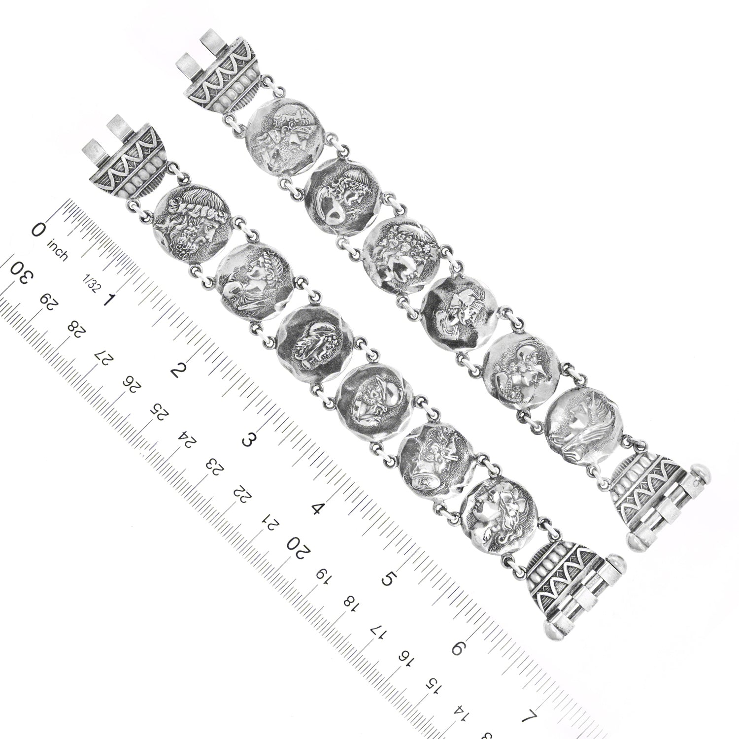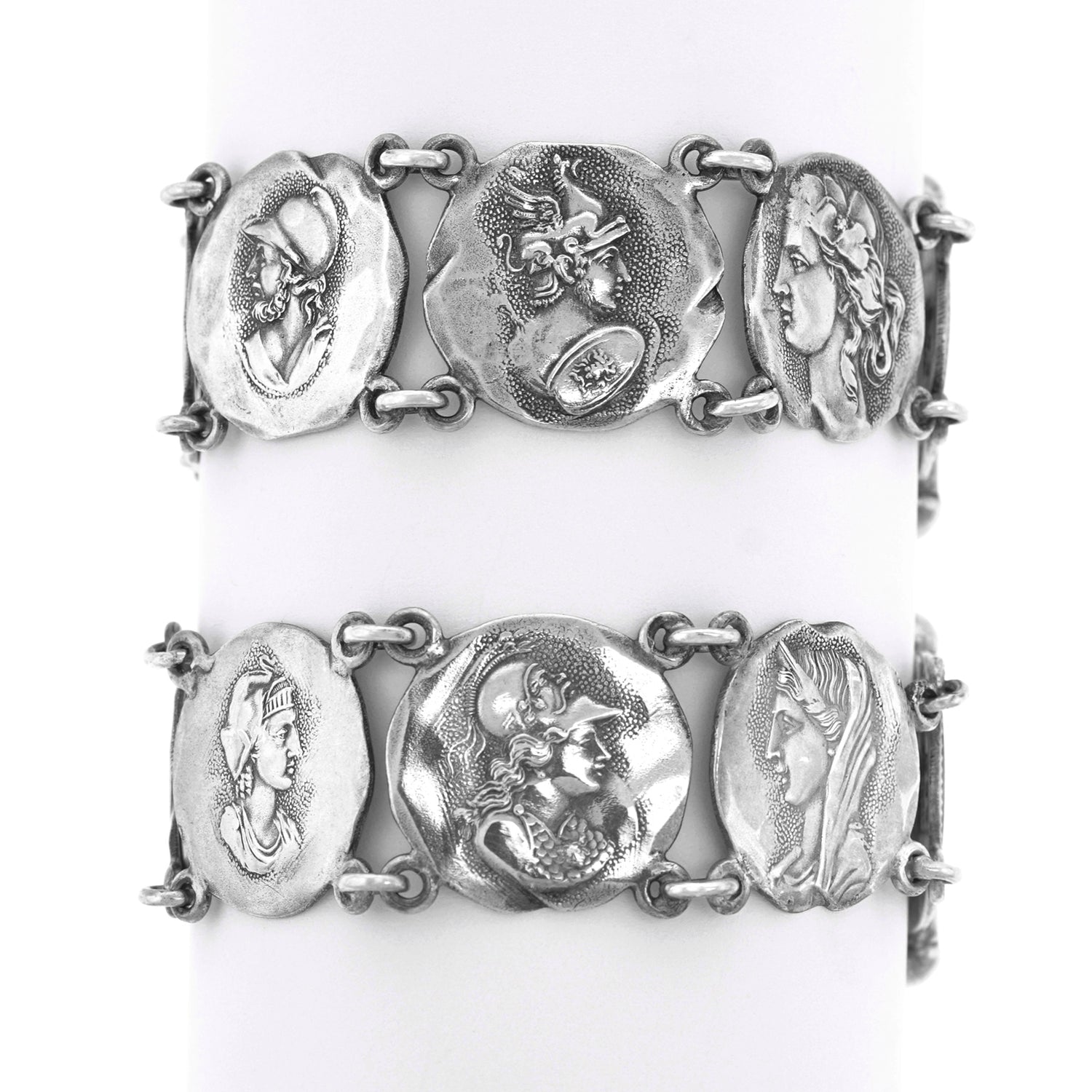 Circa 1880s, Sterling, by George W. Shiebler, American. This sublime pair of American sterling bracelets by Shiebler feature hand-struck neoclassical medallions in their iconic Homeric pattern. Arguably the finest American silver manufacturer of the 19th century, their medallion pieces were simply without peer. The look is au courant preceding the New and London neo-classical jewelry of Gage, Locke, and Seidengang by a century. Excellent condition.