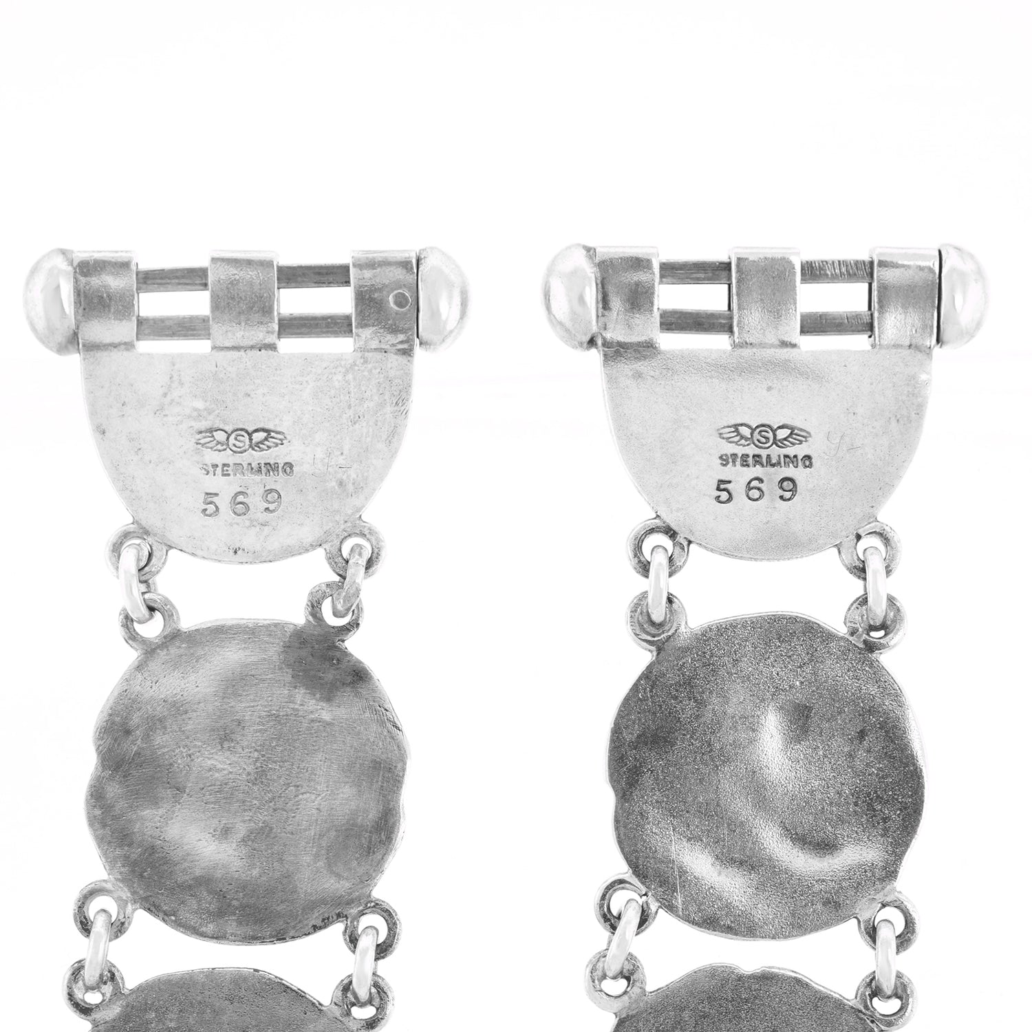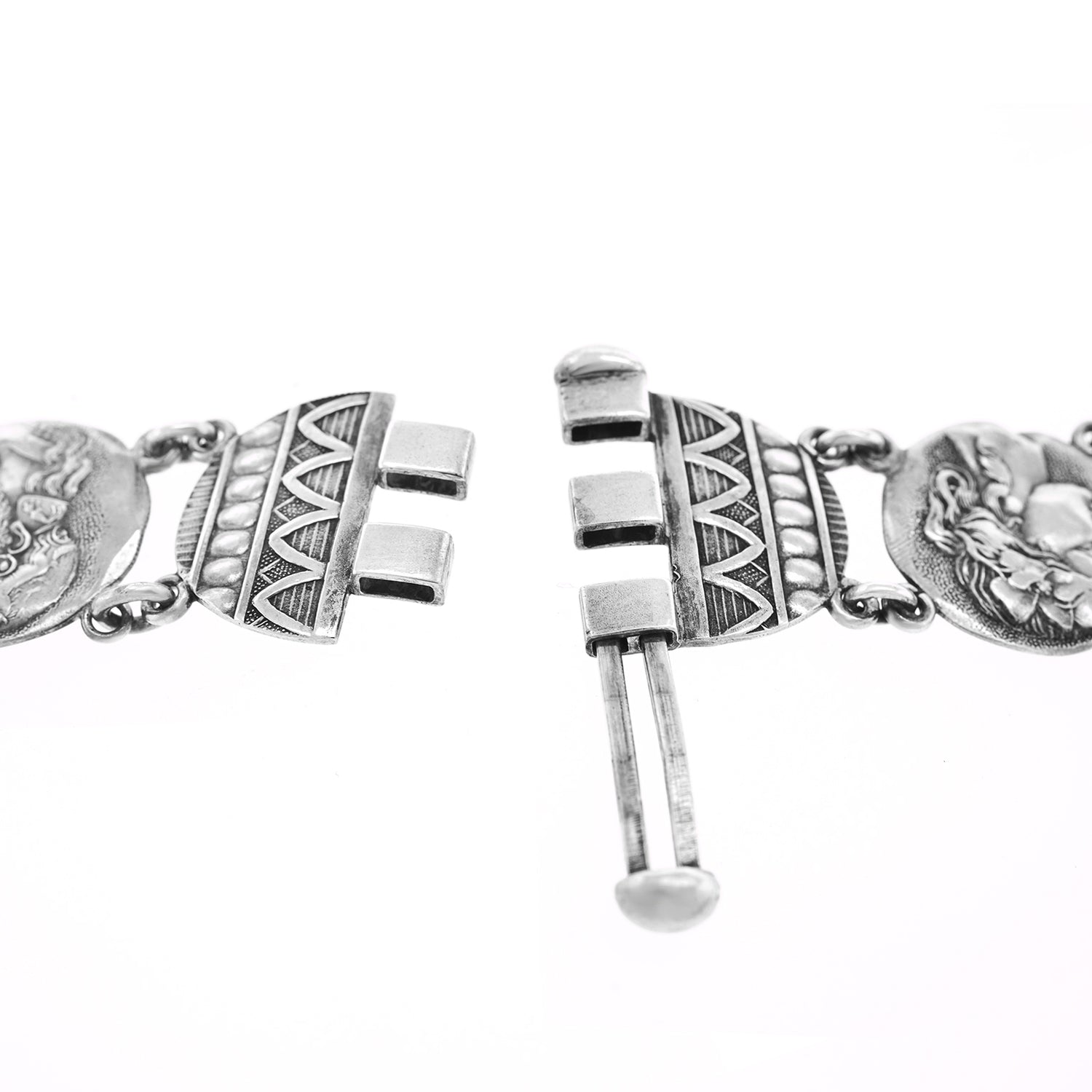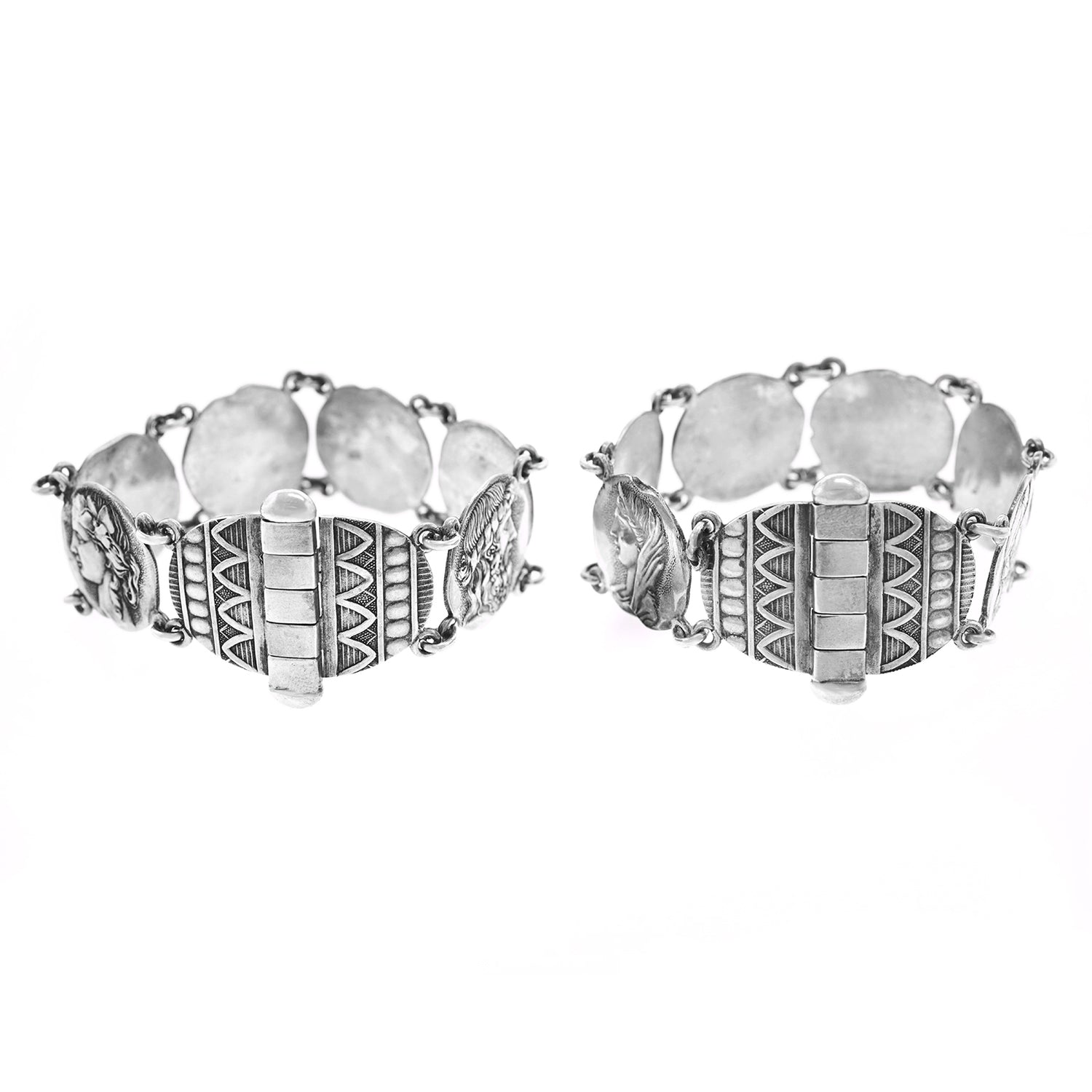 Circa 1880s, Sterling, by George W. Shiebler, American. This sublime pair of American sterling bracelets by Shiebler feature hand-struck neoclassical medallions in their iconic Homeric pattern. Arguably the finest American silver manufacturer of the 19th century, their medallion pieces were simply without peer. The look is au courant preceding the New and London neo-classical jewelry of Gage, Locke, and Seidengang by a century. Excellent condition.