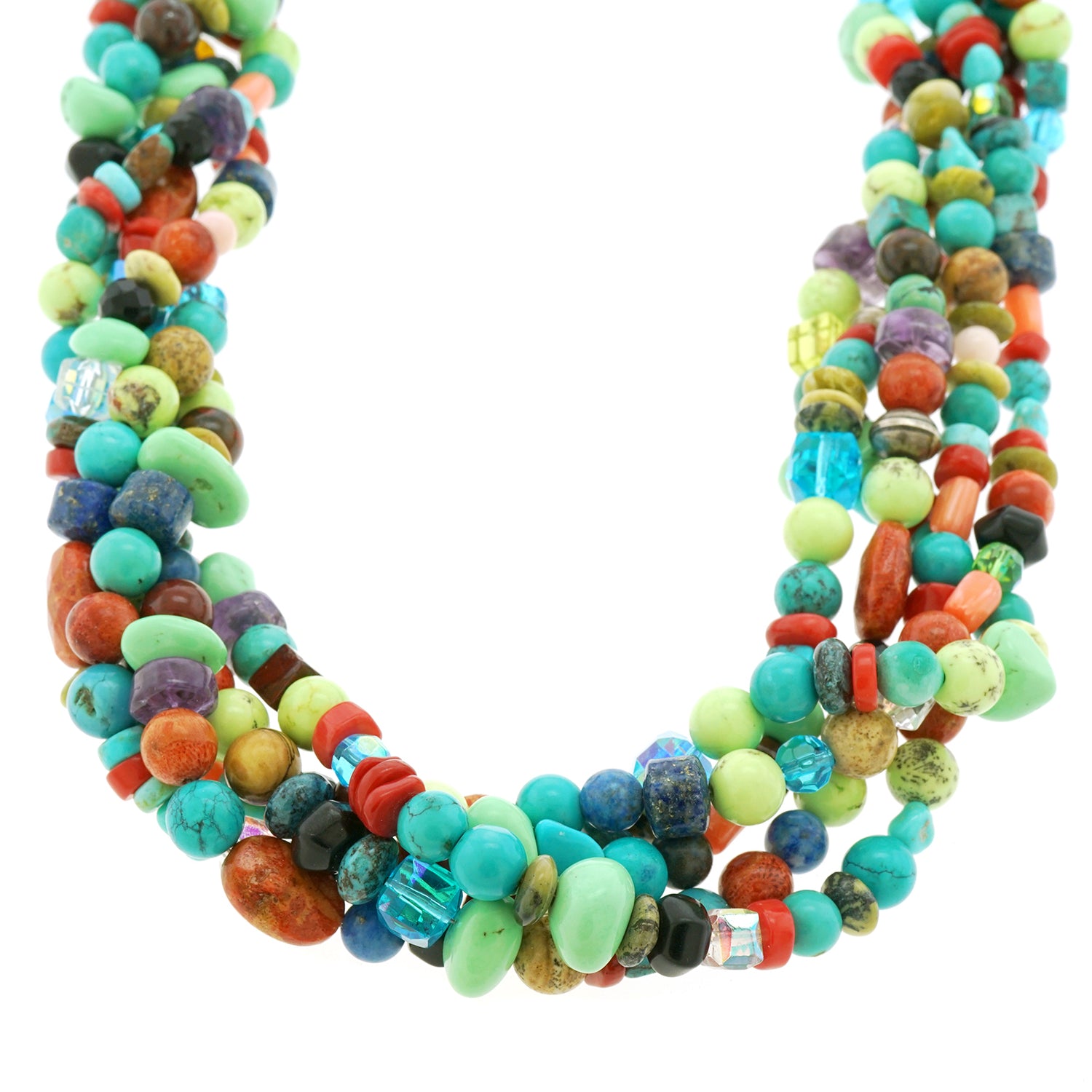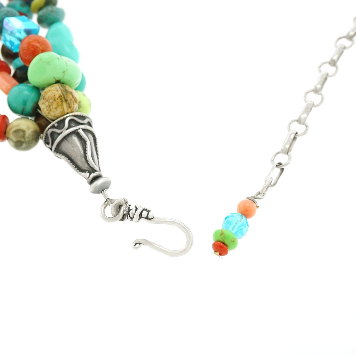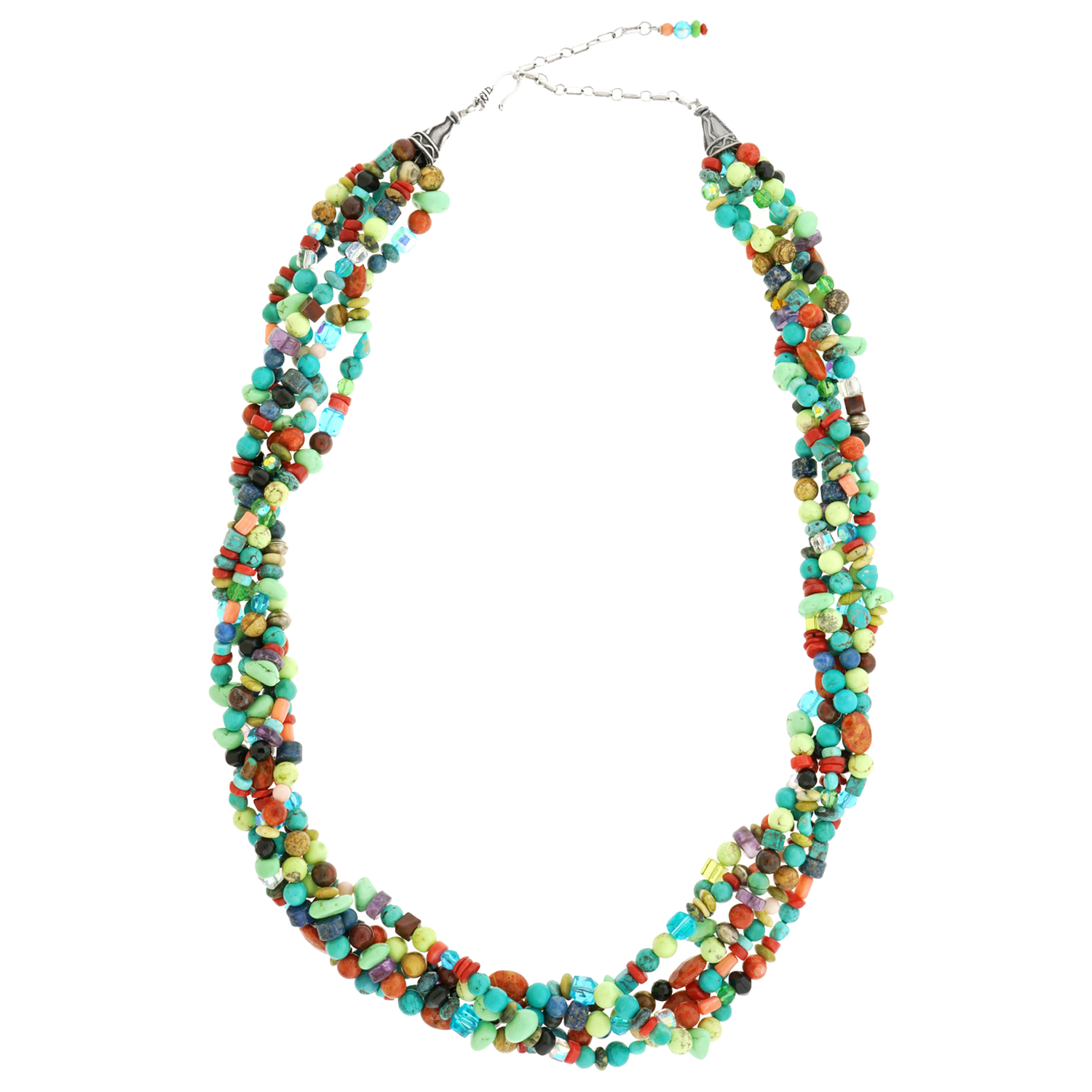 Circa 1990s, Sterling, by Don Lucas. Known for his one-of-a-kind pieces in the Southwestern style, Don Lucas pieces "bring a sense of uniqueness and style to any wardrobe. They quickly become go-to accessories." This necklace is particularly colorful and bold. Excellent condition.