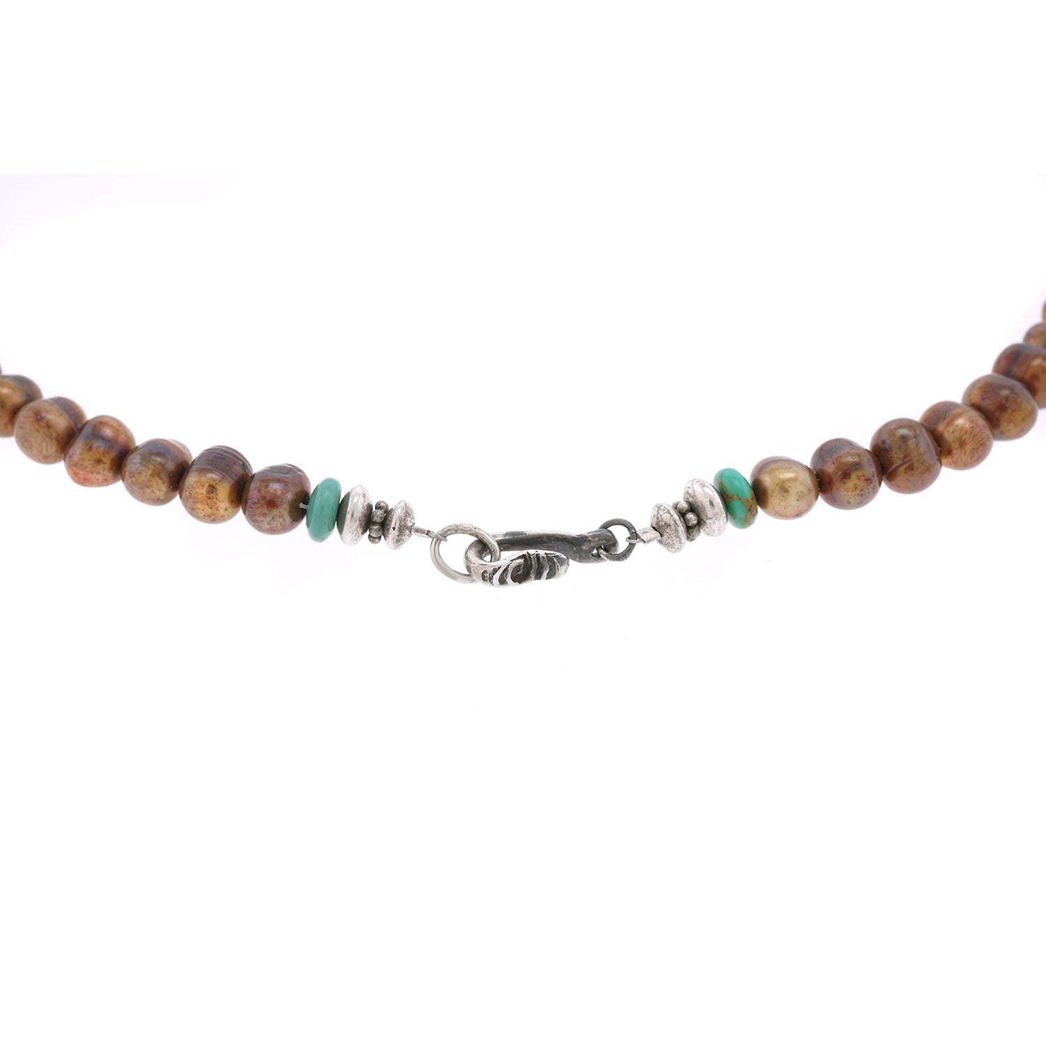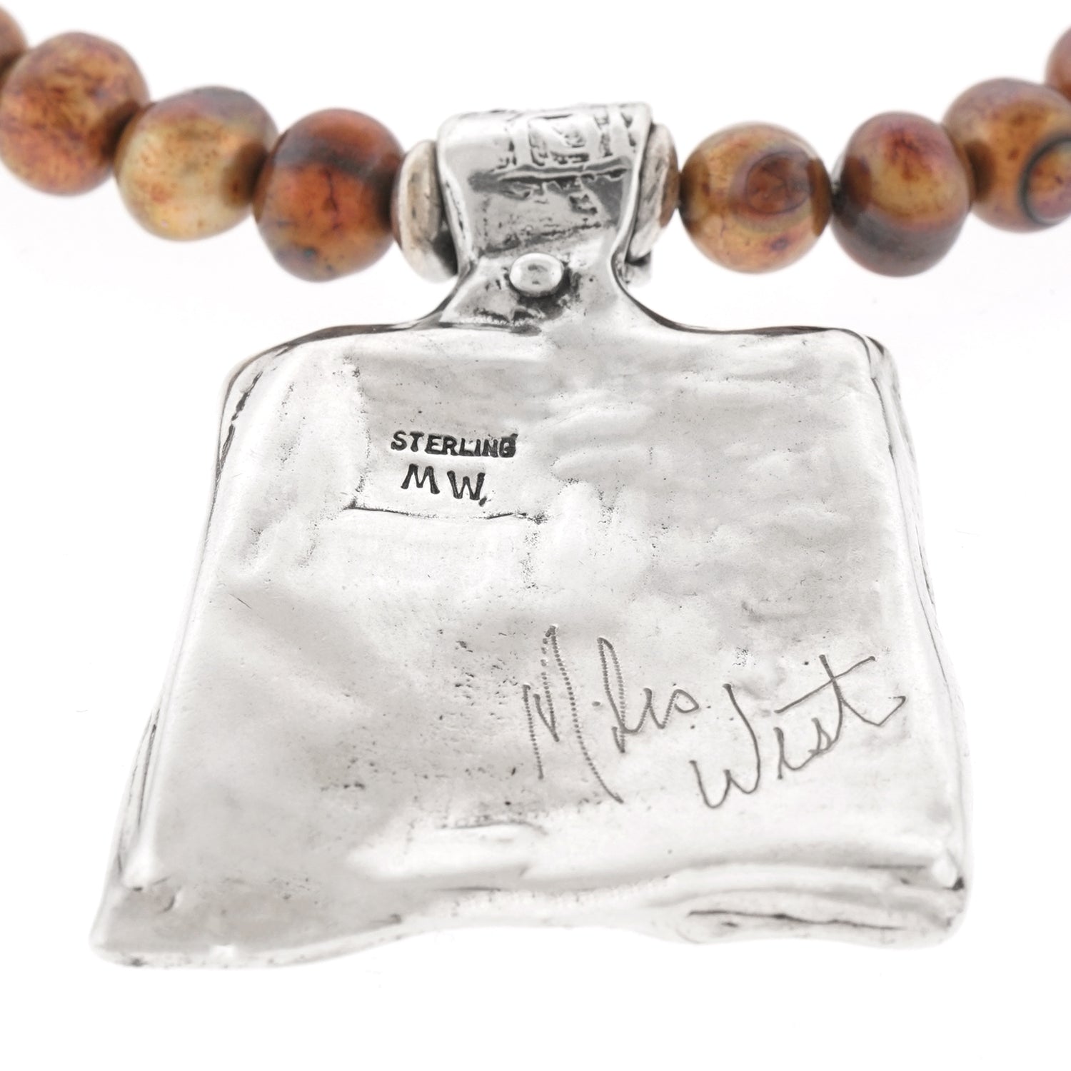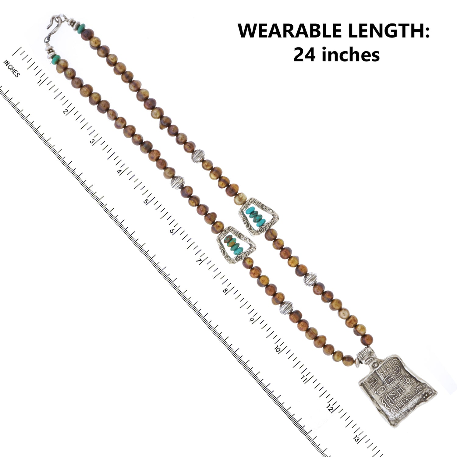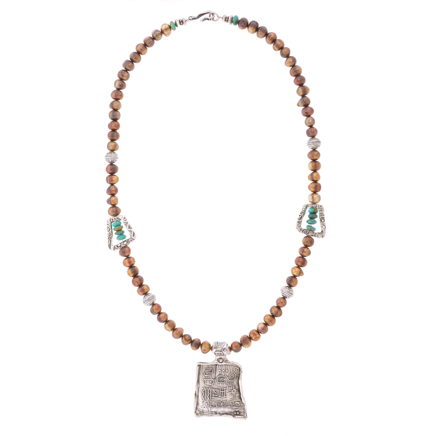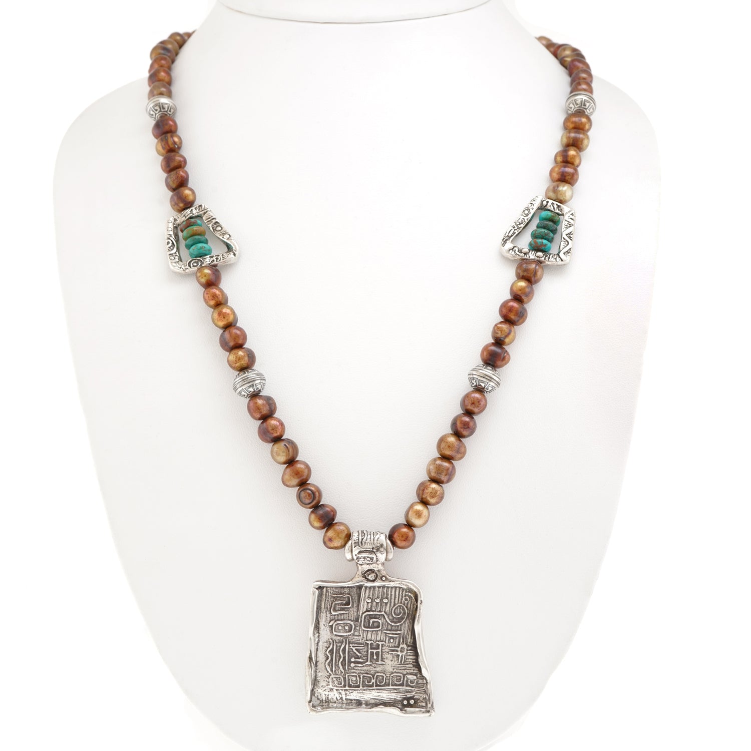 Circa 1990s, sterling, attributed Navajo, American. This wonderful necklace, with its mysterious glyphs, suggests the wearer is on a spiritual journey. The look is tribal chic, perfect for any casual look. Finely handmade, it is in excellent condition.