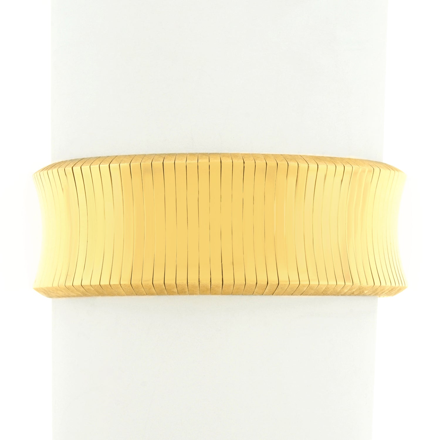 Circa 1930s, 18k, by Gubelin, Swiss. Gubelin jewelry has a tasteful edge that is great fashion. This bracelet has a shiny, fluid, late Deco look that is visually powerful and effortlessly elegant. Superbly fabricated and very heavy, it is comfortable on. Excellent condition.
