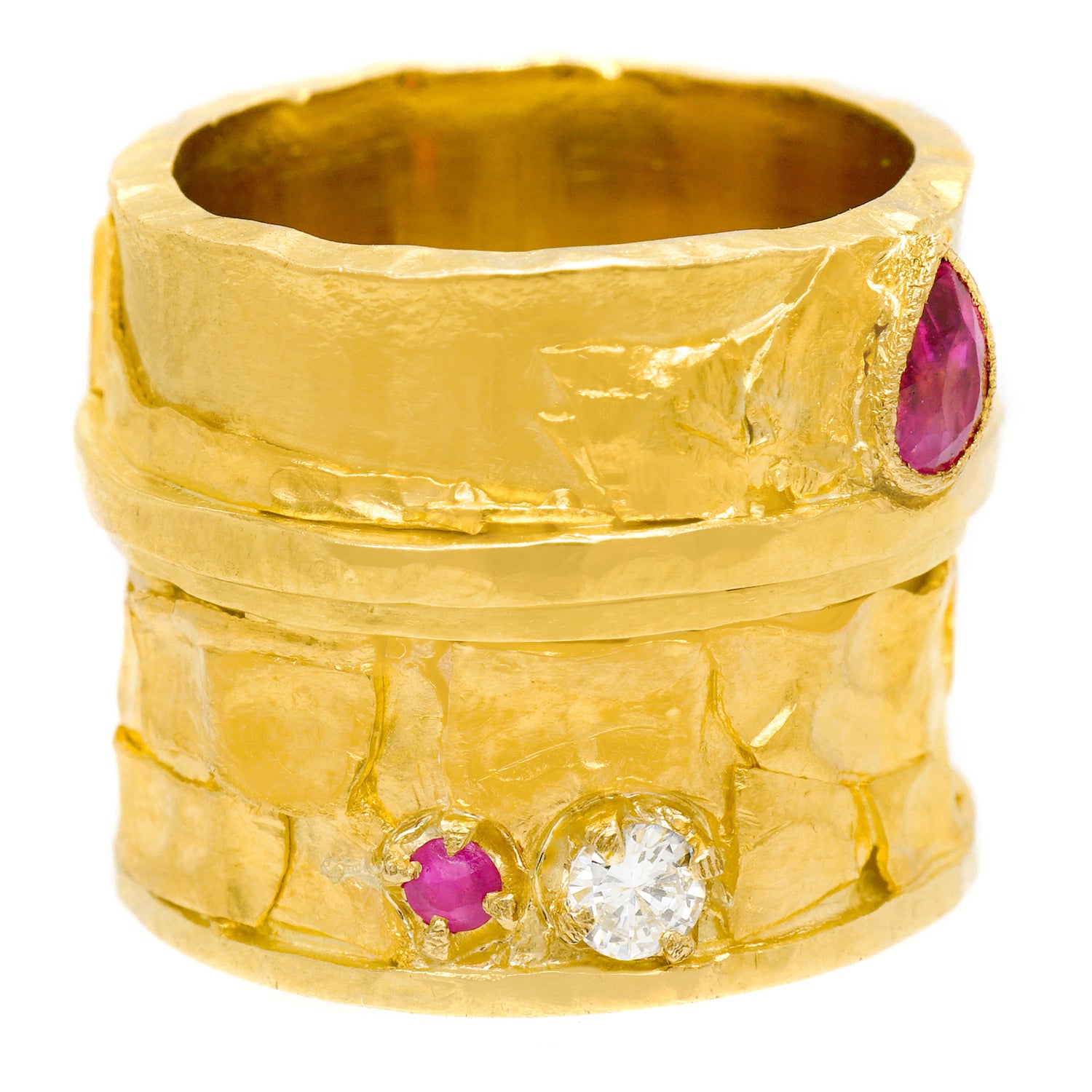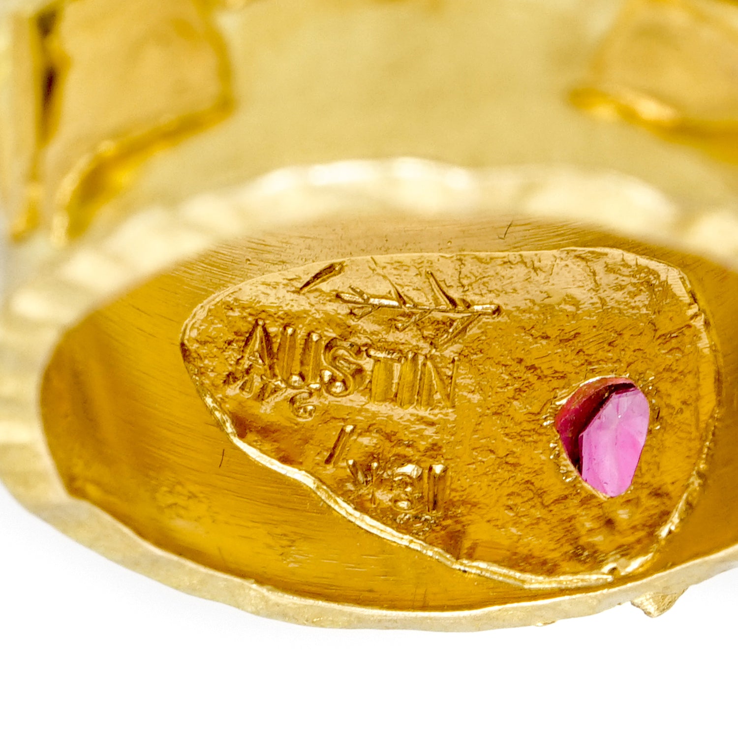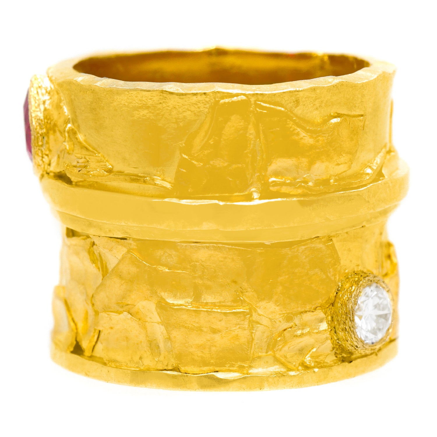 Circa 1980s, 18k / 22k, signed Austin, American. A brilliant landscape of textures, shapes, and colors of gold, this organo chic eighties ring is a hand-made one-of-a-kind. Used by a professor of goldsmithing at The School of the Museum of Fine Arts (Boston) as an example of superb gold work, the look is contemporary design at its Post-Modern organic motif chic. Found in unworn condition, it is set with .33 carats of ruby and .26 carats of fine white diamonds. Excellent condition.