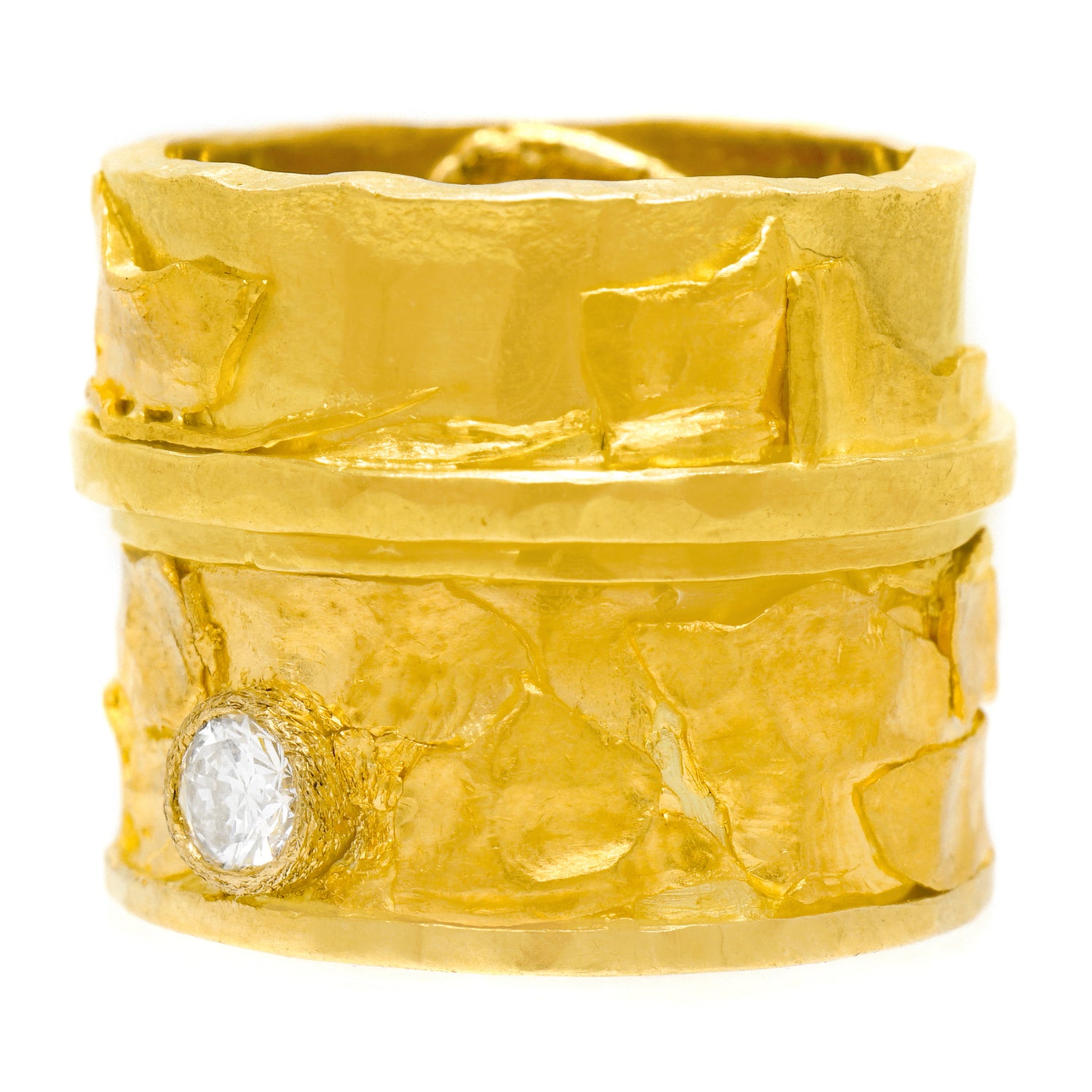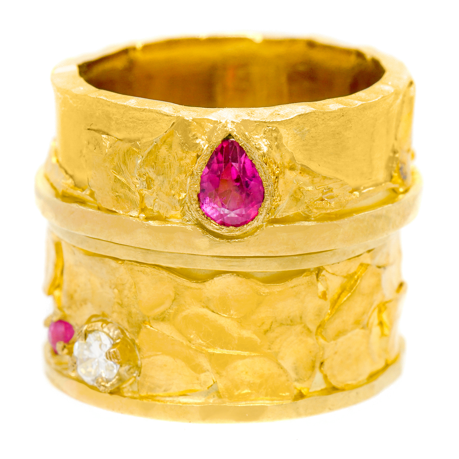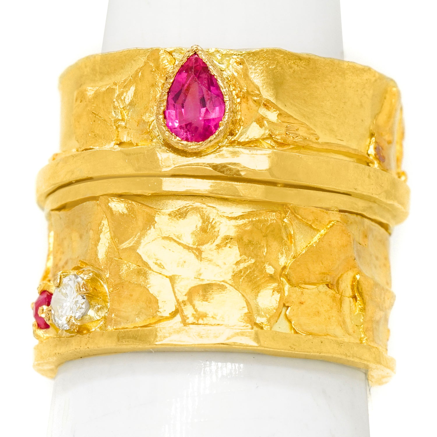 Circa 1980s, 18k / 22k, signed Austin, American. A brilliant landscape of textures, shapes, and colors of gold, this organo chic eighties ring is a hand-made one-of-a-kind. Used by a professor of goldsmithing at The School of the Museum of Fine Arts (Boston) as an example of superb gold work, the look is contemporary design at its Post-Modern organic motif chic. Found in unworn condition, it is set with .33 carats of ruby and .26 carats of fine white diamonds. Excellent condition.