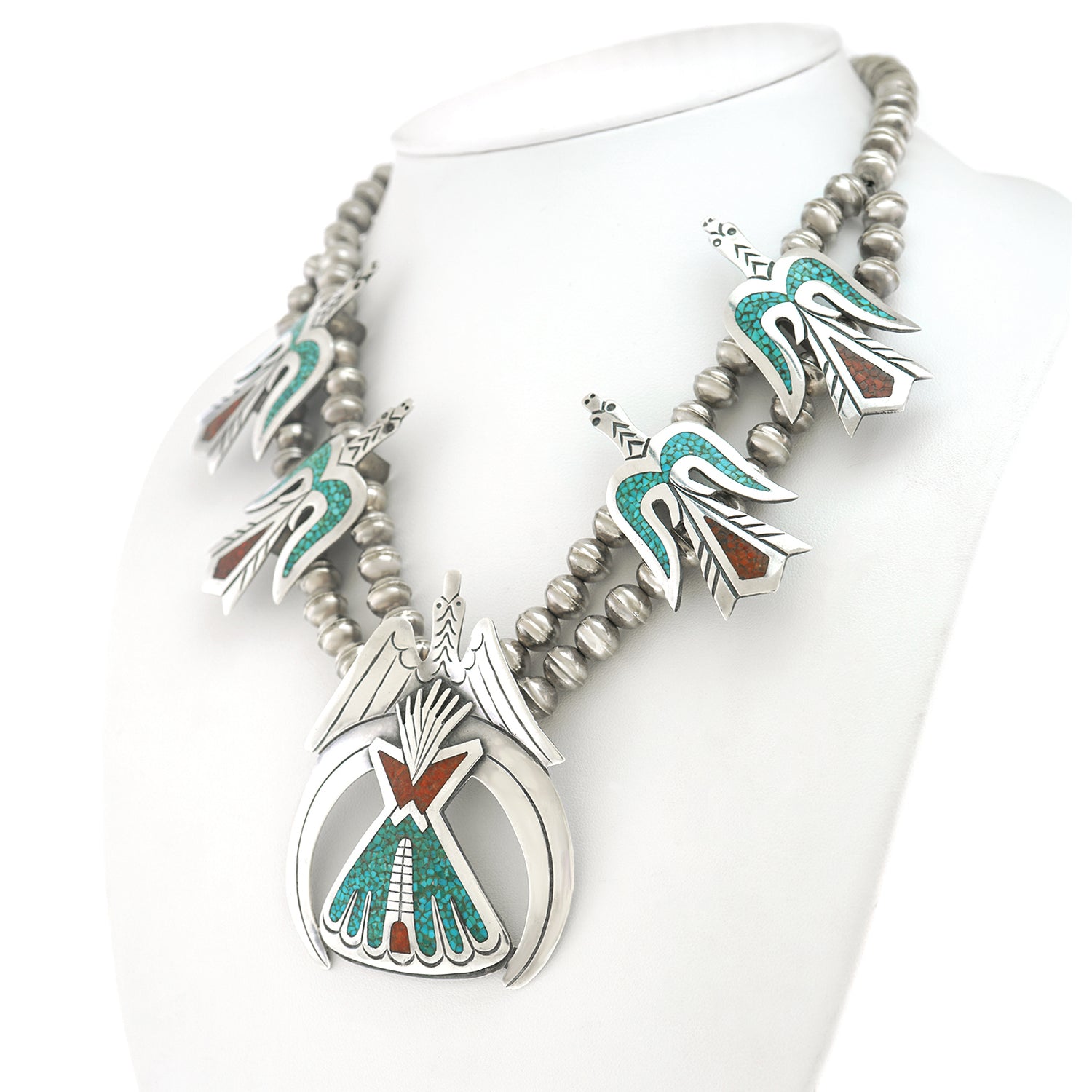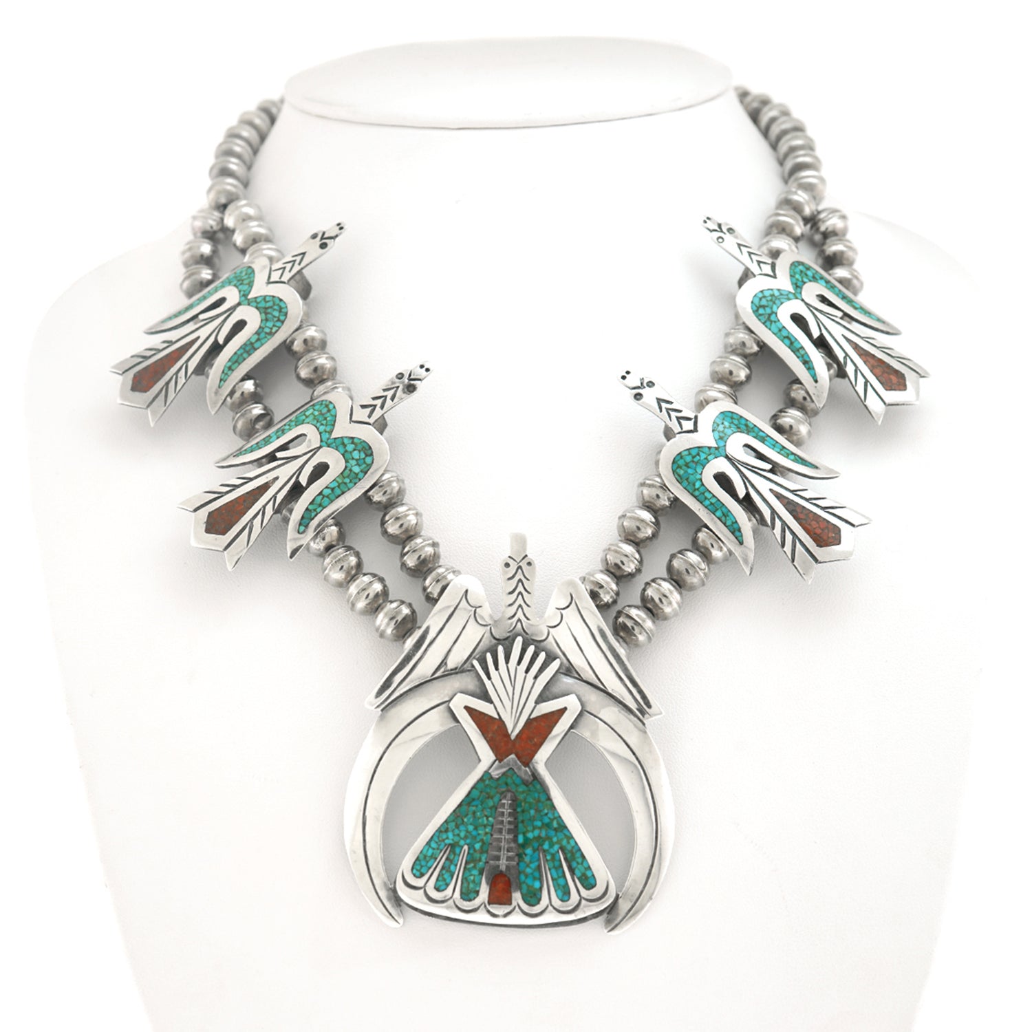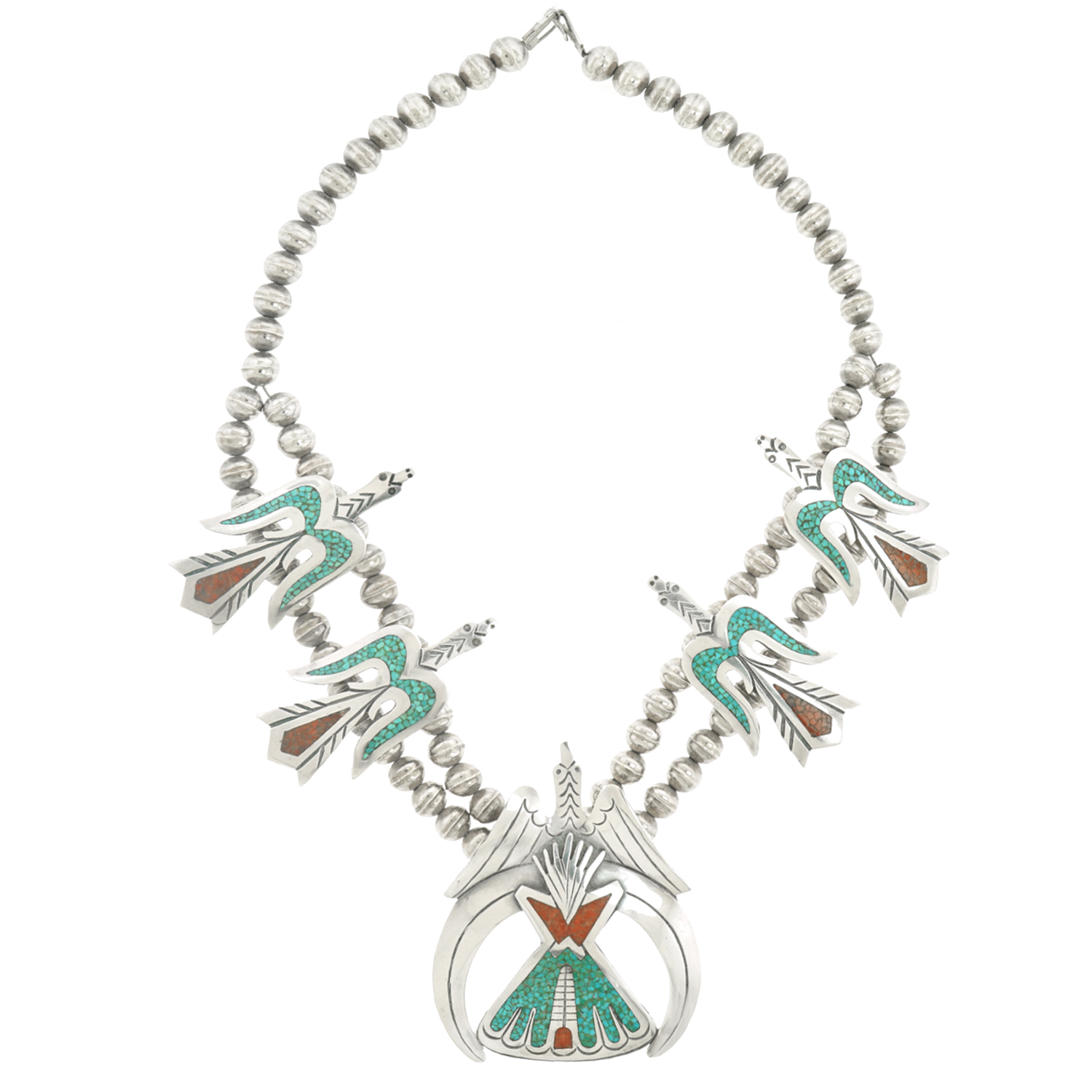Circa 1960s, Sterling, by Tommy Singer, Navajo, American. Suggestive of a squash blossom necklace, Tommy Singer chose waterbirds (or peyote birds) for a fabulous visually fluid and colorful look. Set with inlaid turquoise and red coral, the workmanship is superb. Excellent condition.