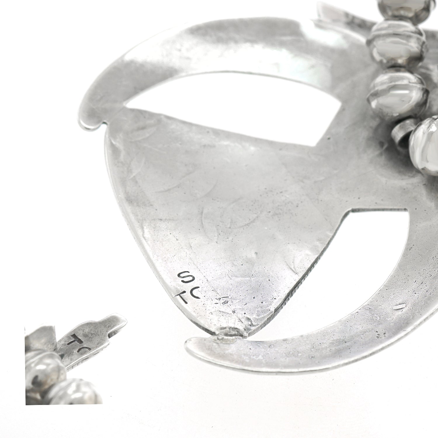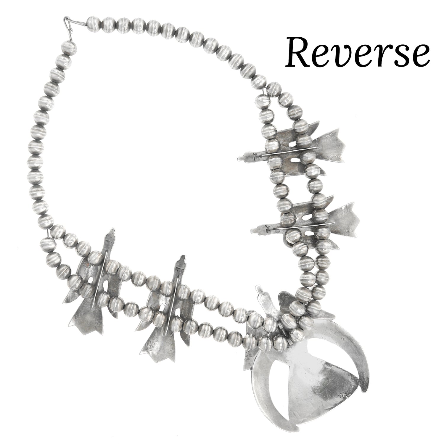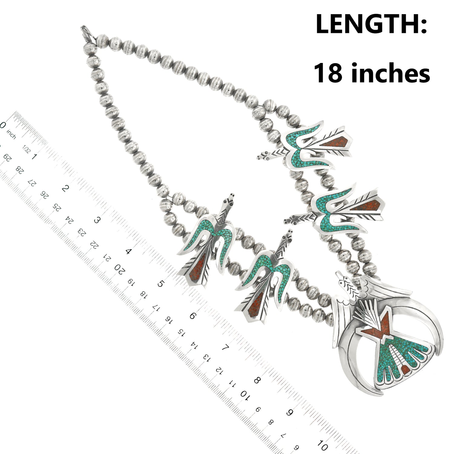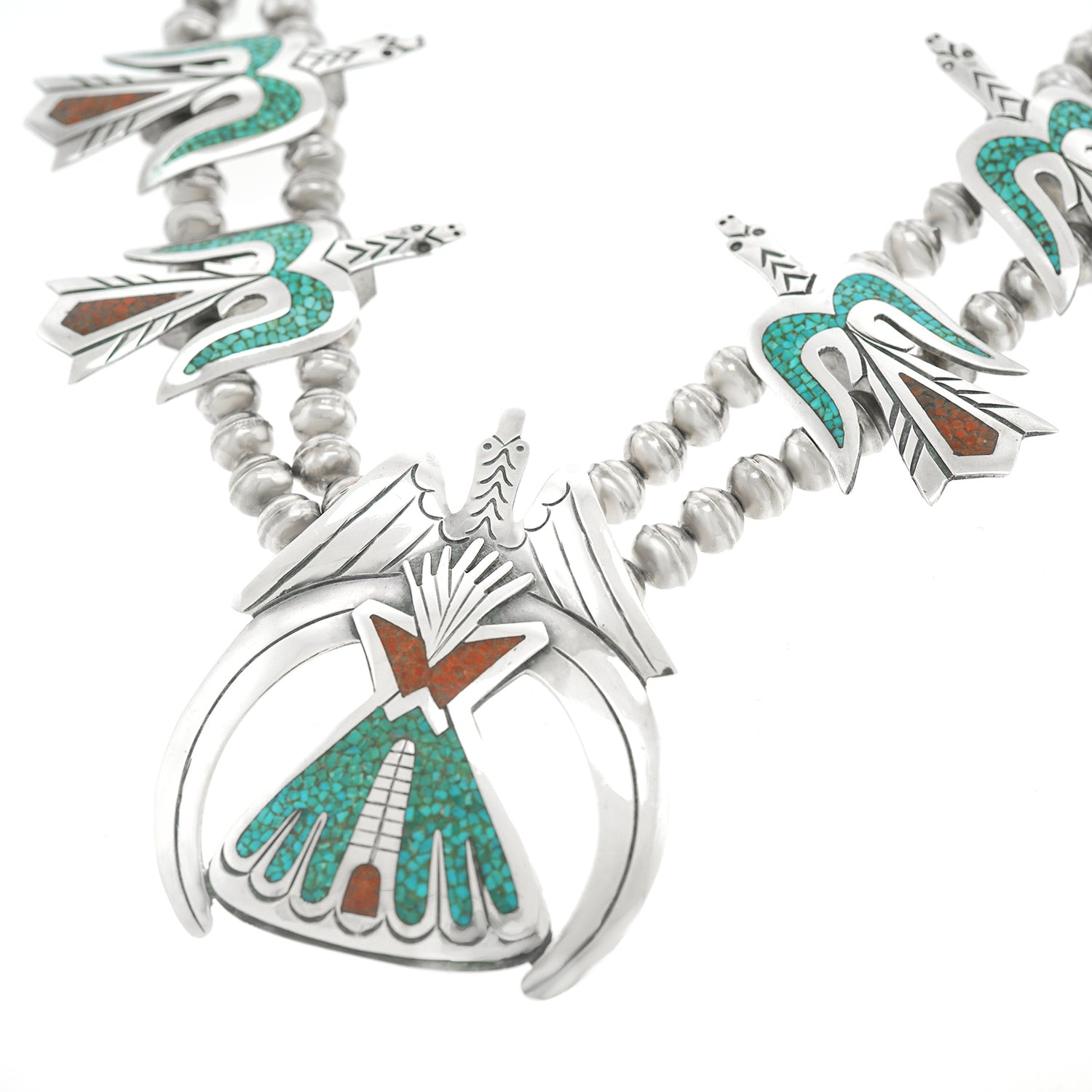 Circa 1960s, Sterling, by Tommy Singer, Navajo, American. Suggestive of a squash blossom necklace, Tommy Singer chose waterbirds (or peyote birds) for a fabulous visually fluid and colorful look. Set with inlaid turquoise and red coral, the workmanship is superb. Excellent condition.