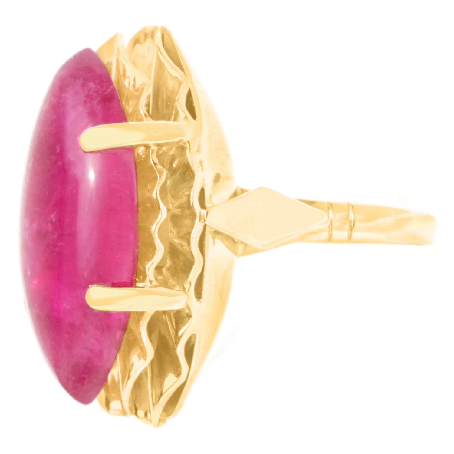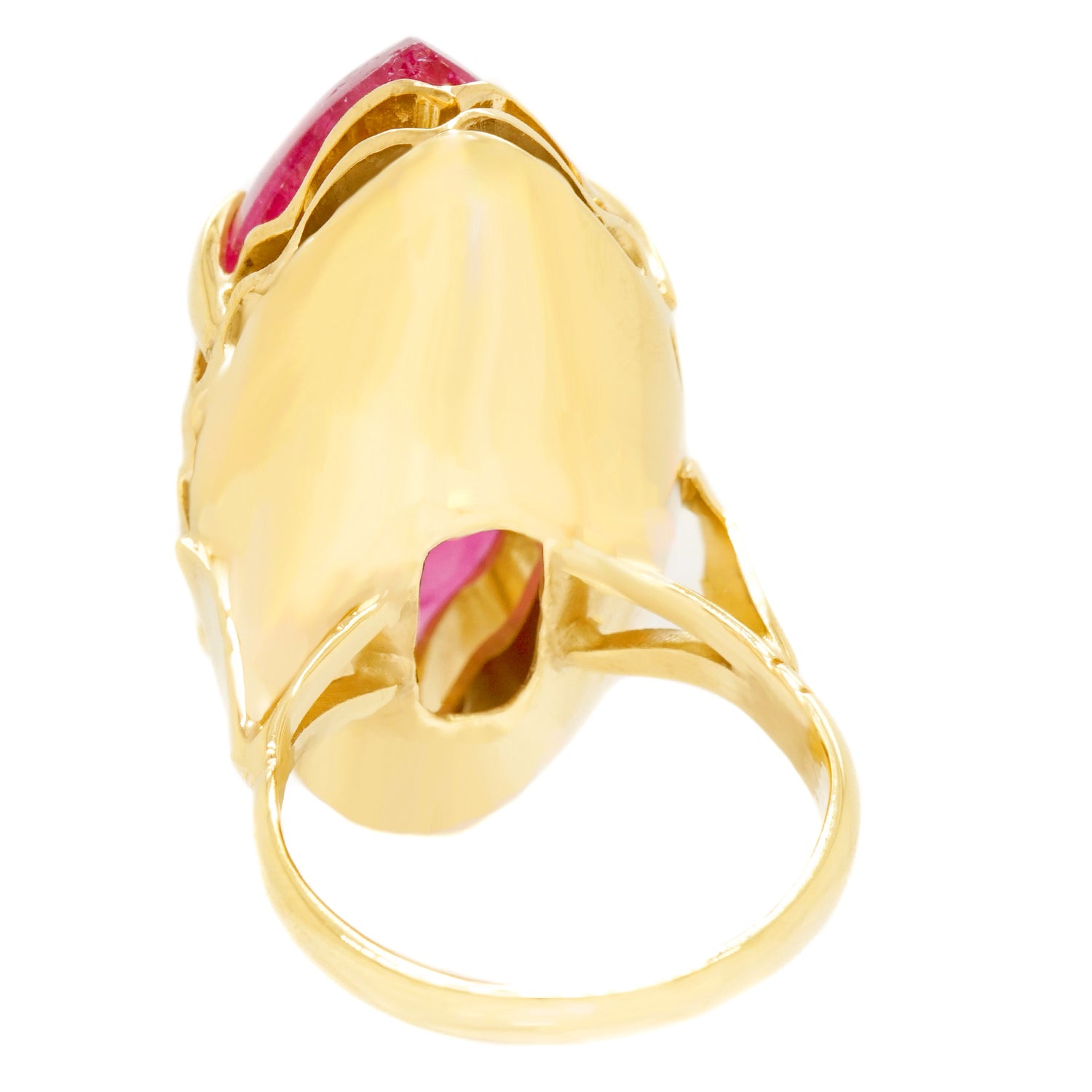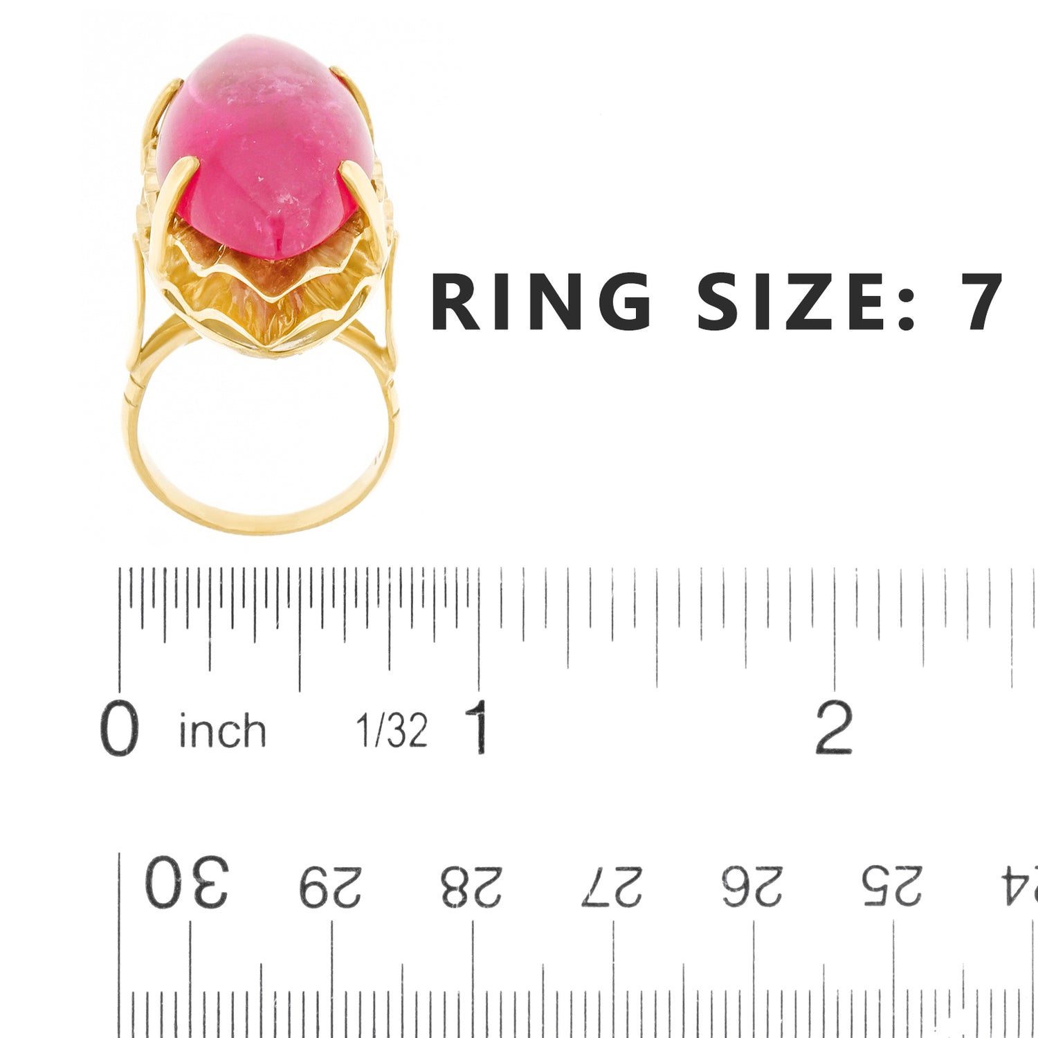 Circa 1950s, 14k, American. Big color, big look …the gorgeously hued pink-red tourmaline sets the stage, and the gold work featuring three layers of ruffles completes the visual narrative. The style is over-the-top American glamour. Finely fashioned, it is in excellent condition.